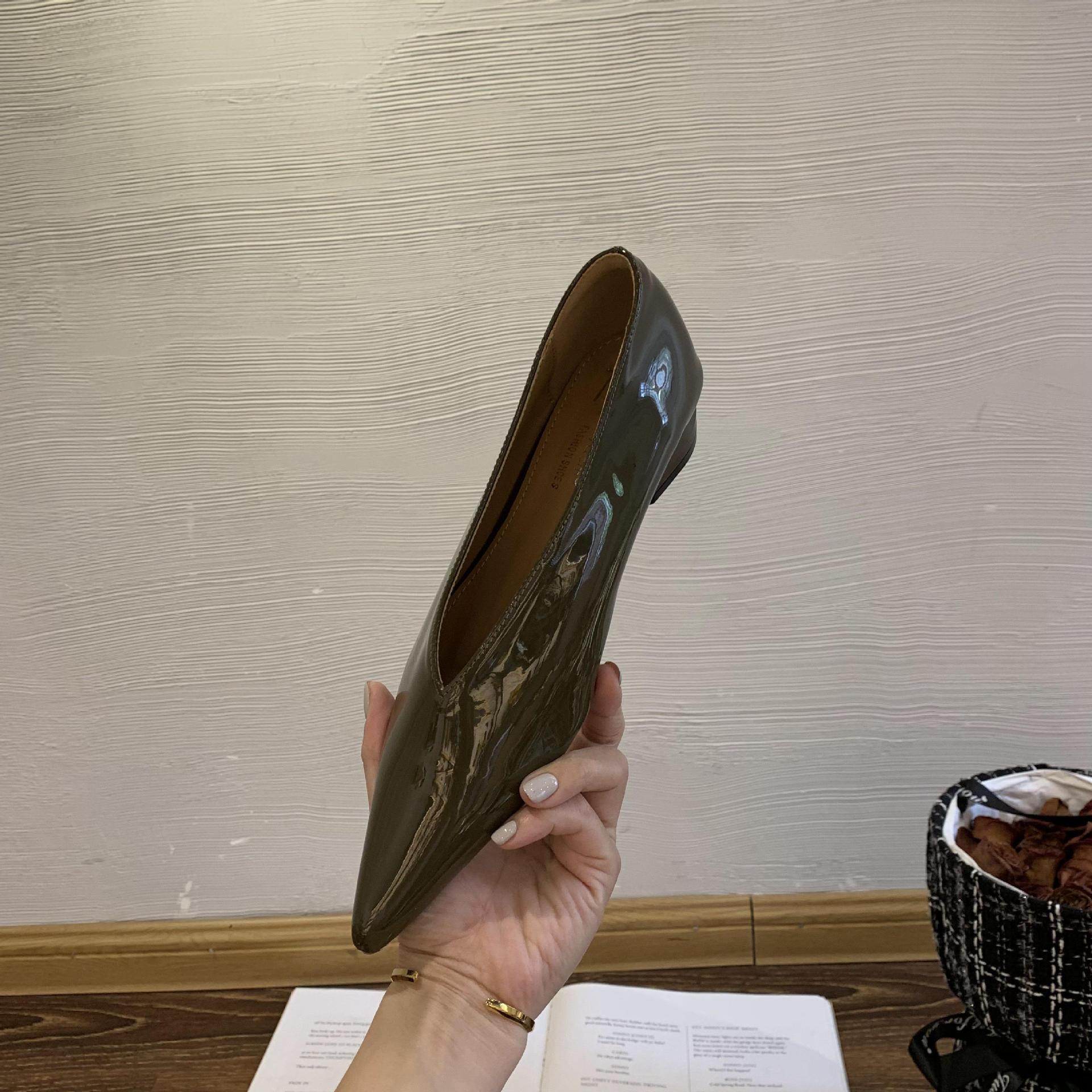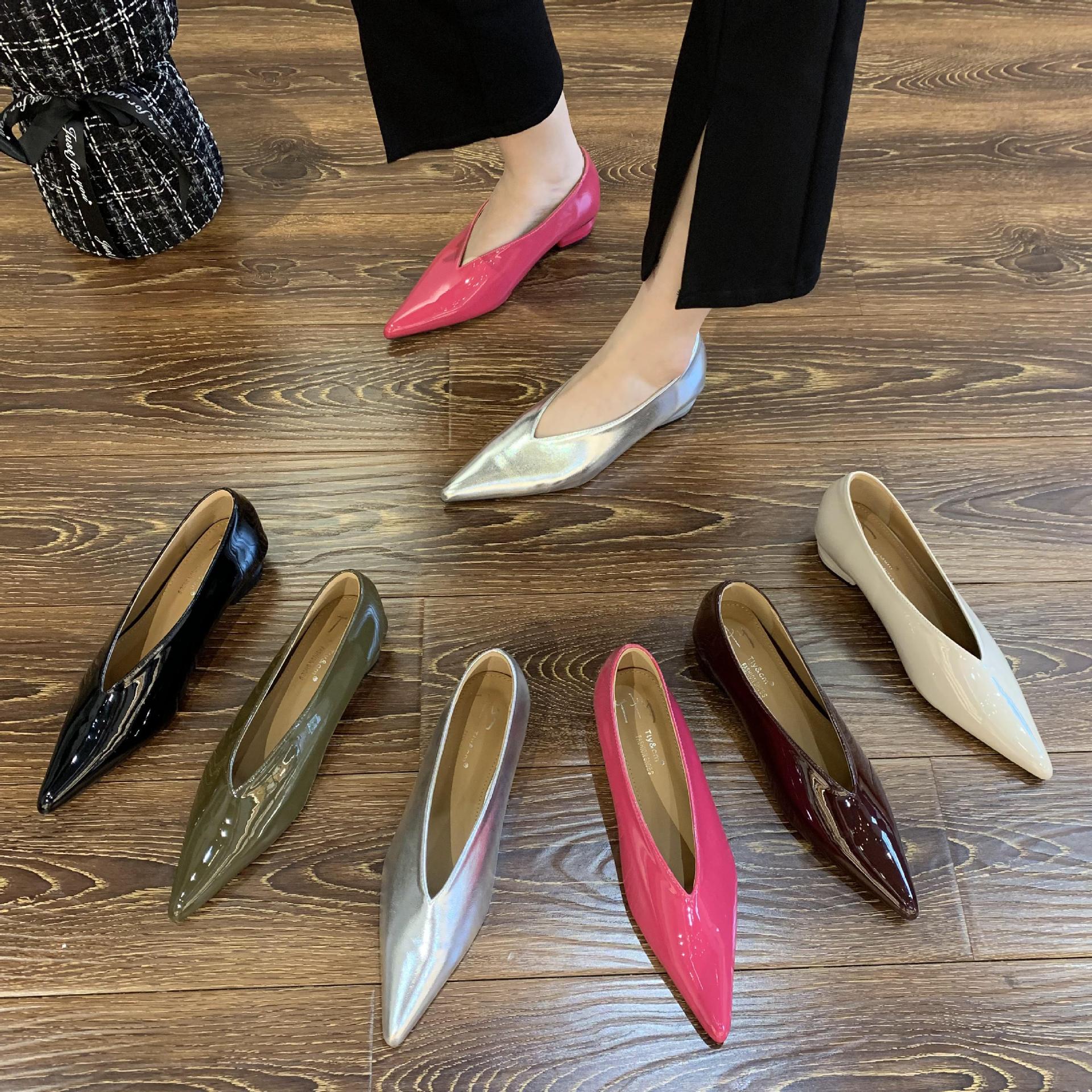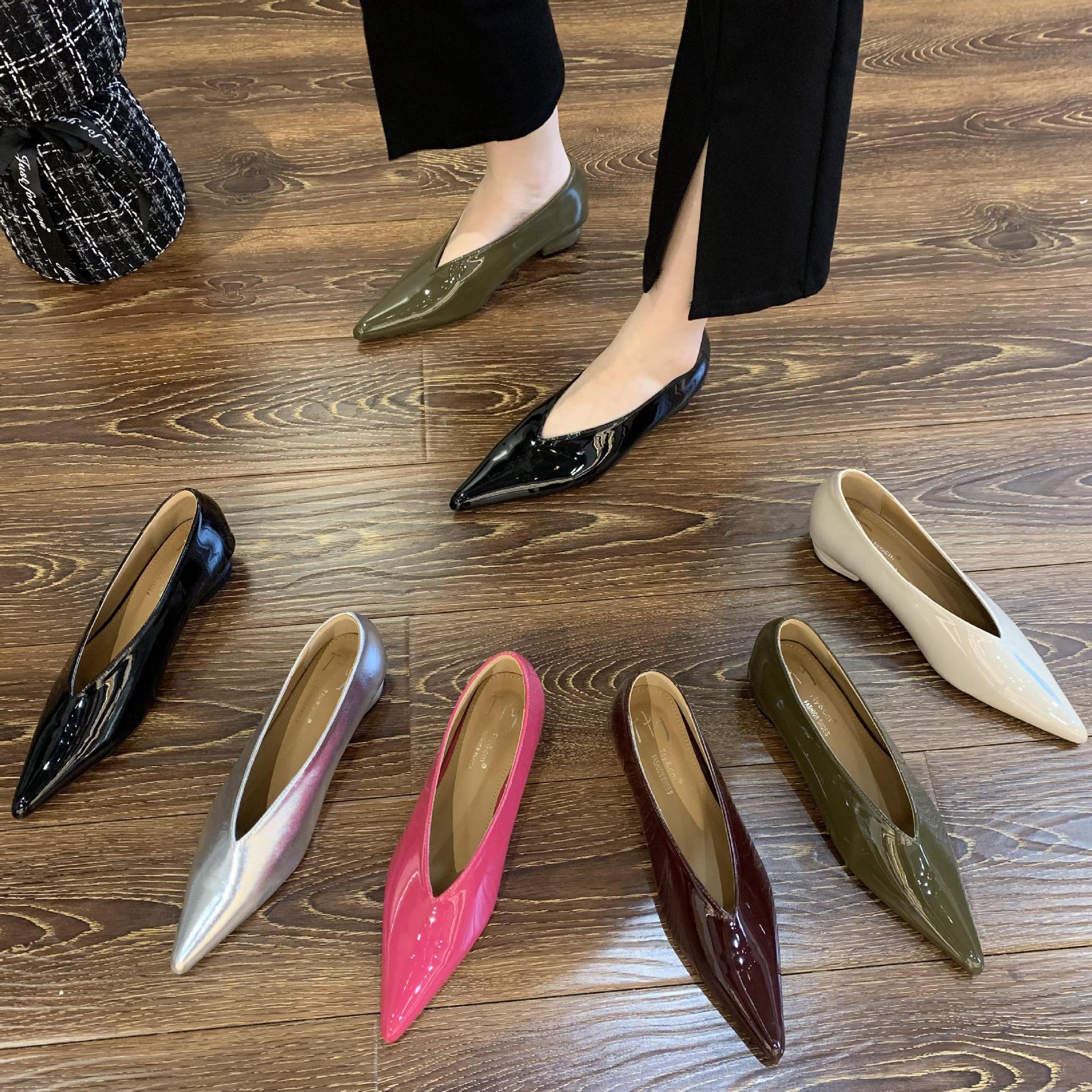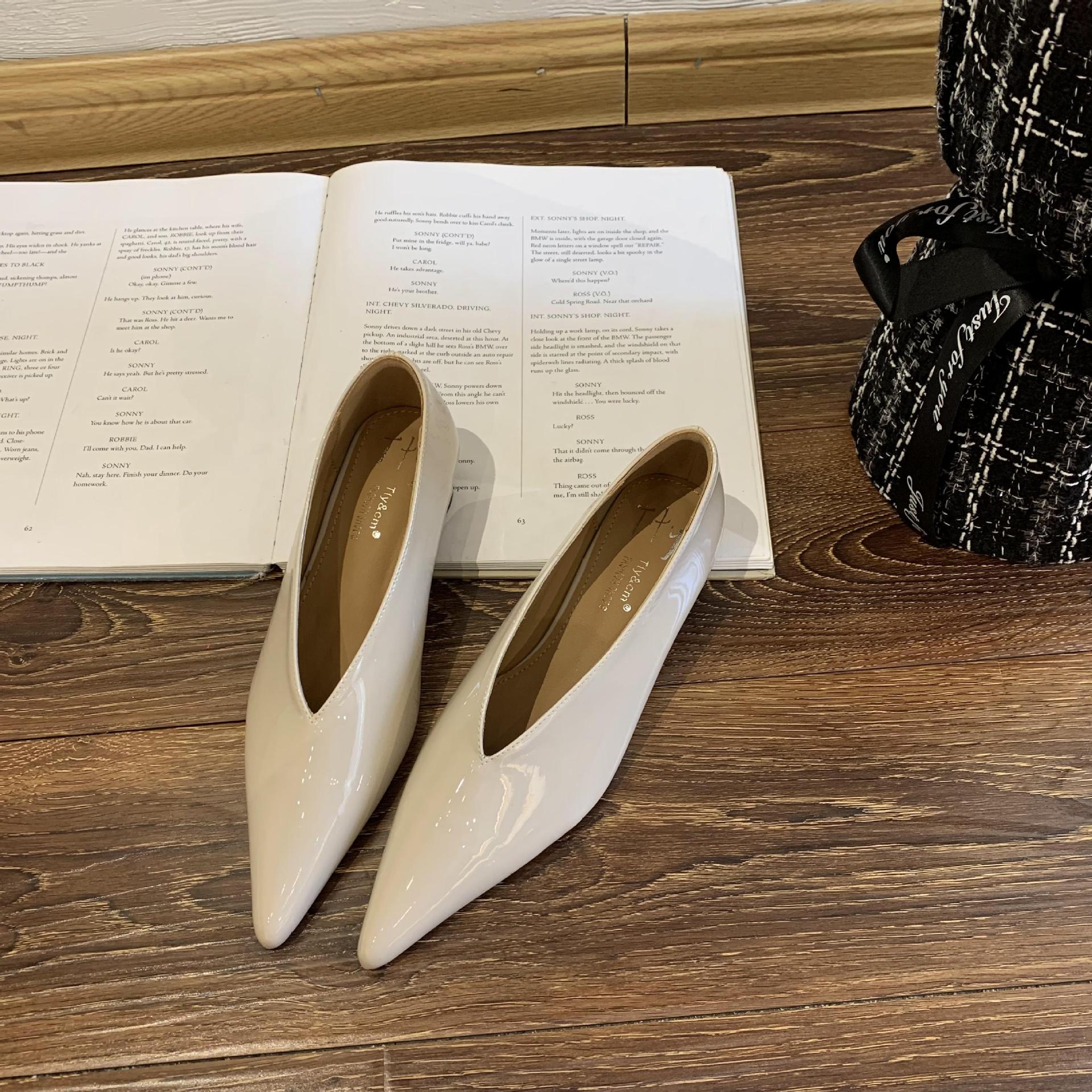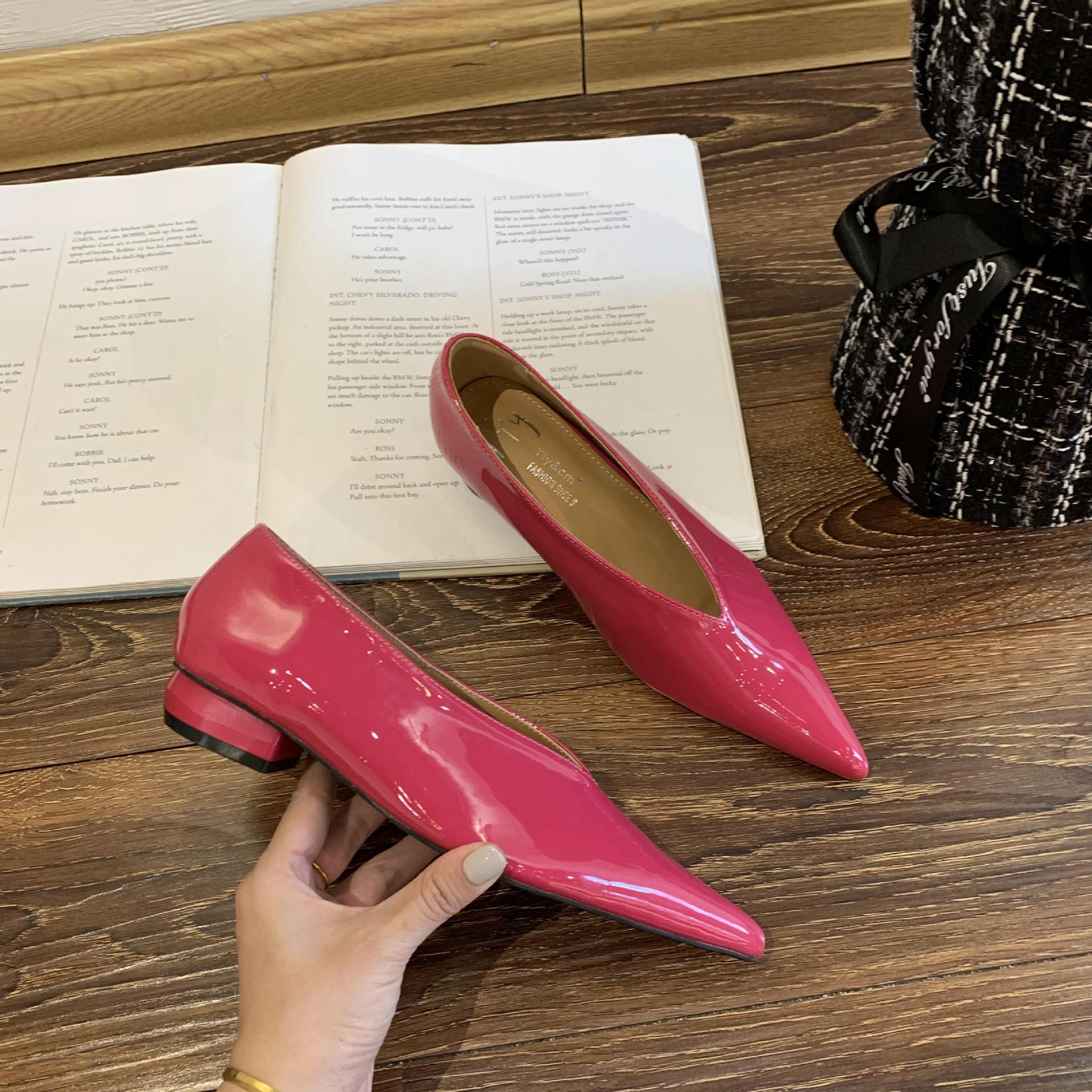 2023 가을과 겨울 새로운 두꺼운 굽 뾰족한 V-입 빈티지 밀크 신발 여성용 편안한 모든 매치 부드러운 에나멜 가죽 미드 힐 싱글 레이어 신발스토어 가기