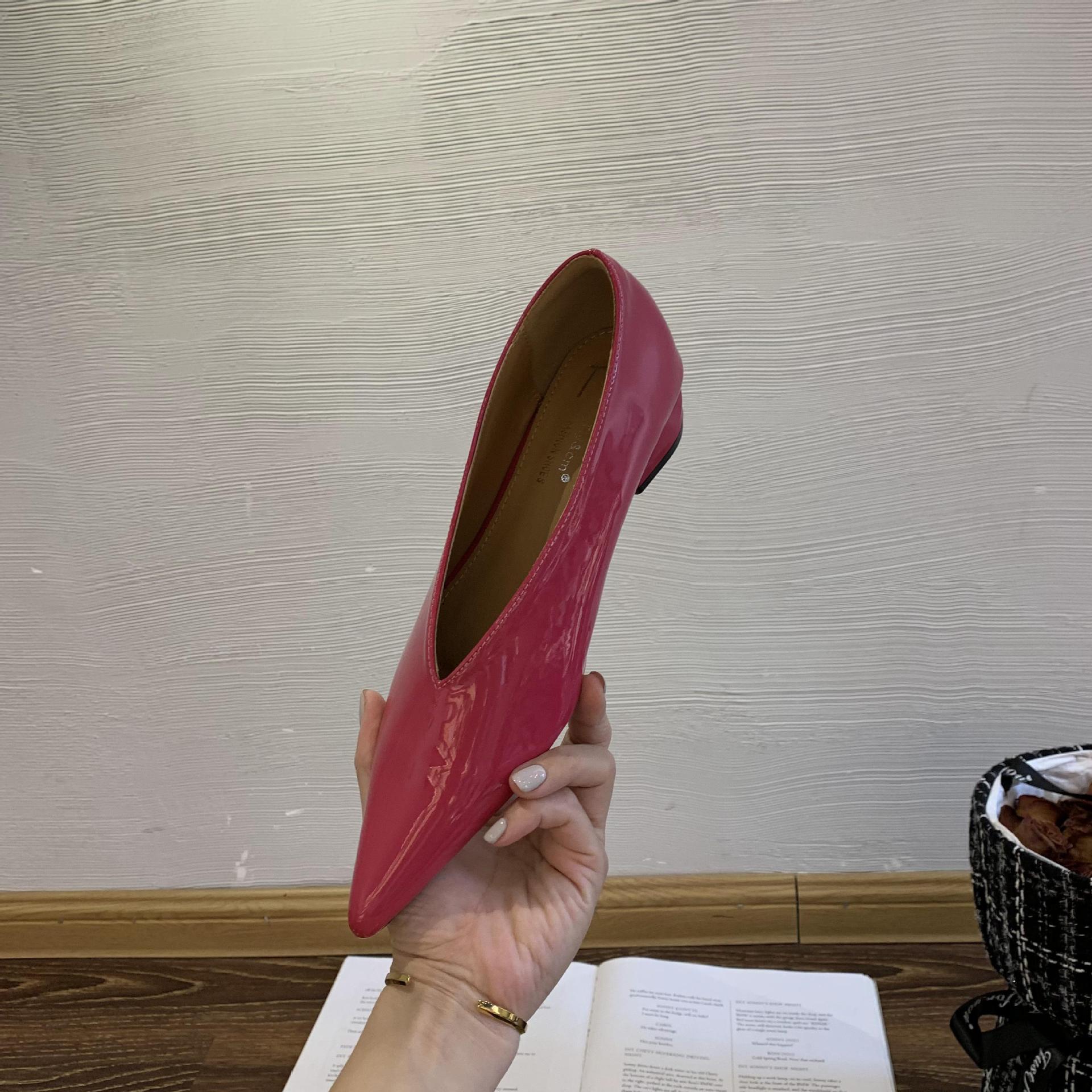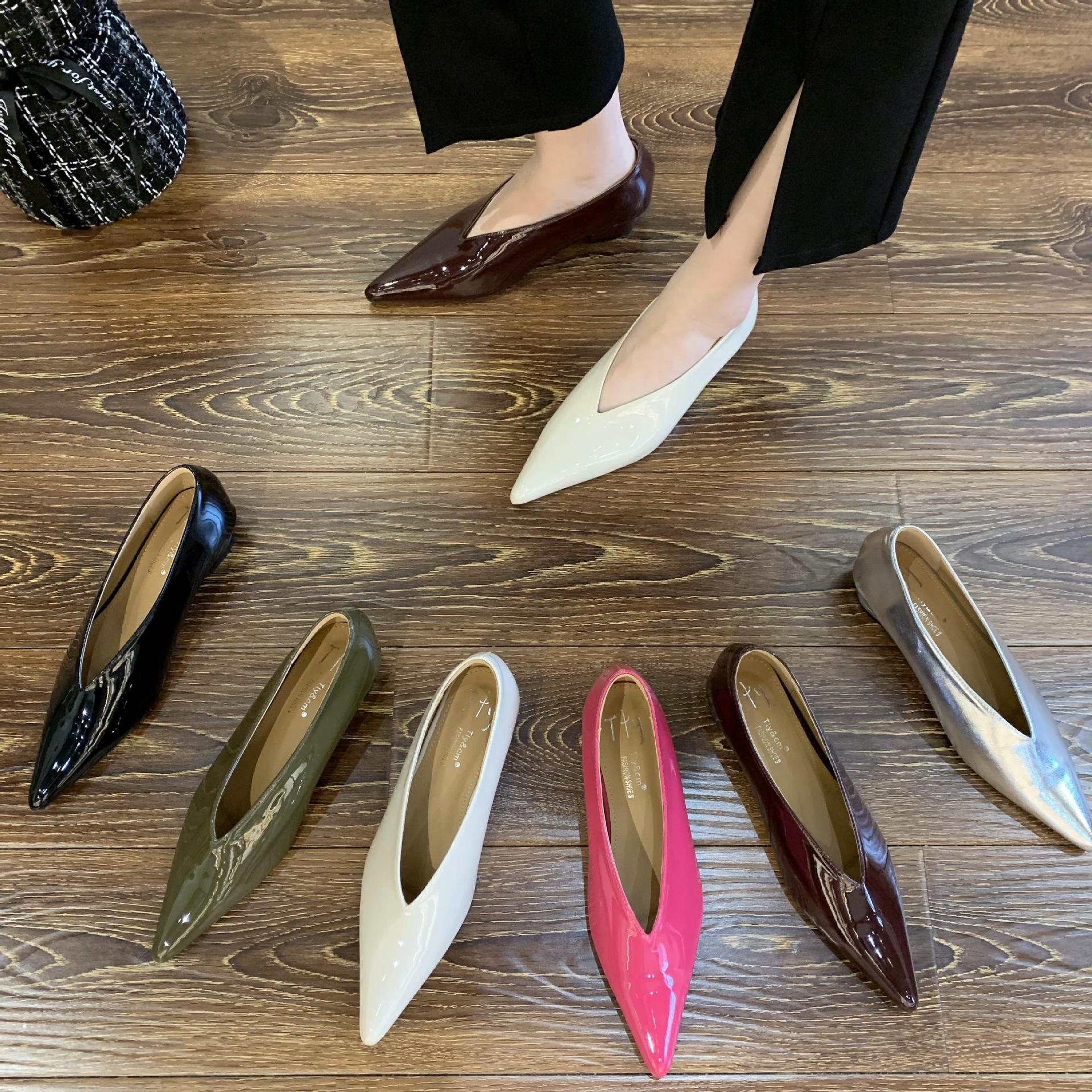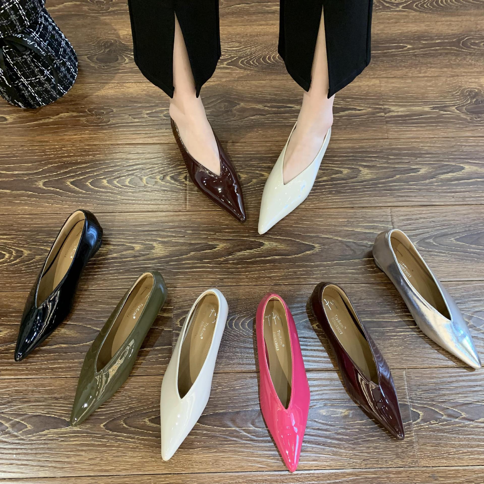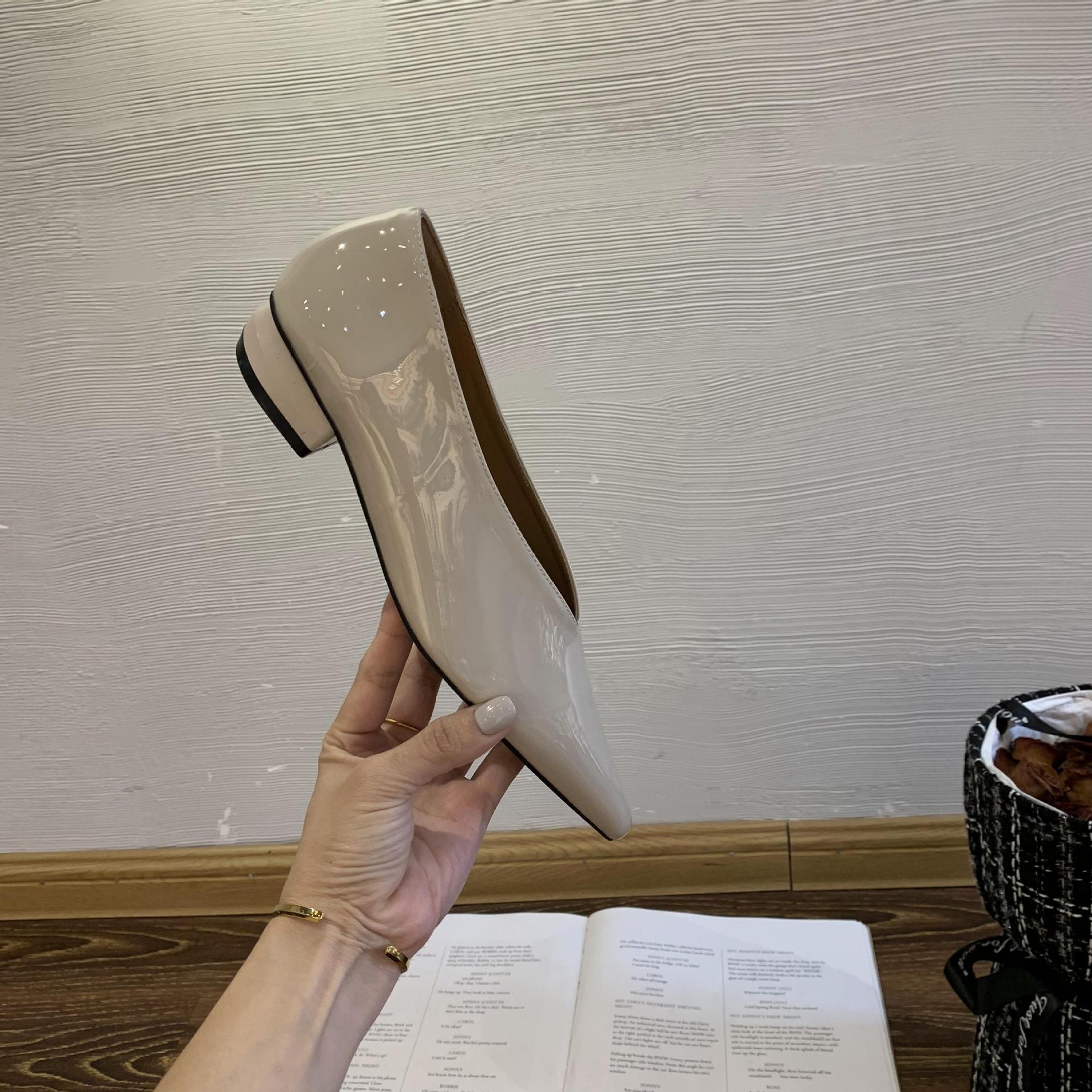 2023 가을과 겨울 새로운 두꺼운 굽 뾰족한 V-입 빈티지 밀크 신발 여성용 편안한 모든 매치 부드러운 에나멜 가죽 미드 힐 싱글 레이어 신발스토어 가기