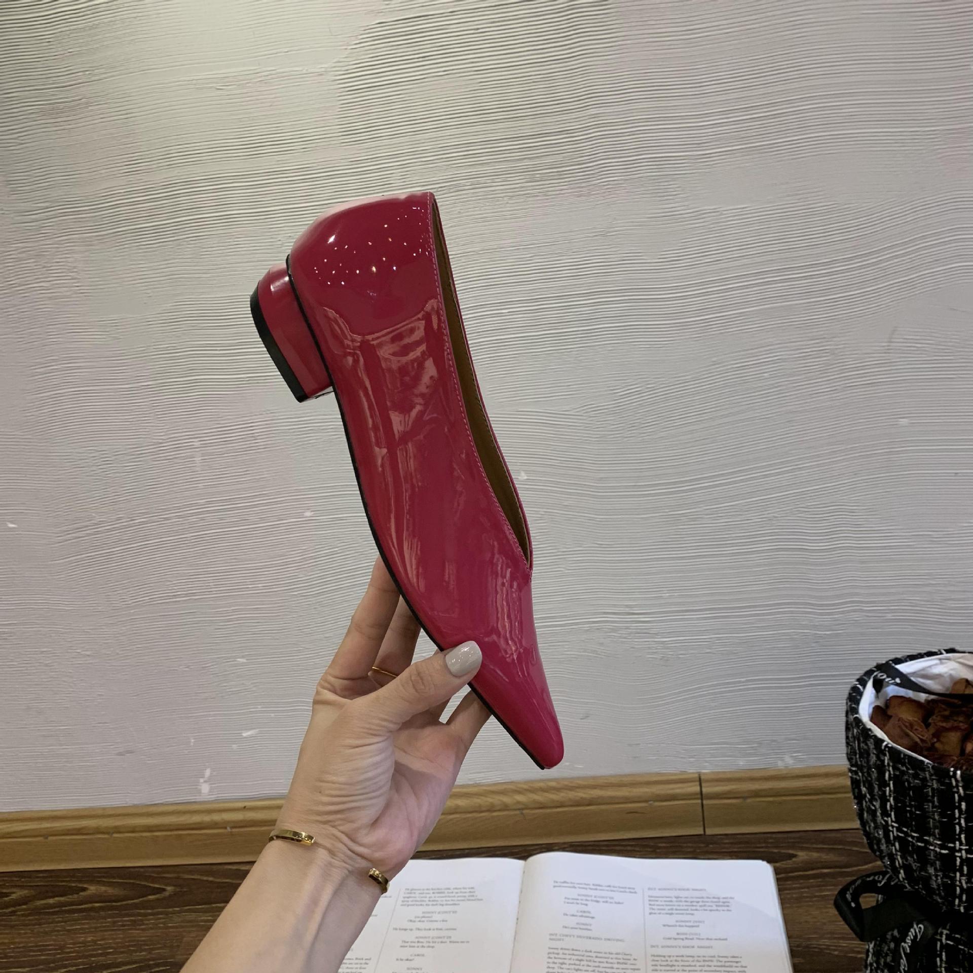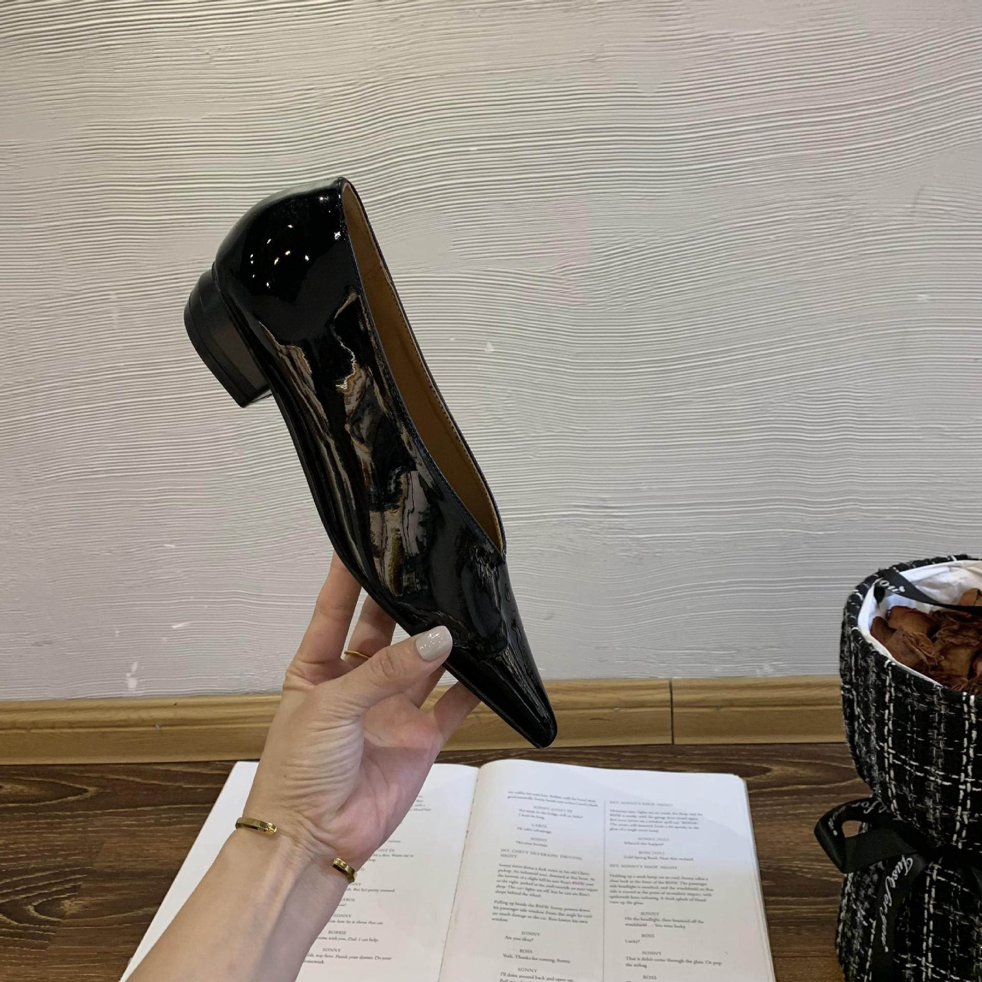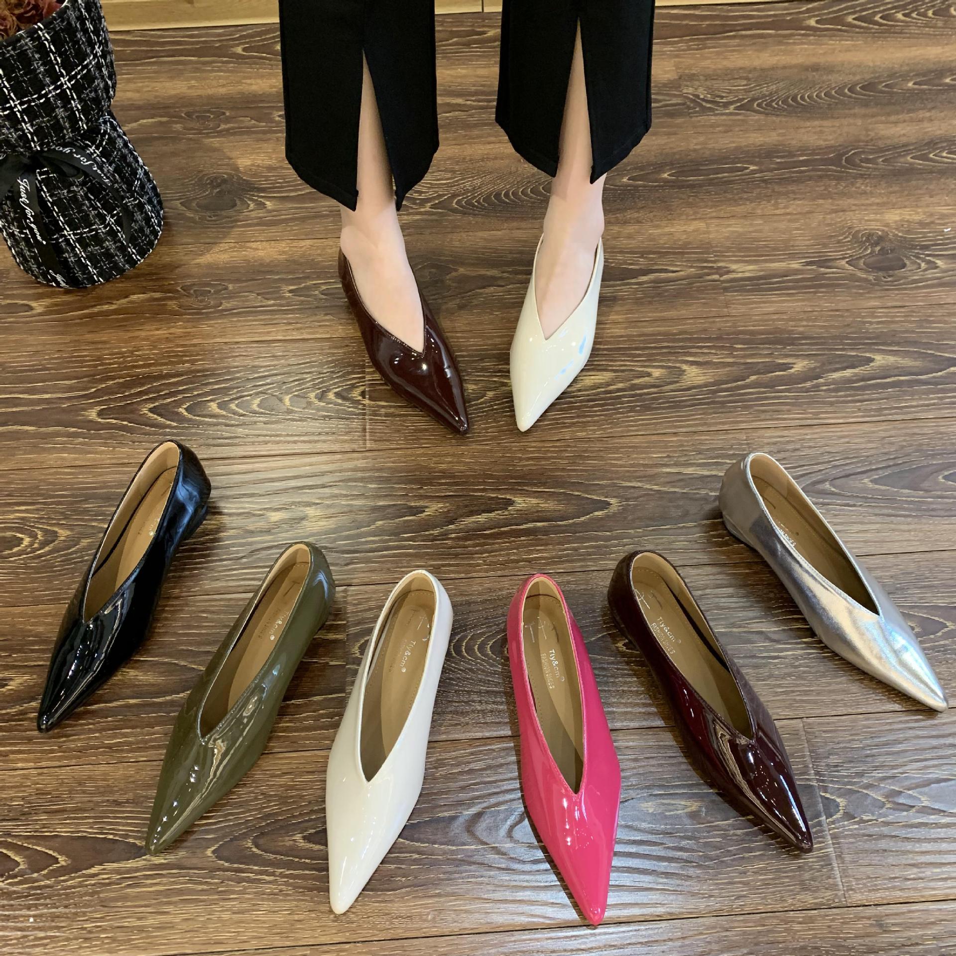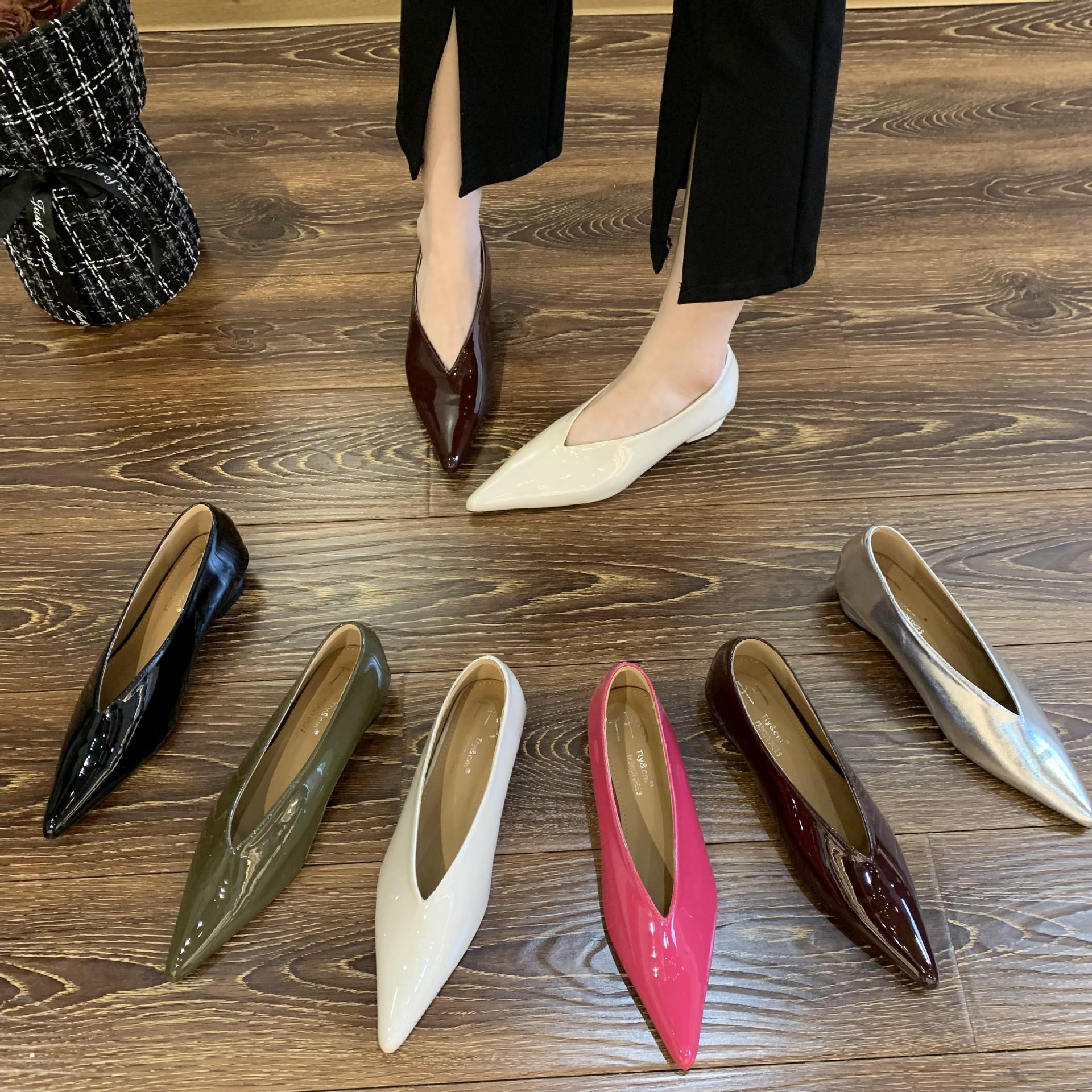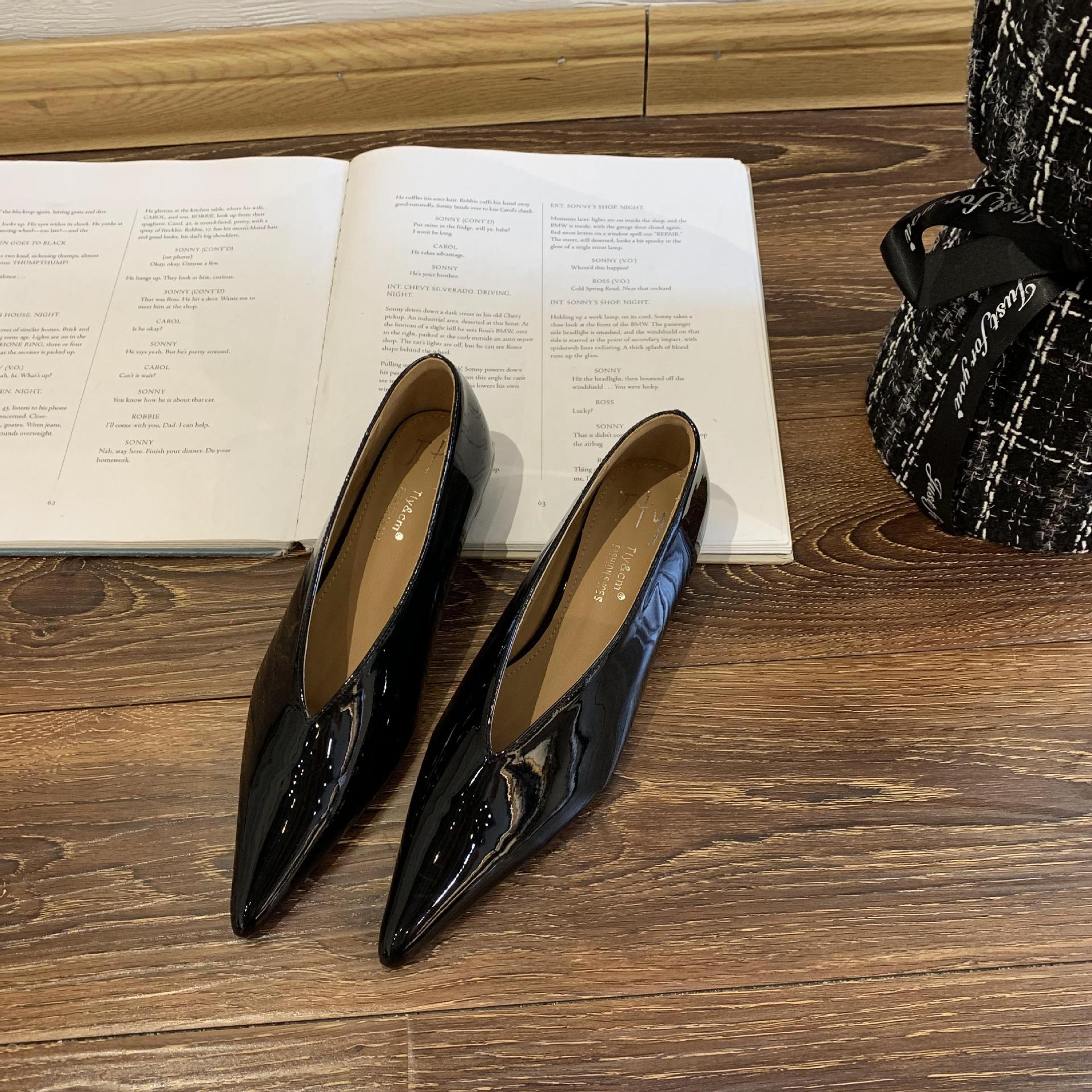 2023 가을과 겨울 새로운 두꺼운 굽 뾰족한 V-입 빈티지 밀크 신발 여성용 편안한 모든 매치 부드러운 에나멜 가죽 미드 힐 싱글 레이어 신발스토어 가기