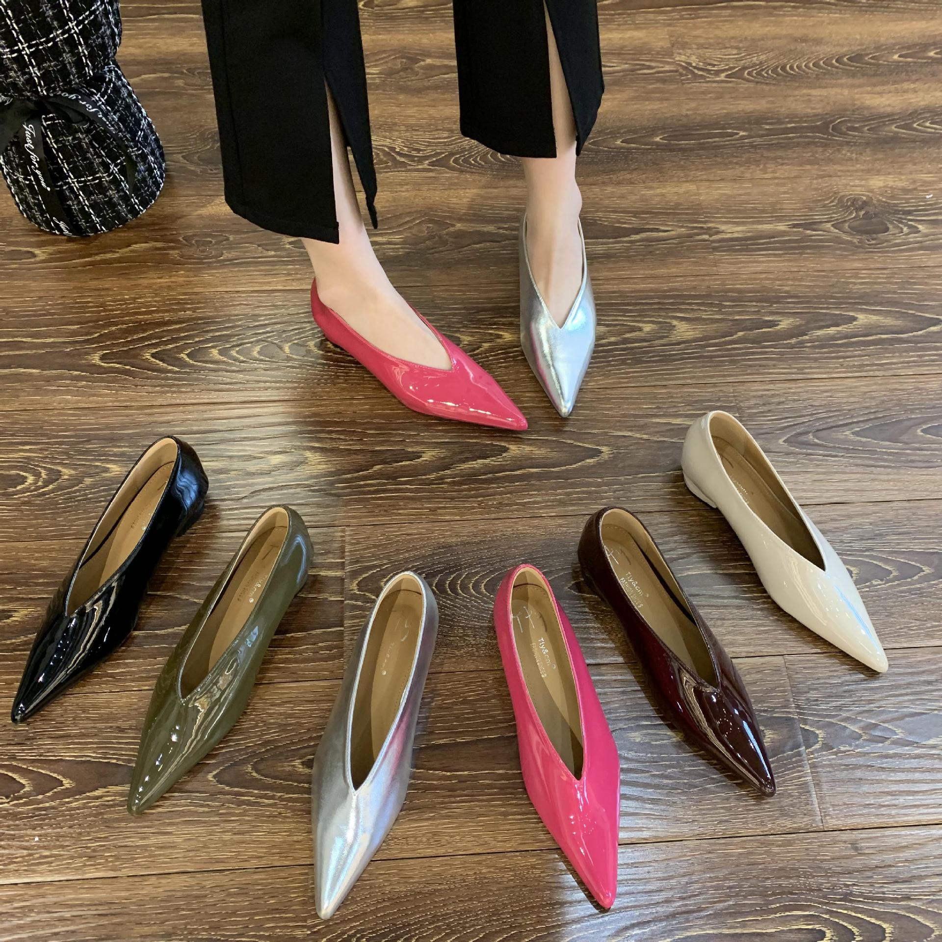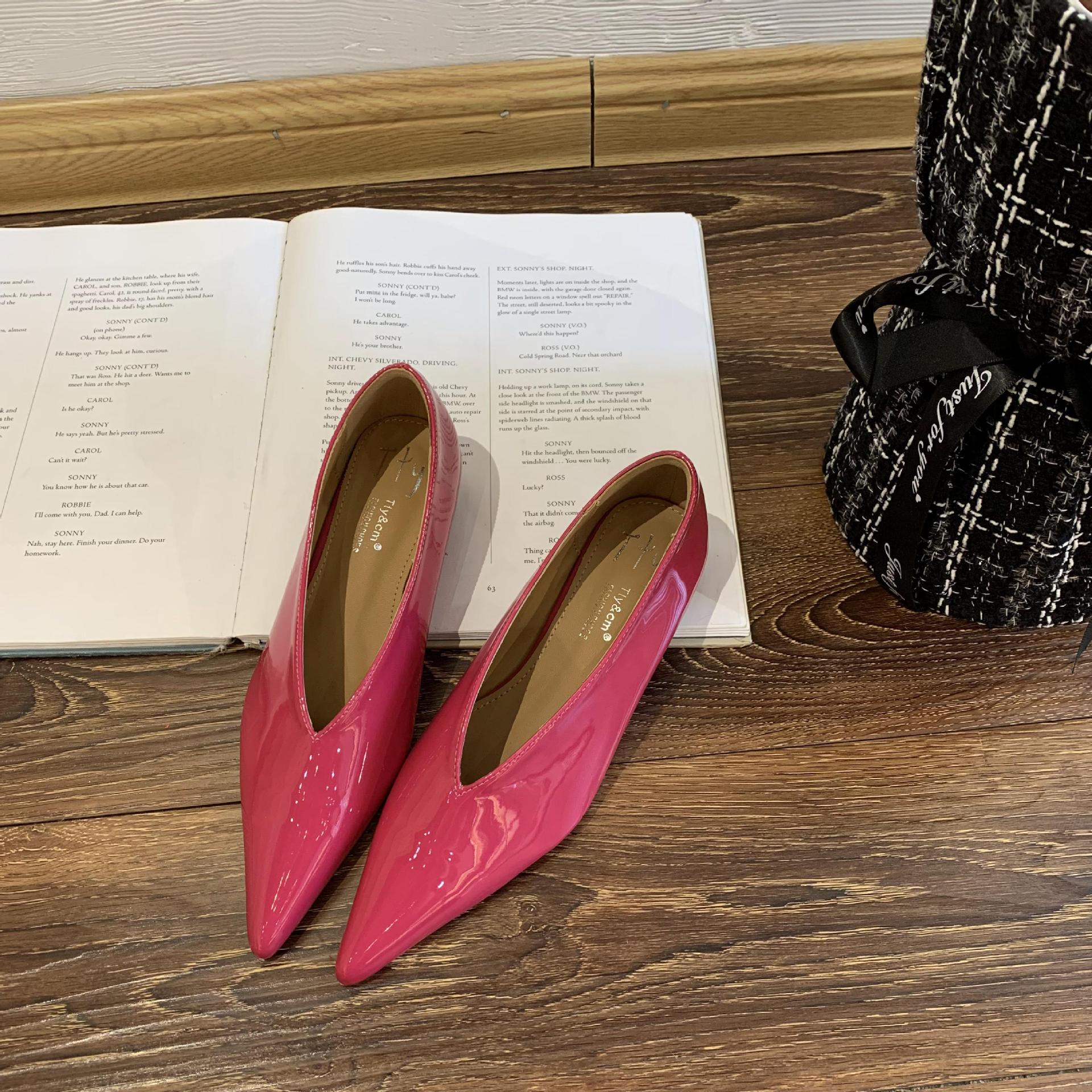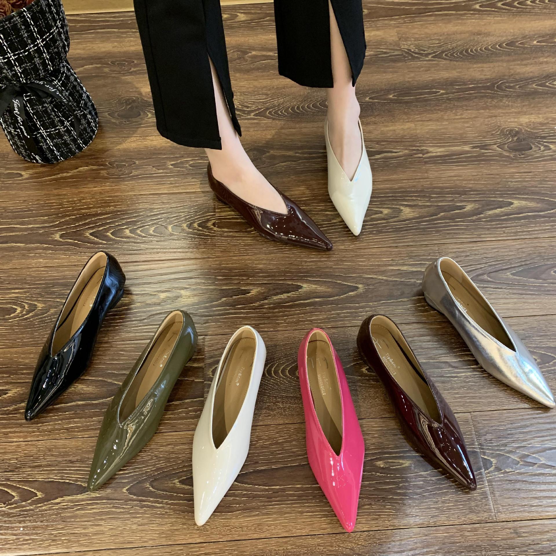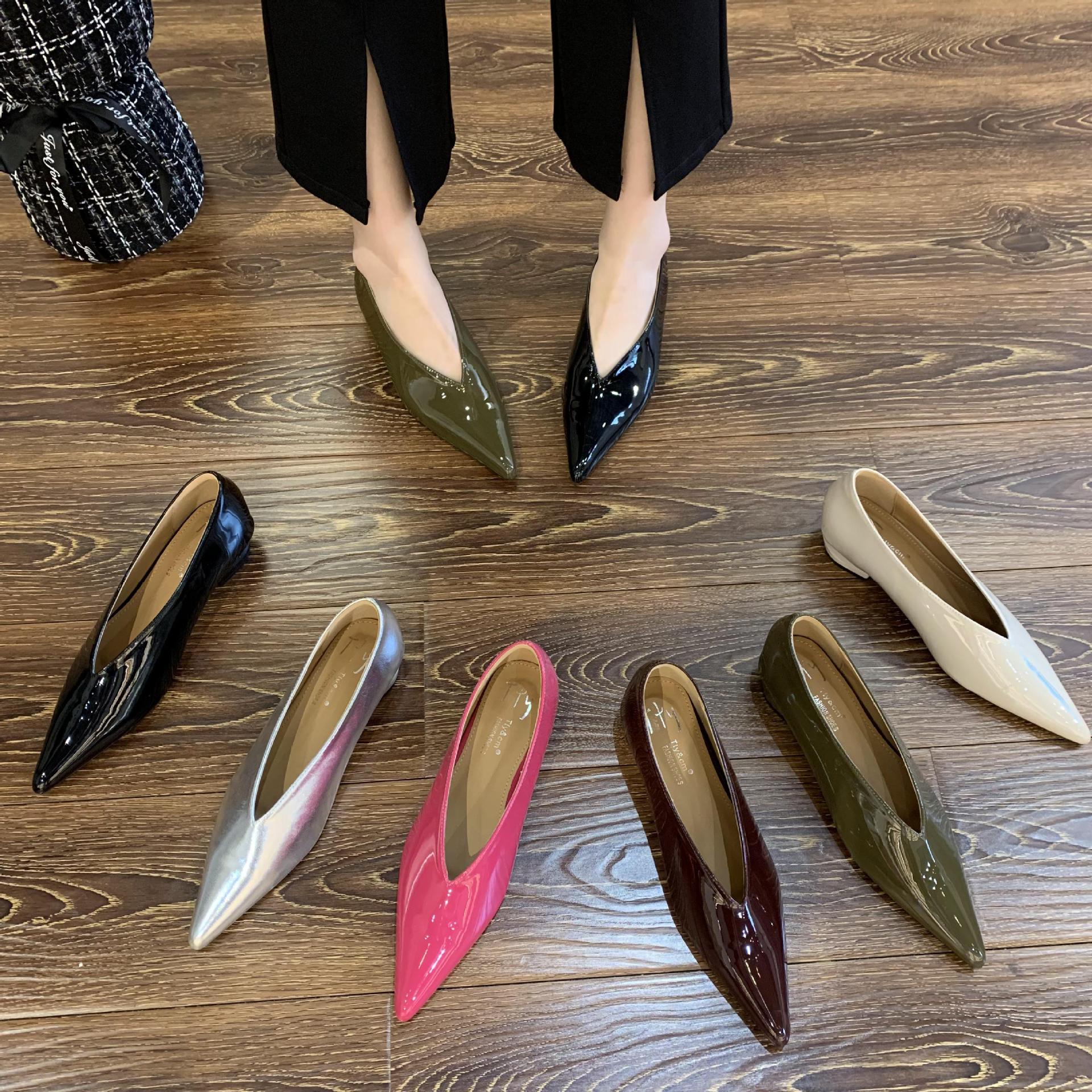 2023 가을과 겨울 새로운 두꺼운 굽 뾰족한 V-입 빈티지 밀크 신발 여성용 편안한 모든 매치 부드러운 에나멜 가죽 미드 힐 싱글 레이어 신발스토어 가기