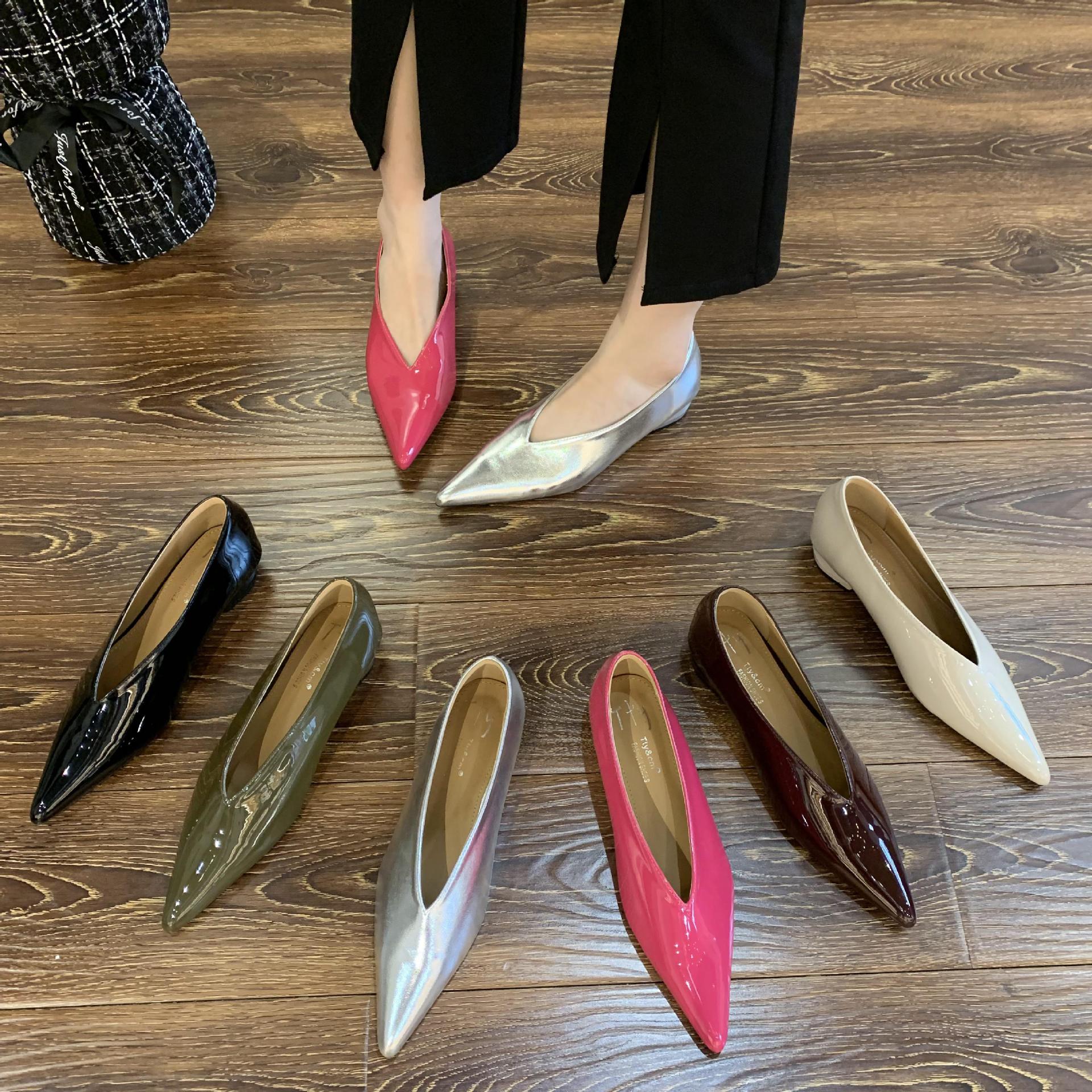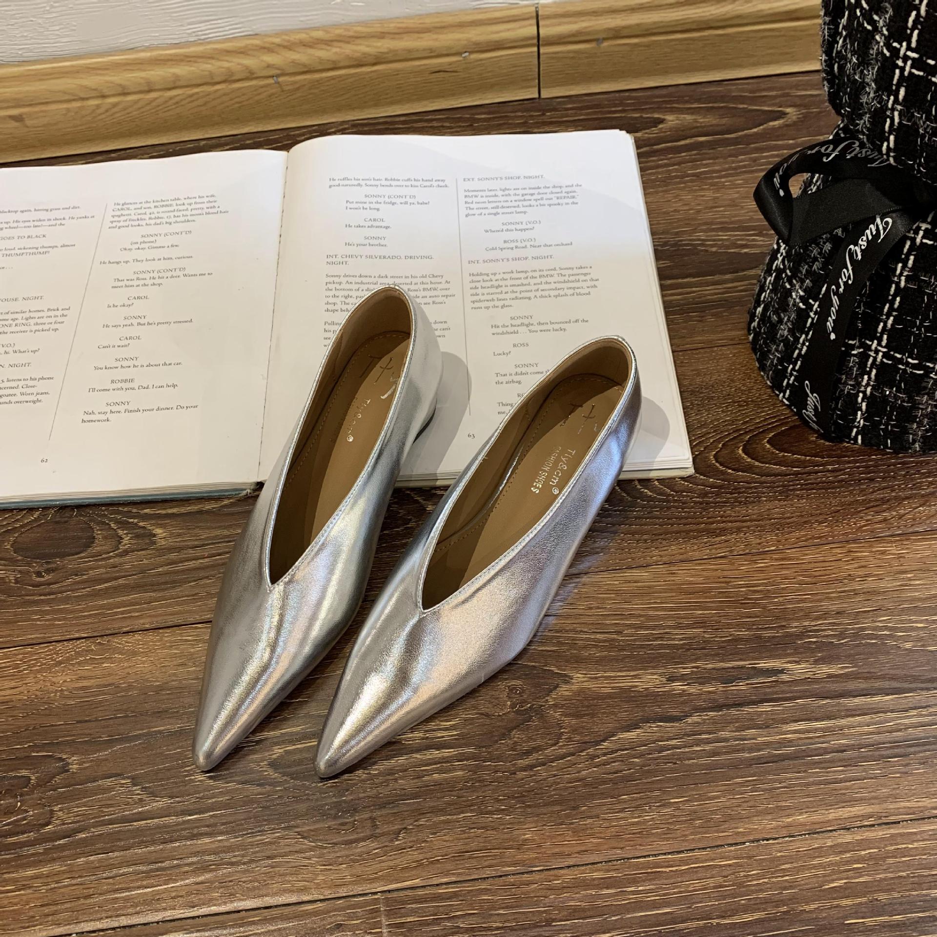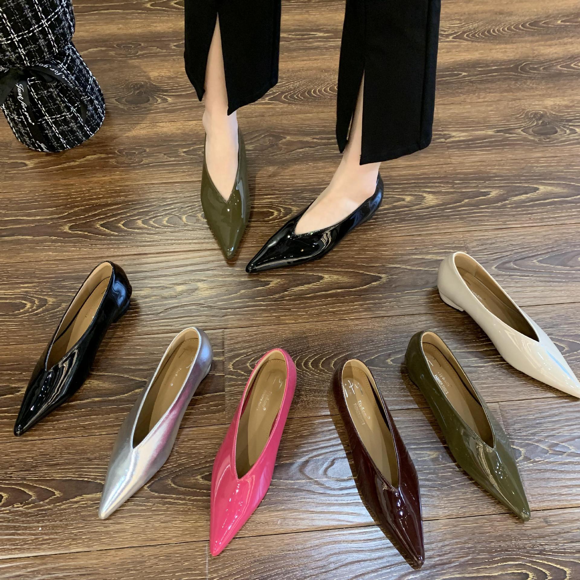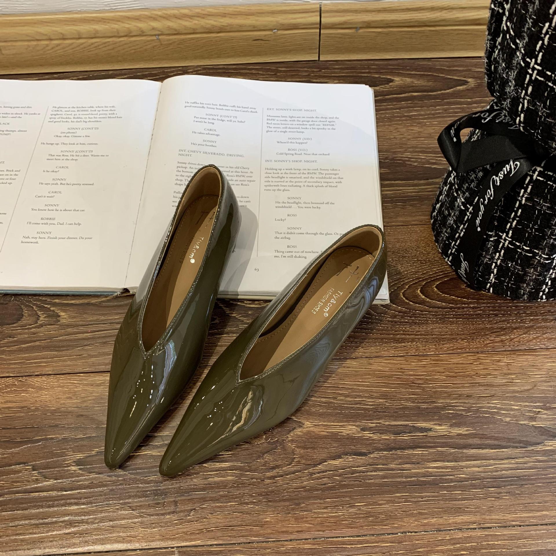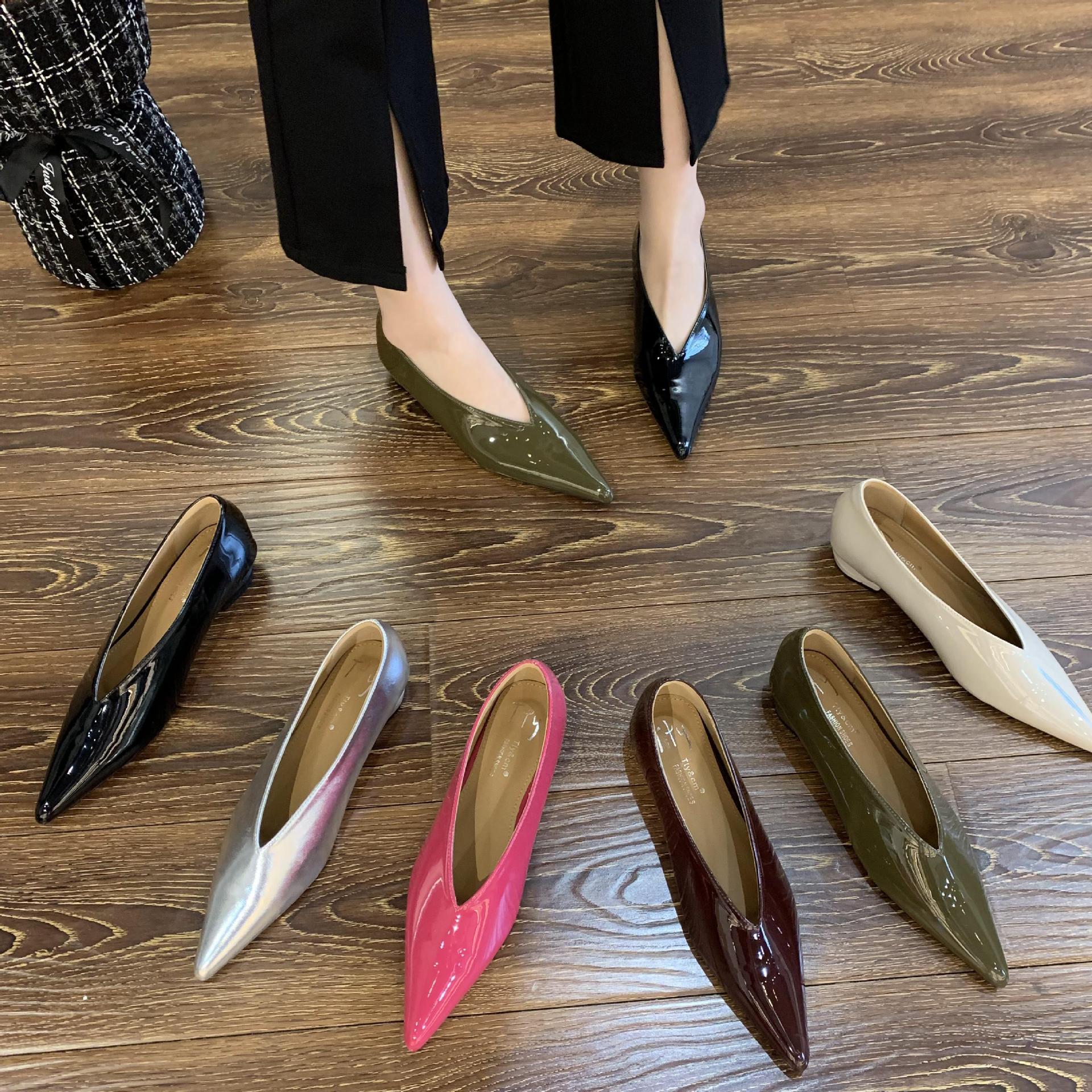 2023 가을과 겨울 새로운 두꺼운 굽 뾰족한 V-입 빈티지 밀크 신발 여성용 편안한 모든 매치 부드러운 에나멜 가죽 미드 힐 싱글 레이어 신발스토어 가기