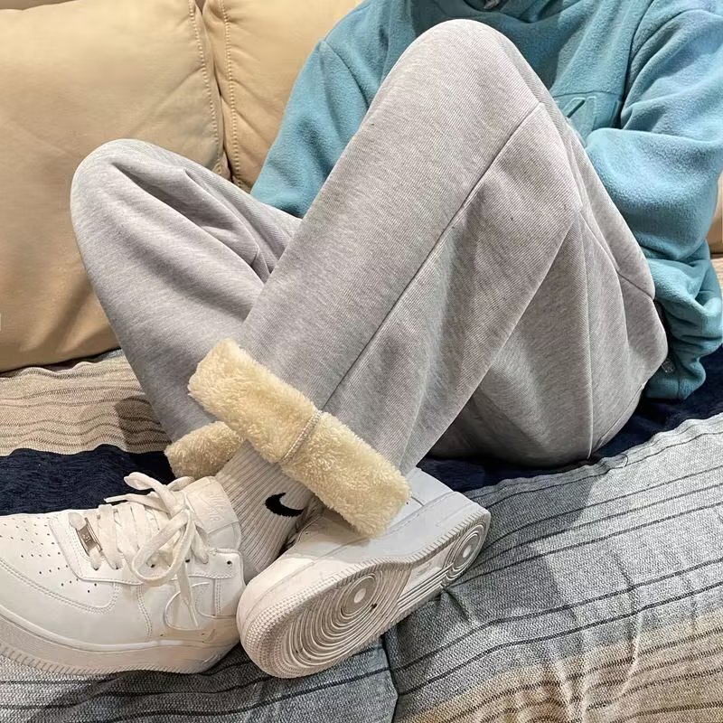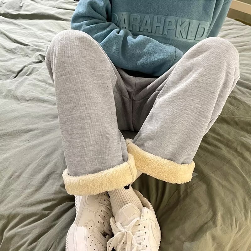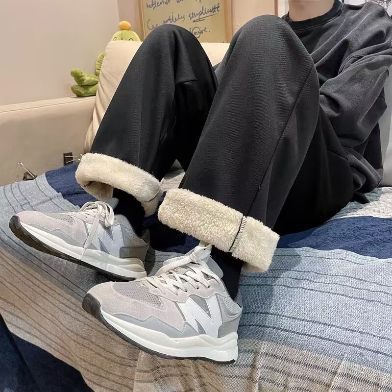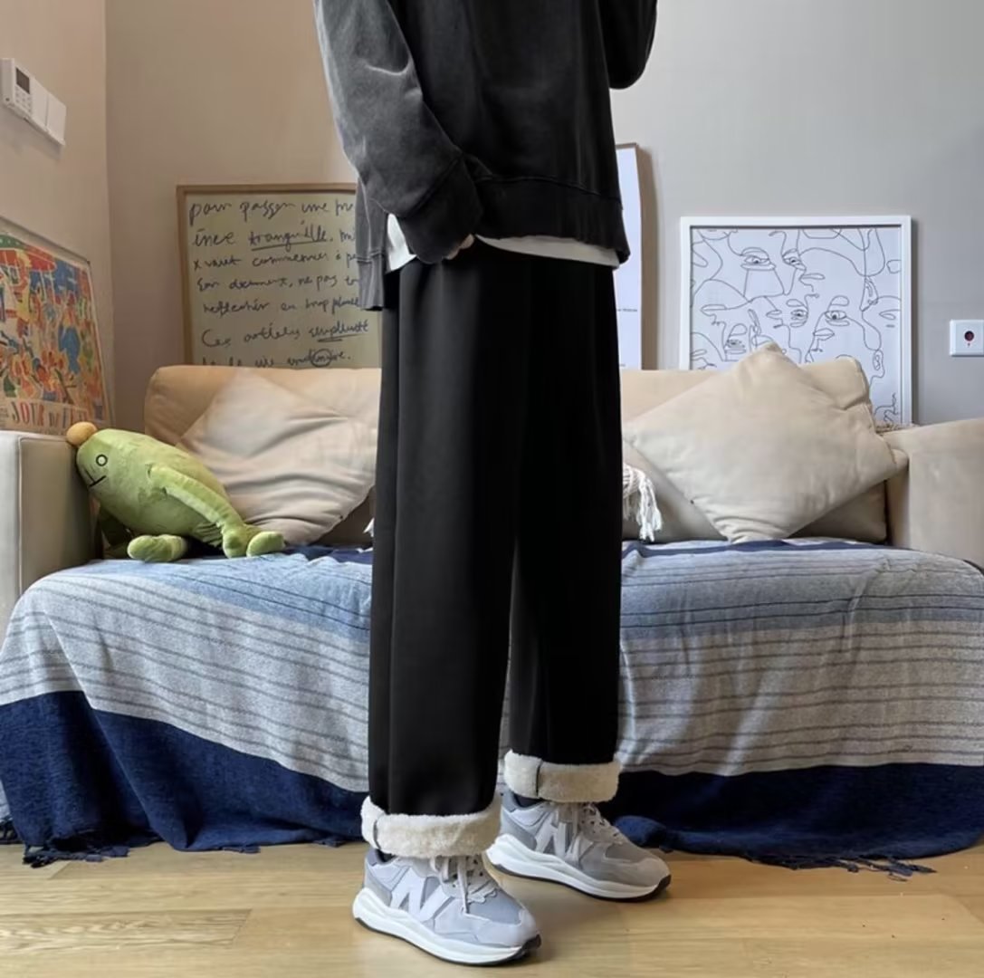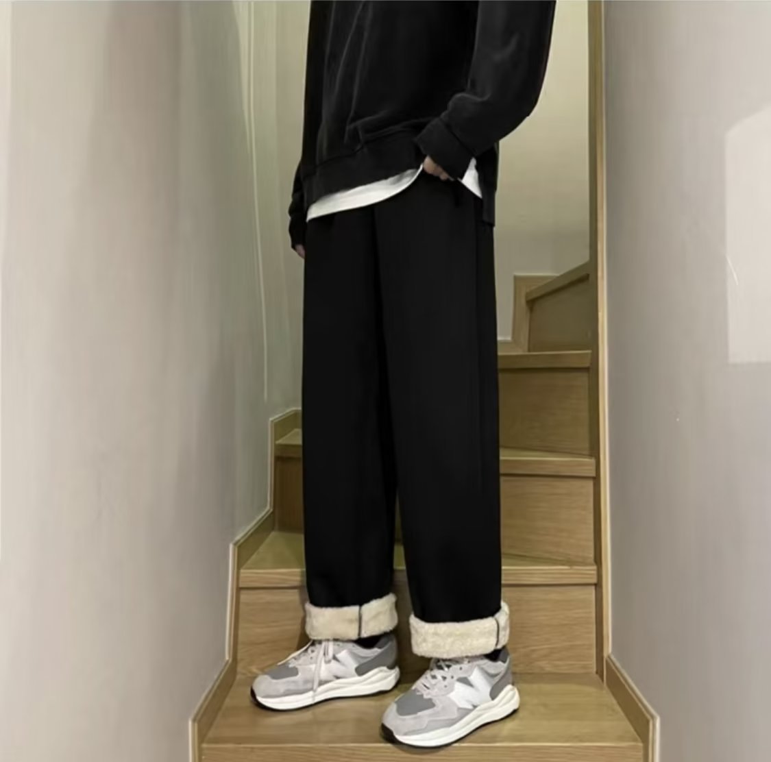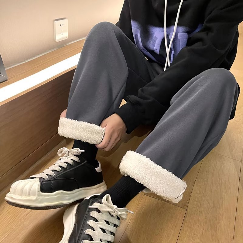 양고기 양털 와이드 다리 바지 남자의 겨울 새로운 하이 웨이스트 느슨한 다리 발가락 심플 캐주얼 Harlan 기모 두꺼운 웨이 바지