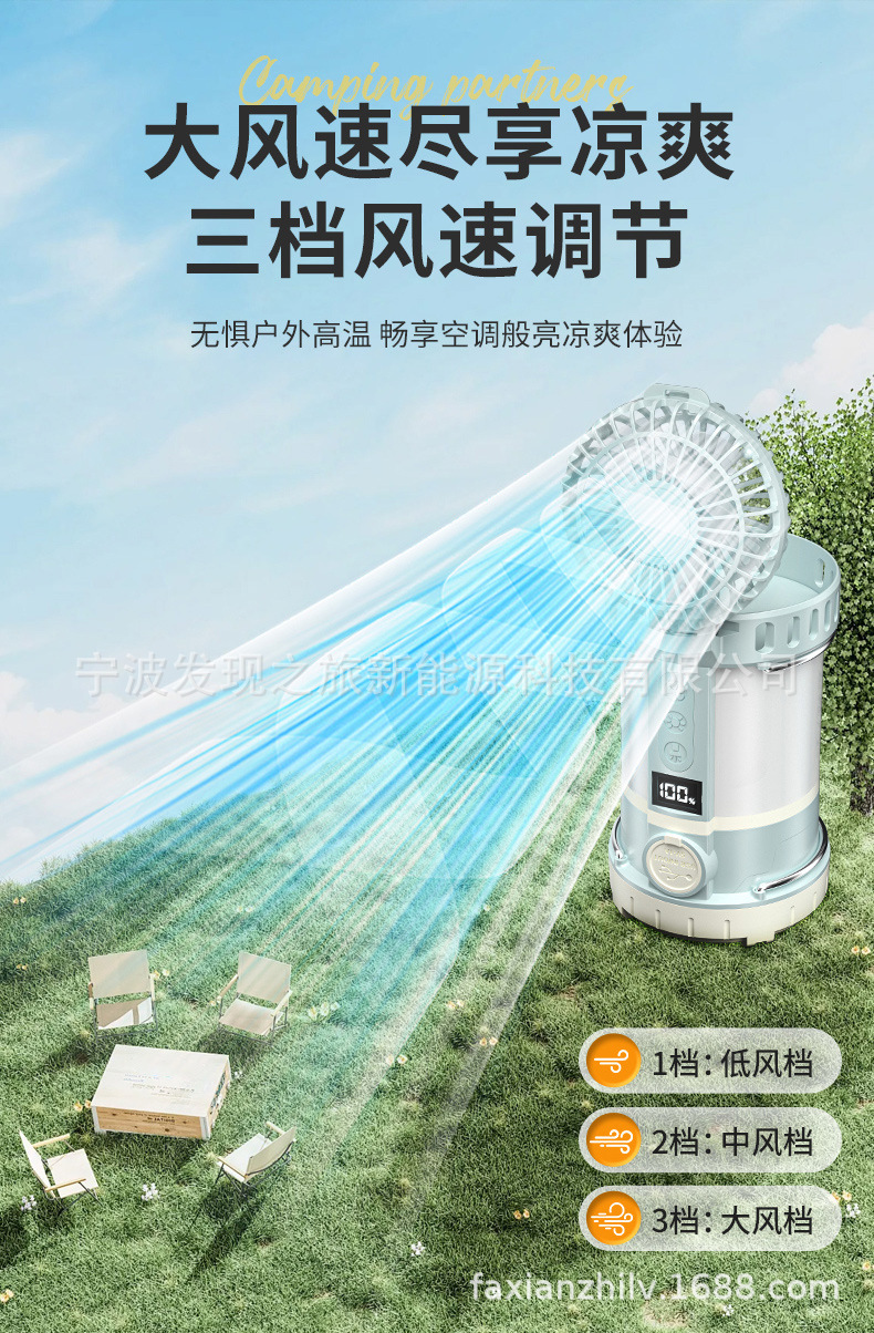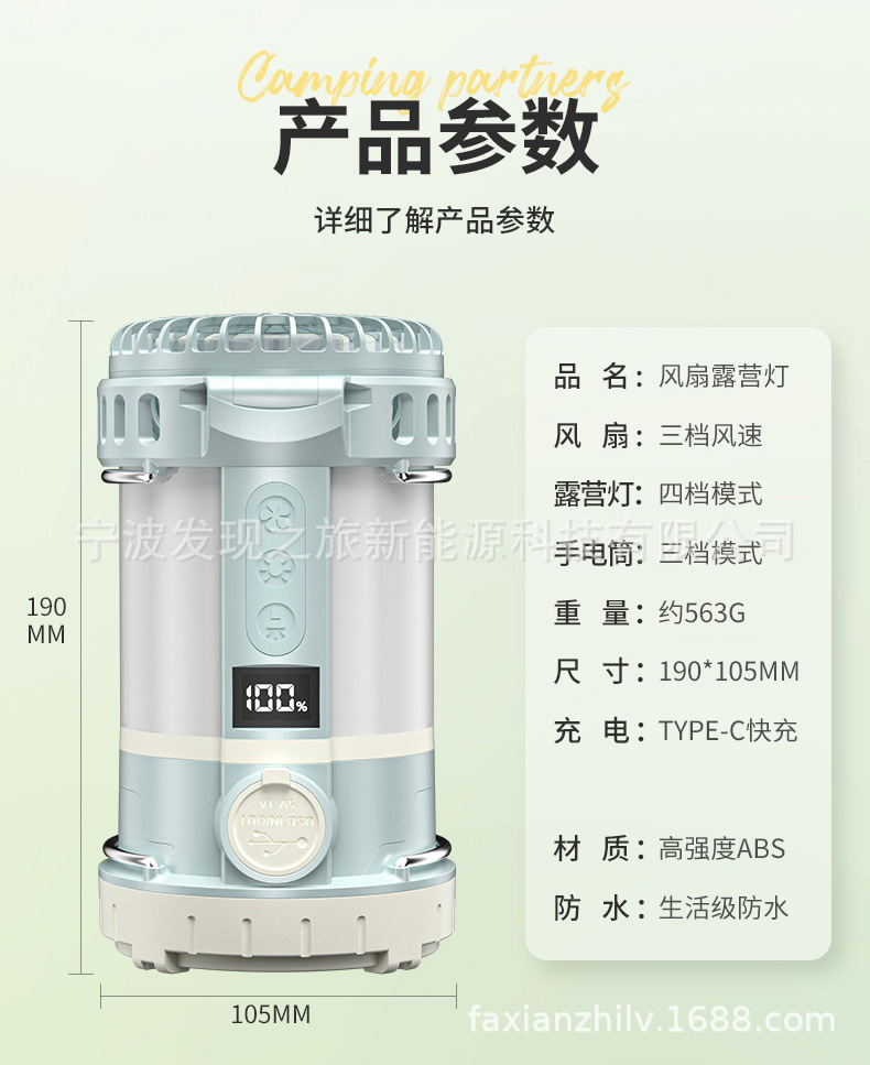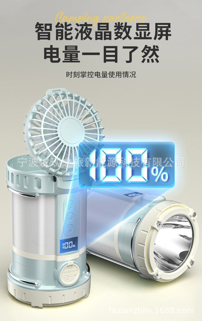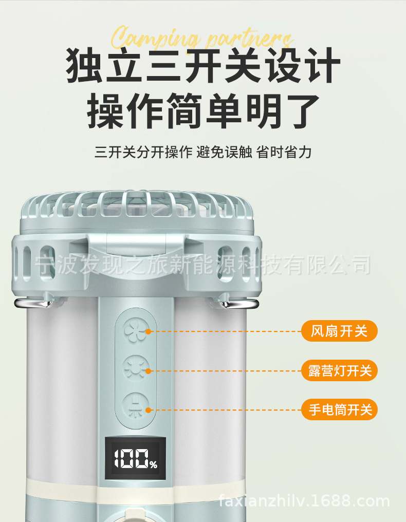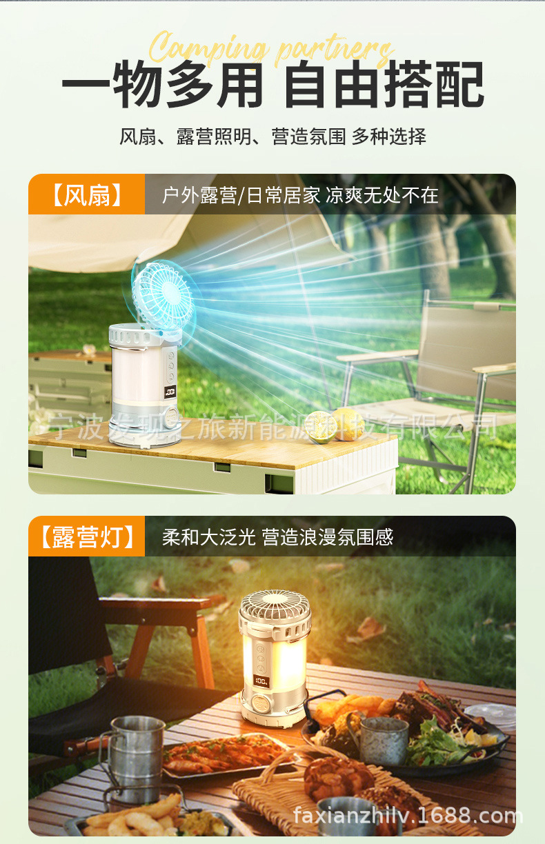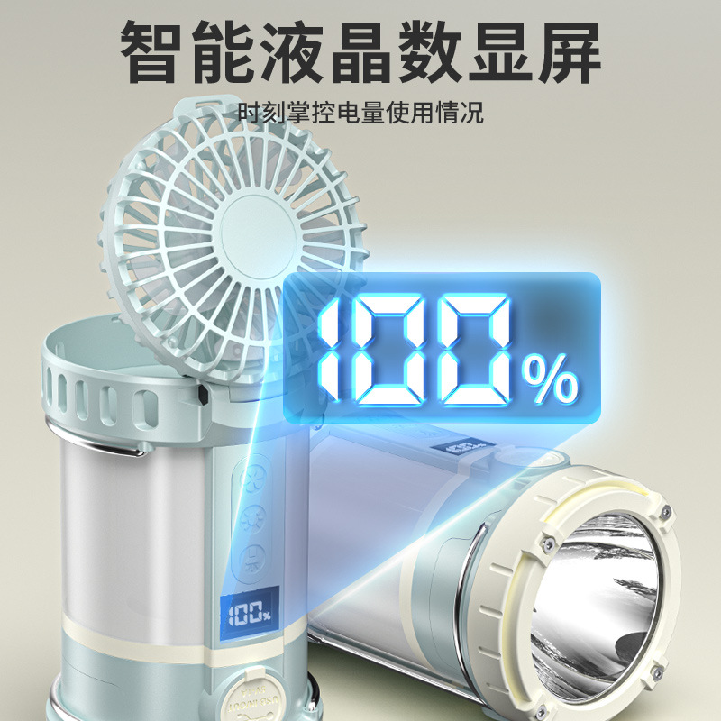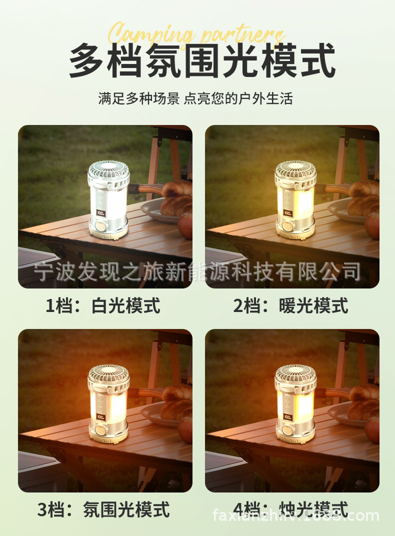 功能 手电筒强光-弱光-爆闪; 侧灯白光-暖光-氛围光-烛光模式; 风扇低档-中档-高档风