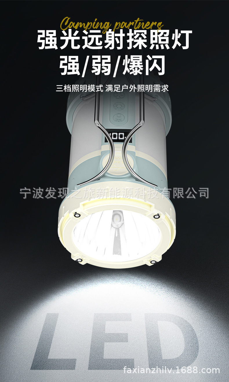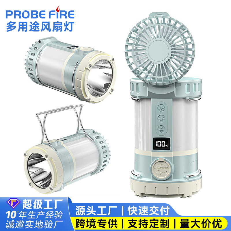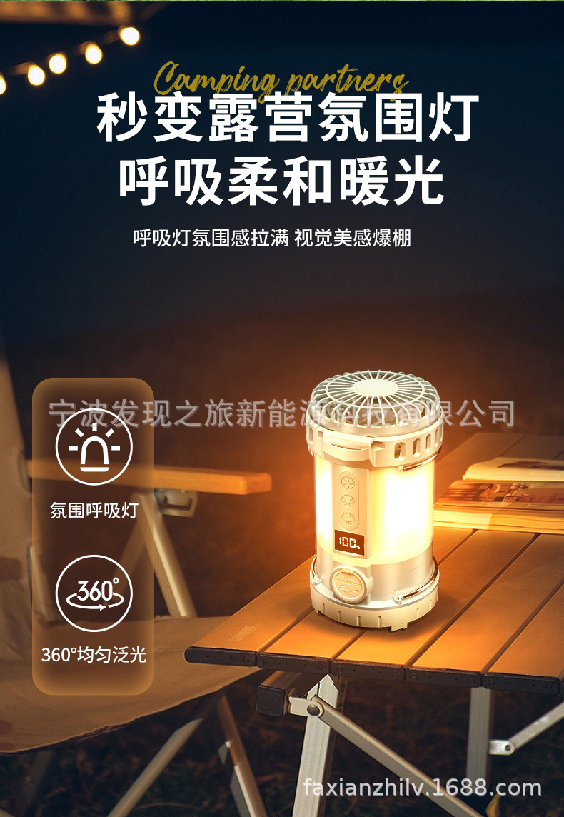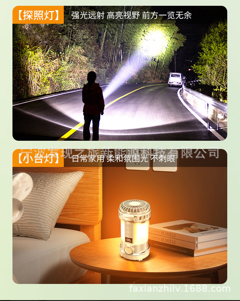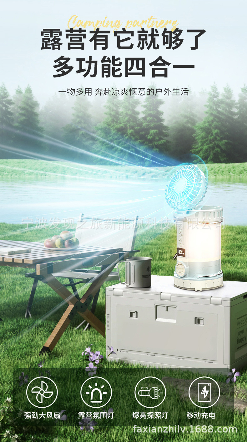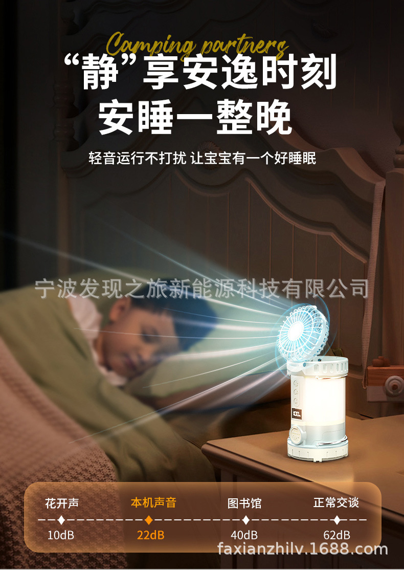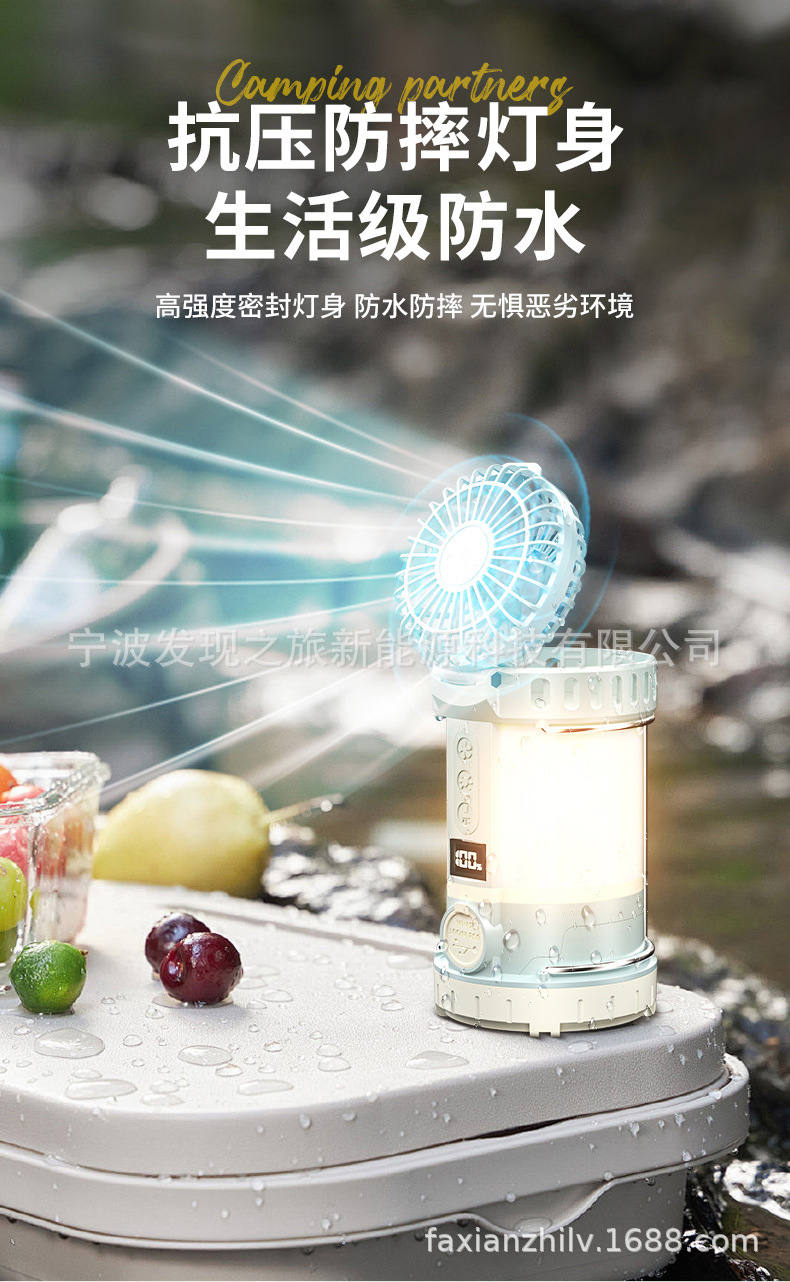 功能 手电筒强光-弱光-爆闪; 侧灯白光-暖光-氛围光-烛光模式; 风扇低档-中档-高档风