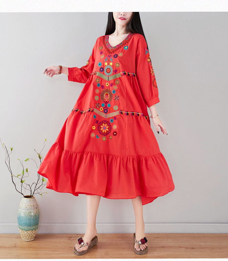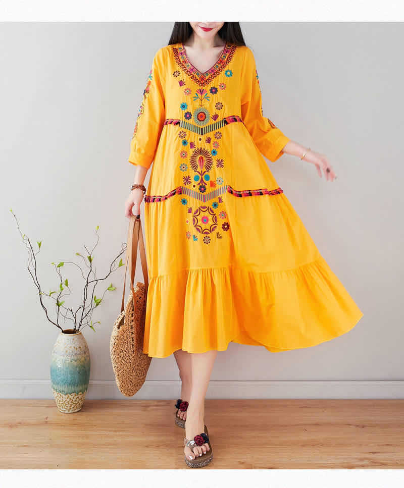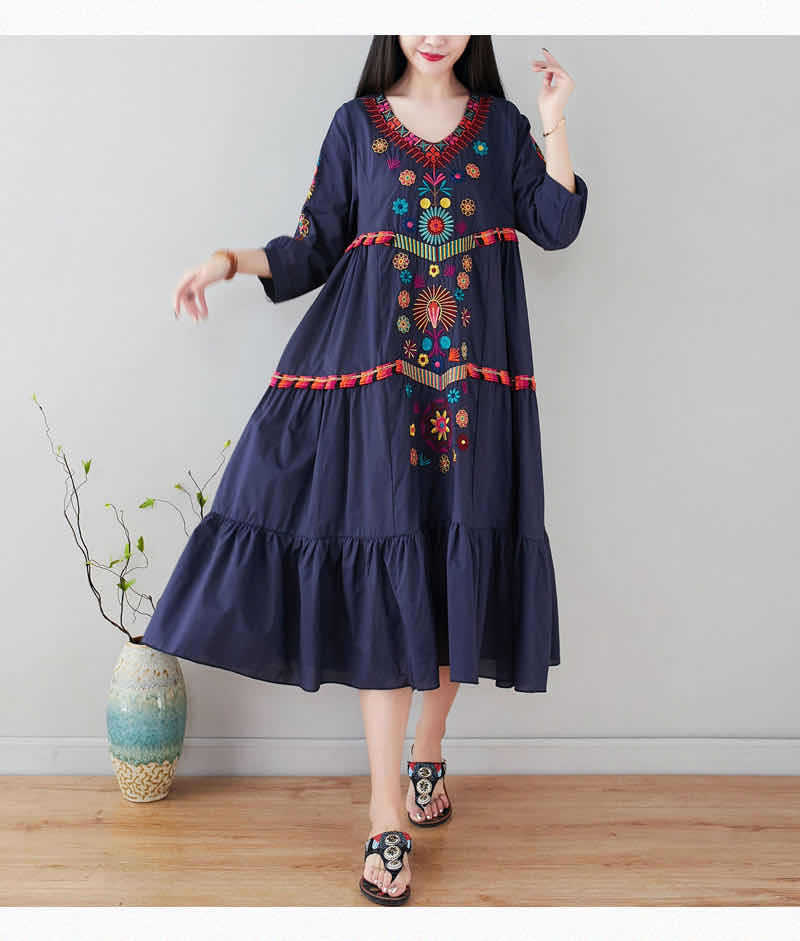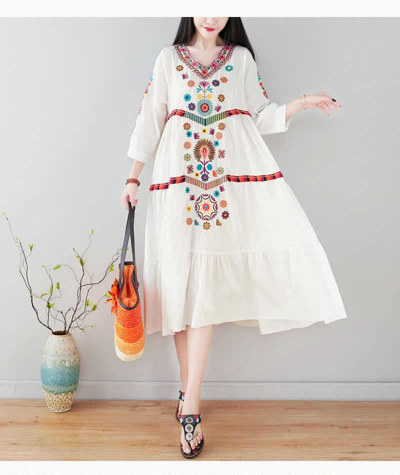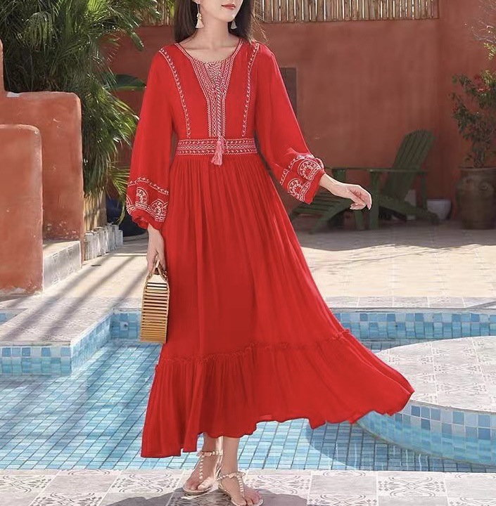 에스닉 스타일 원피스 2023 봄과 여름 새로운 크로스 보더 해외 무역 느슨한 에디션 여성용 자수 원피스 비치 원피스