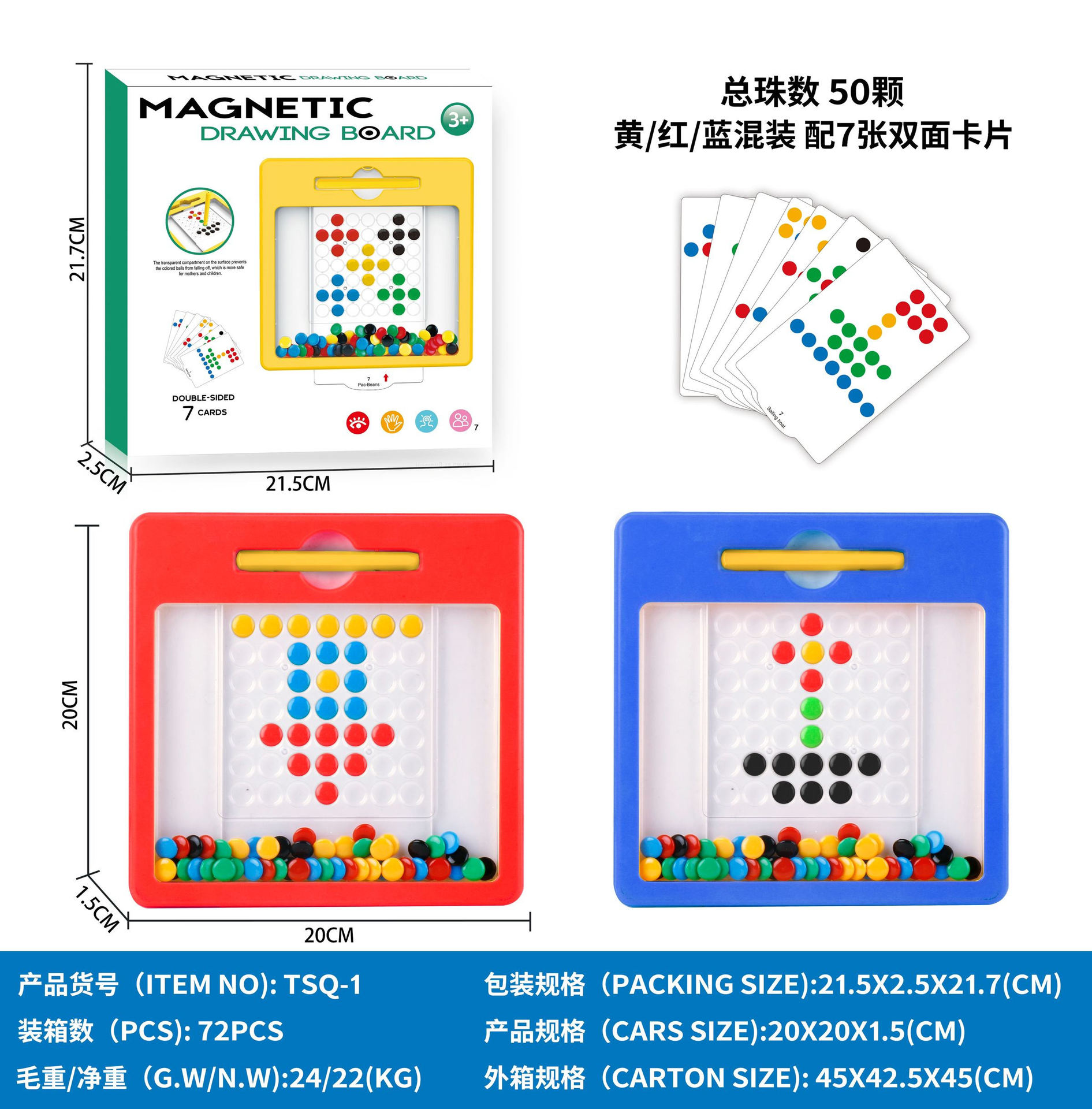 | TSQ-1(50珠) | 磁性绘画板1 | 20*2.5*20 | 52*42.5*45 | 密封盒 | 24 | 22 | 72 | 黄/红/蓝 混装(单笔)配7张侧面插卡.卡片 |