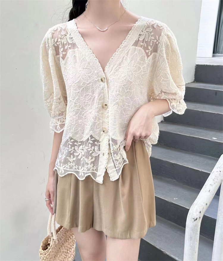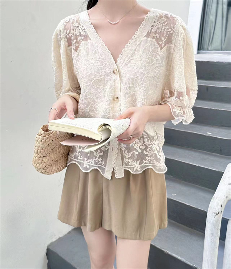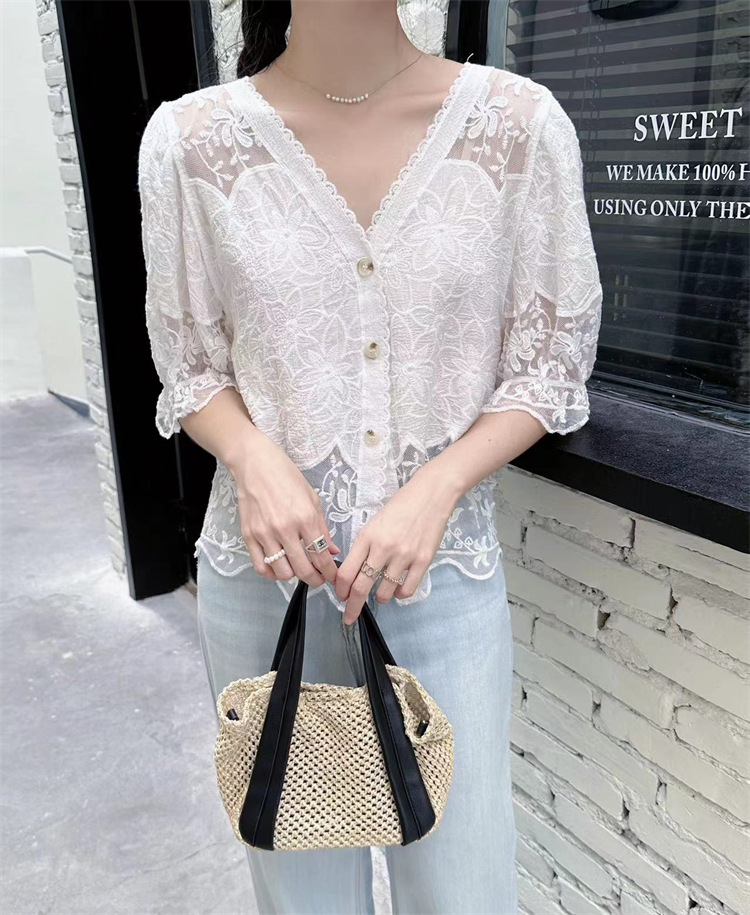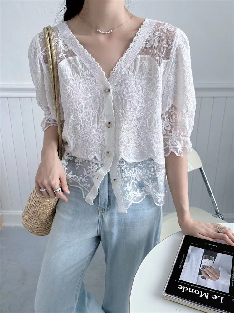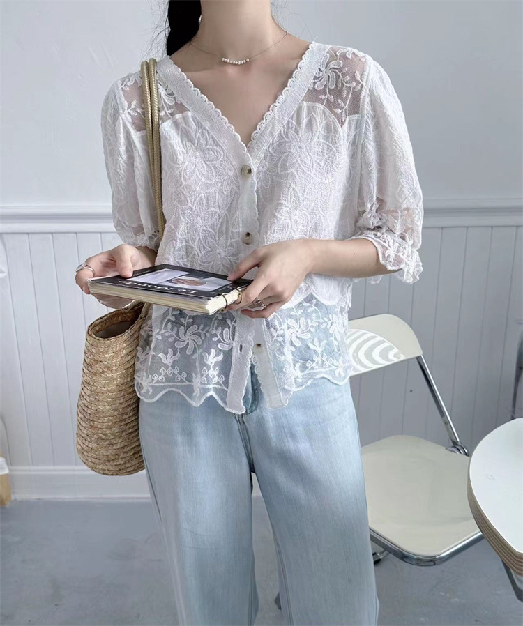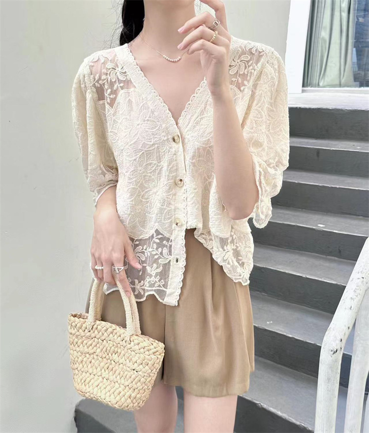 쉬폰 레이스 니트 가디건 반팔 자수 중공 여성용 탑 여름 얇은 보헤미안 에스닉 스타일 여성