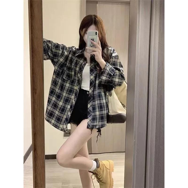 격자 무늬 셔츠 여성의 가을 파워 웨어 게으른 스타일 디자인 감각 느슨한 셔츠 긴팔 탑 가디건 재킷스토어 가기