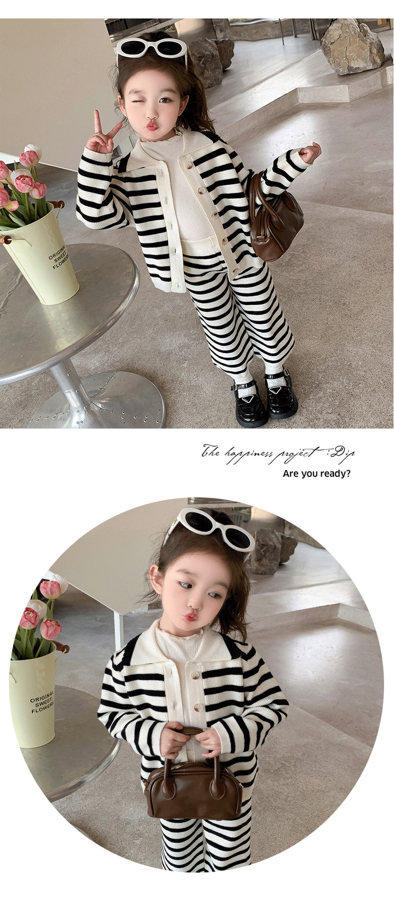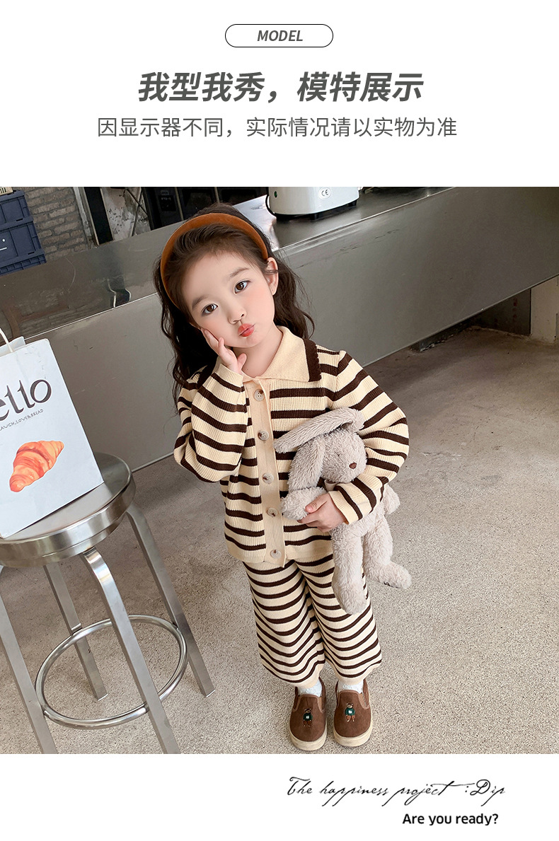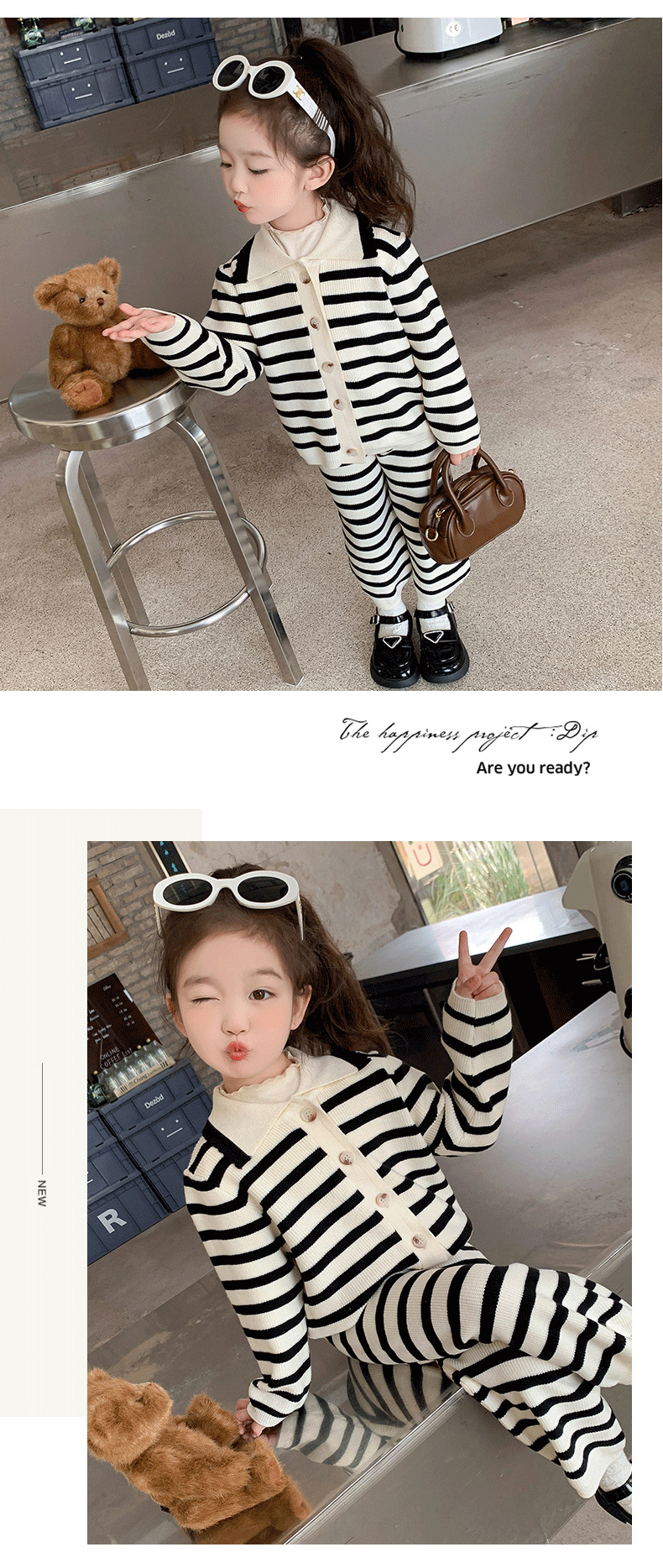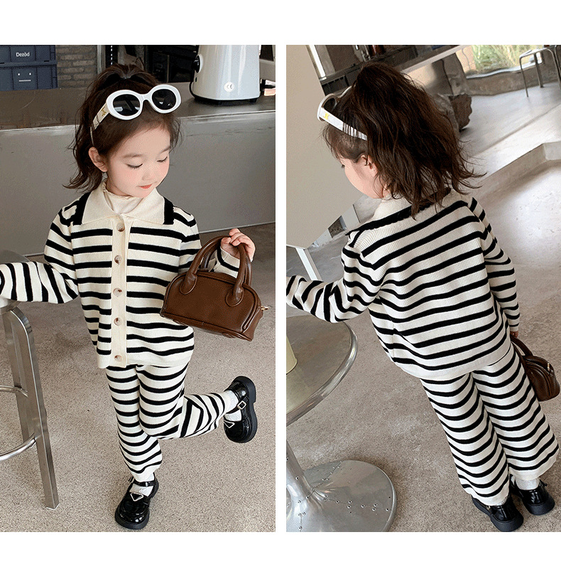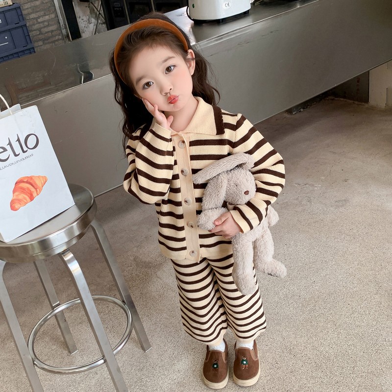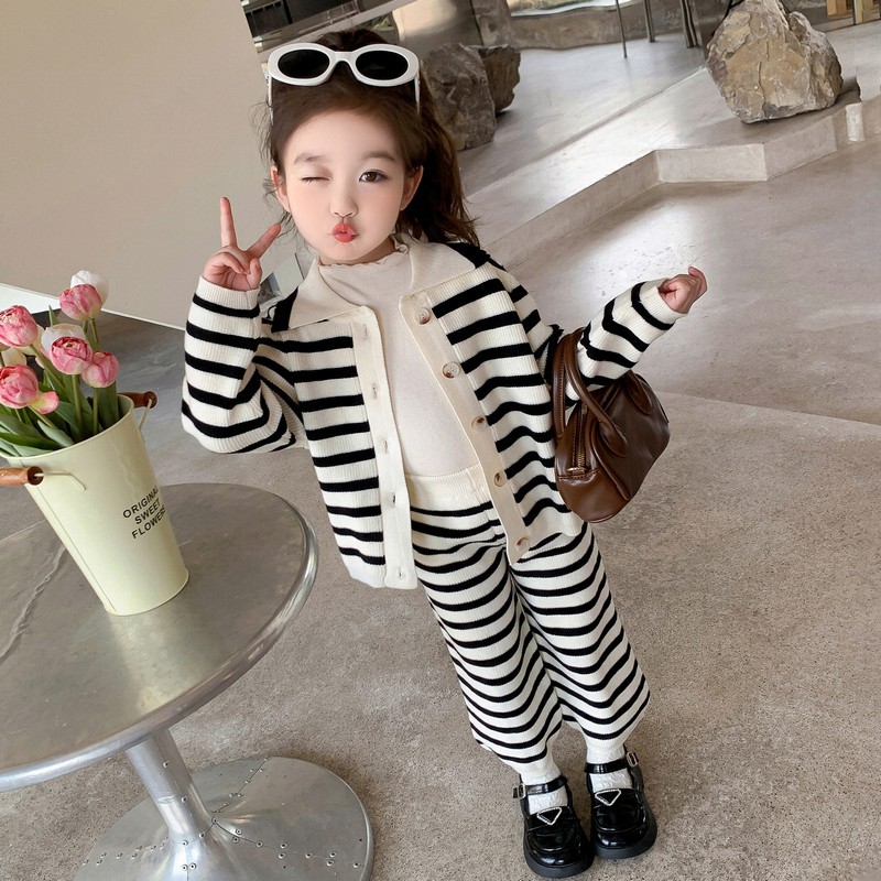 아기 소녀 스트라이프 스웨터 가디건 세트 가을 2023 새로운 소녀 세련된 한국 투피스 트렌디스토어 가기