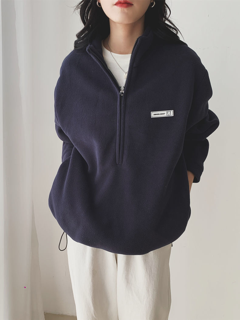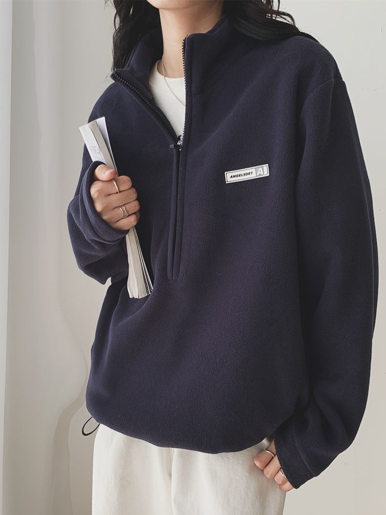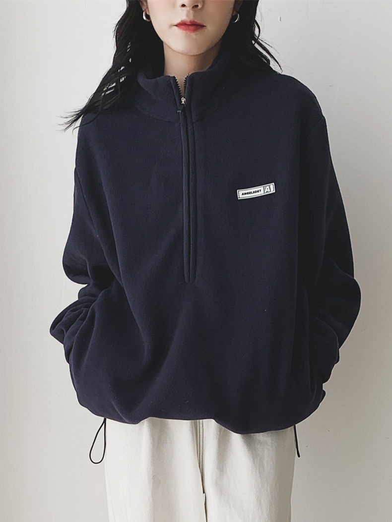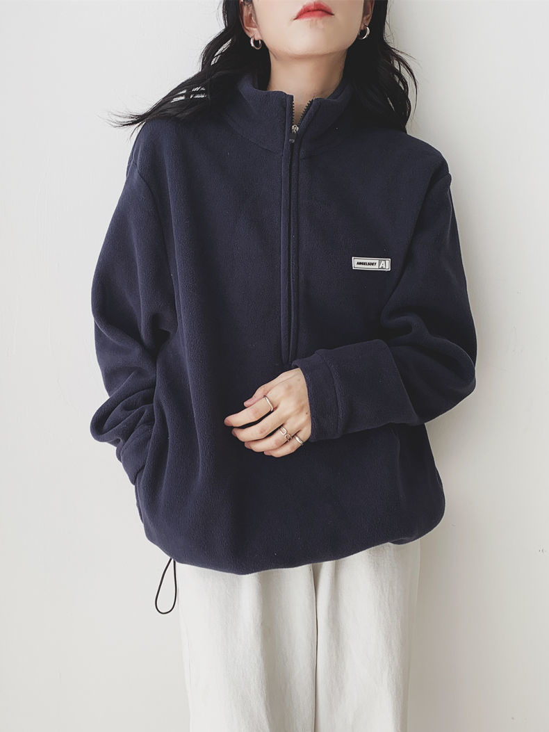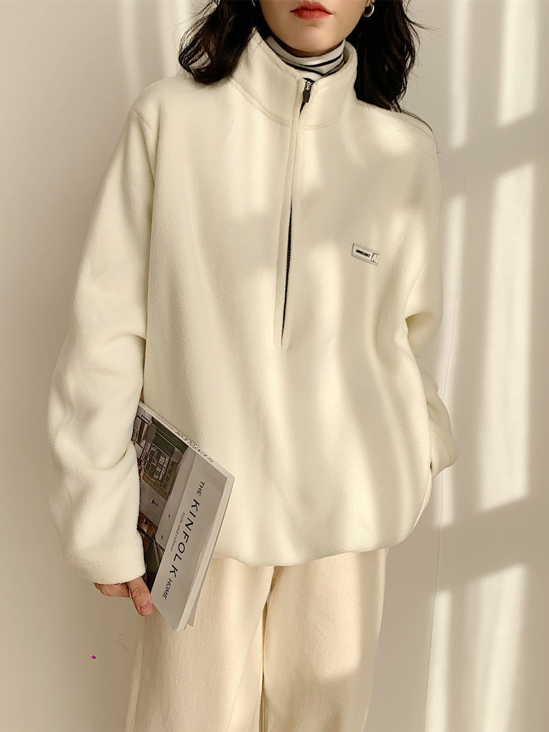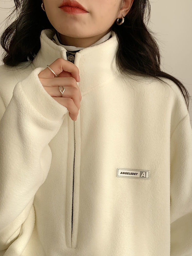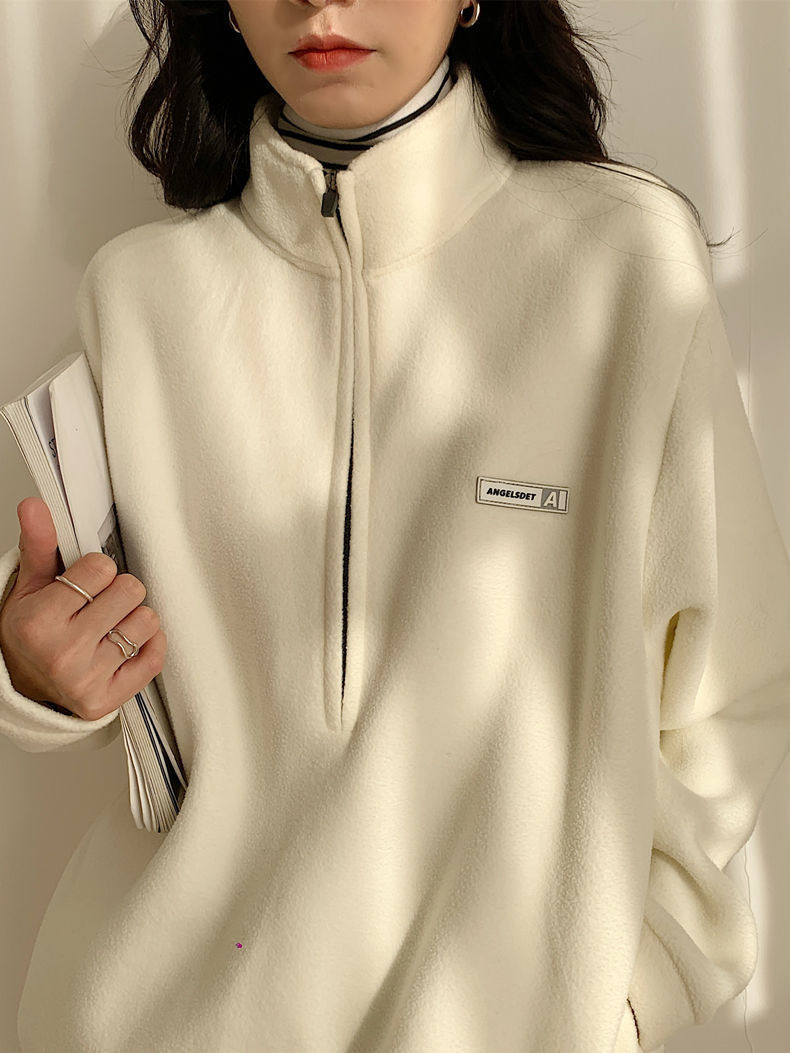 아마존 공급 폴라 플리스 자켓 여성용 2024 가을 스타일 루즈핏 아메리칸 스타일 플리스 안감 두꺼운 스탠드 칼라 풀오버 스웨트셔츠스토어 가기