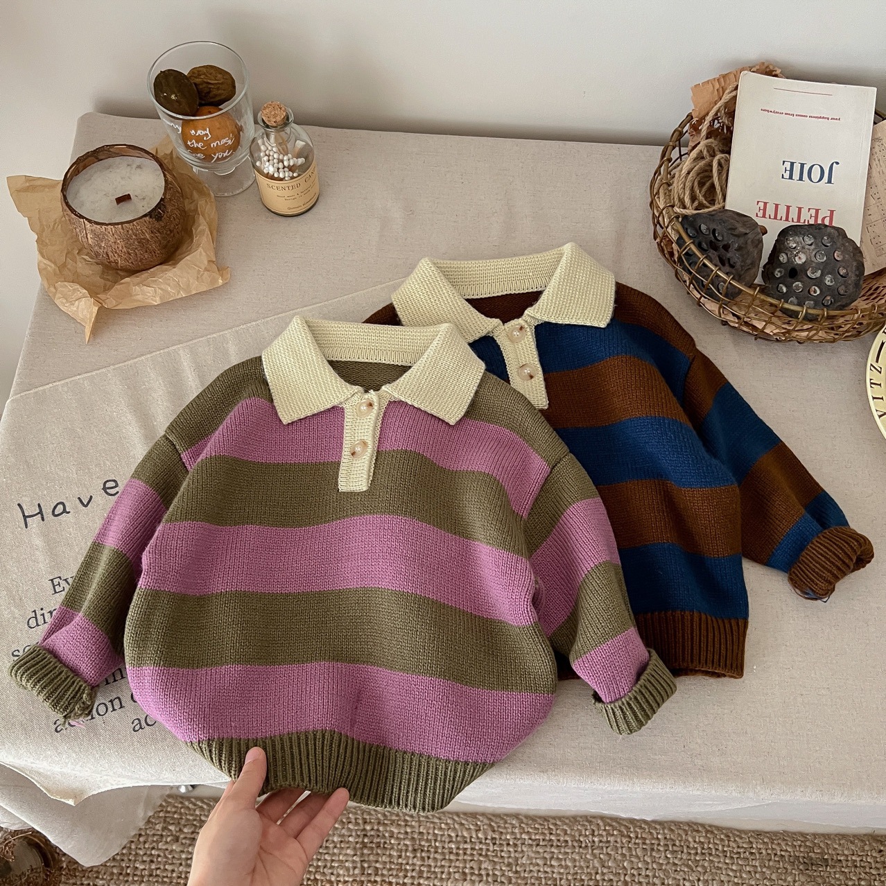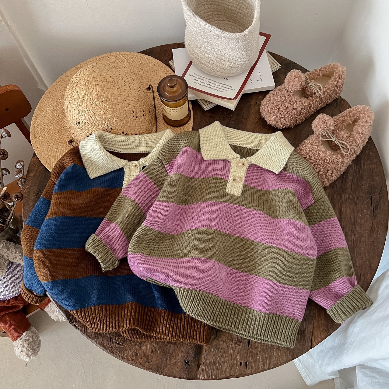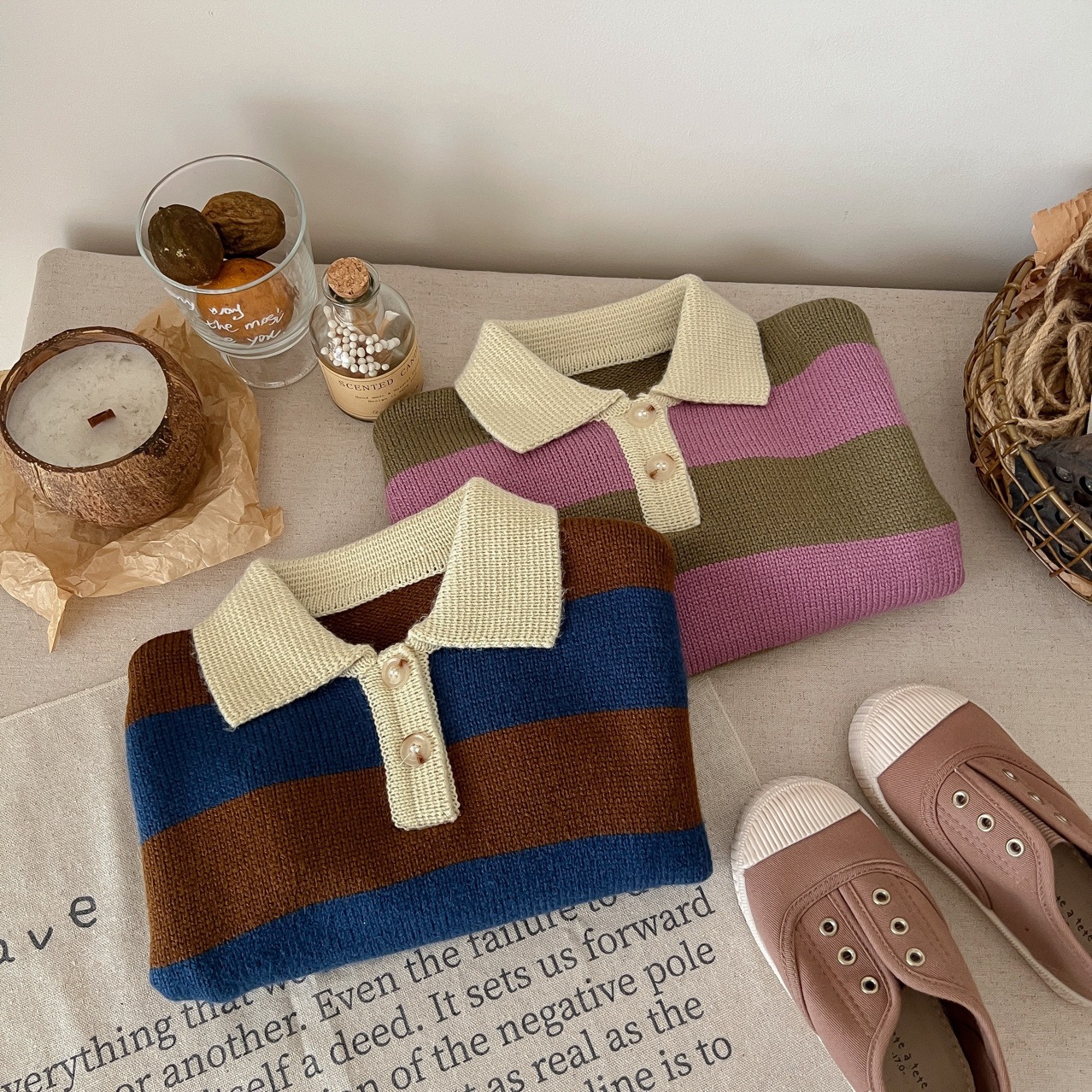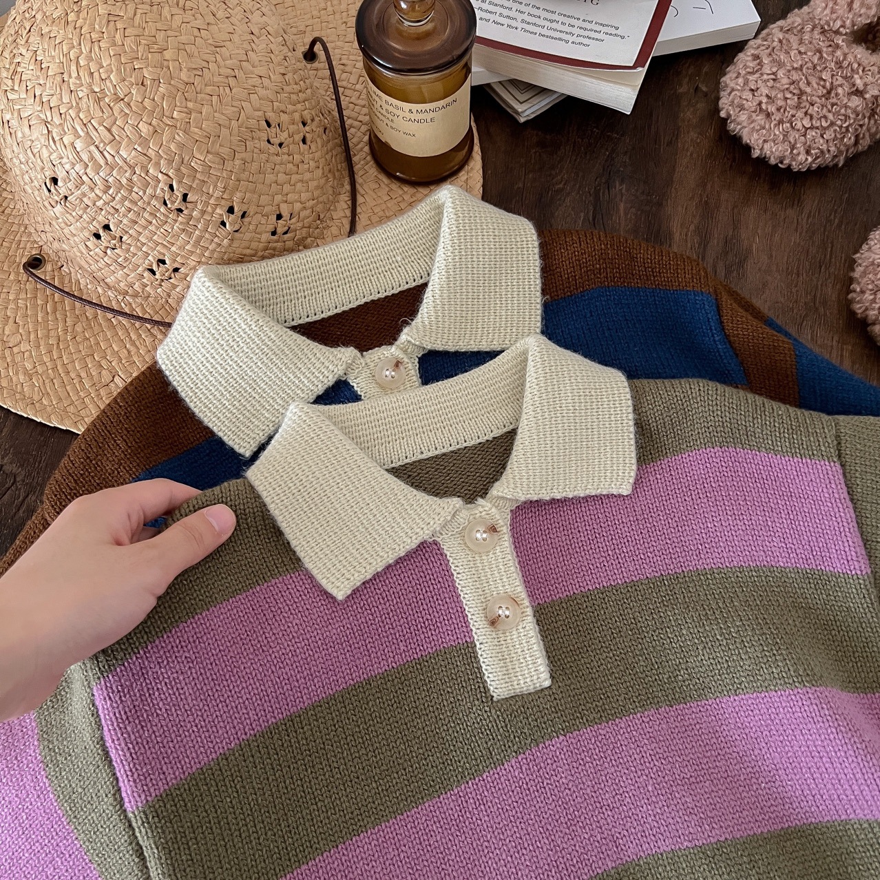 Mi Yaduo 한국식 아동 스웨터 남아 니트 스웨터 여아 코트 베이비 스트라이프 라펠 폴로 셔츠 봄과 가을
