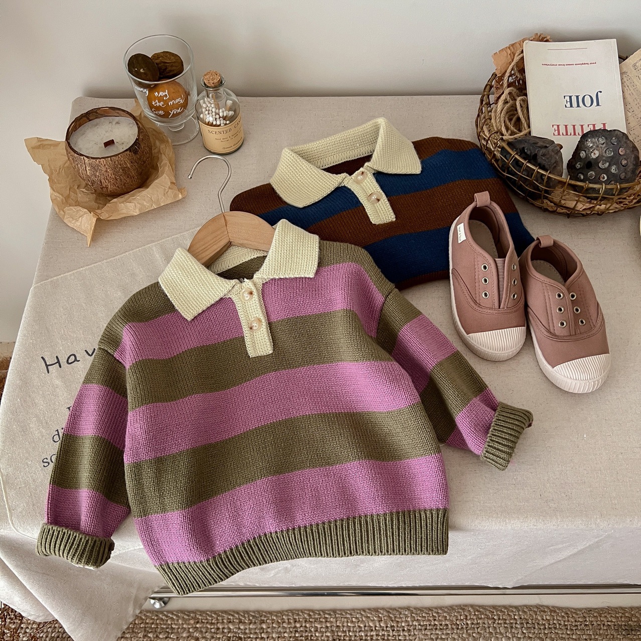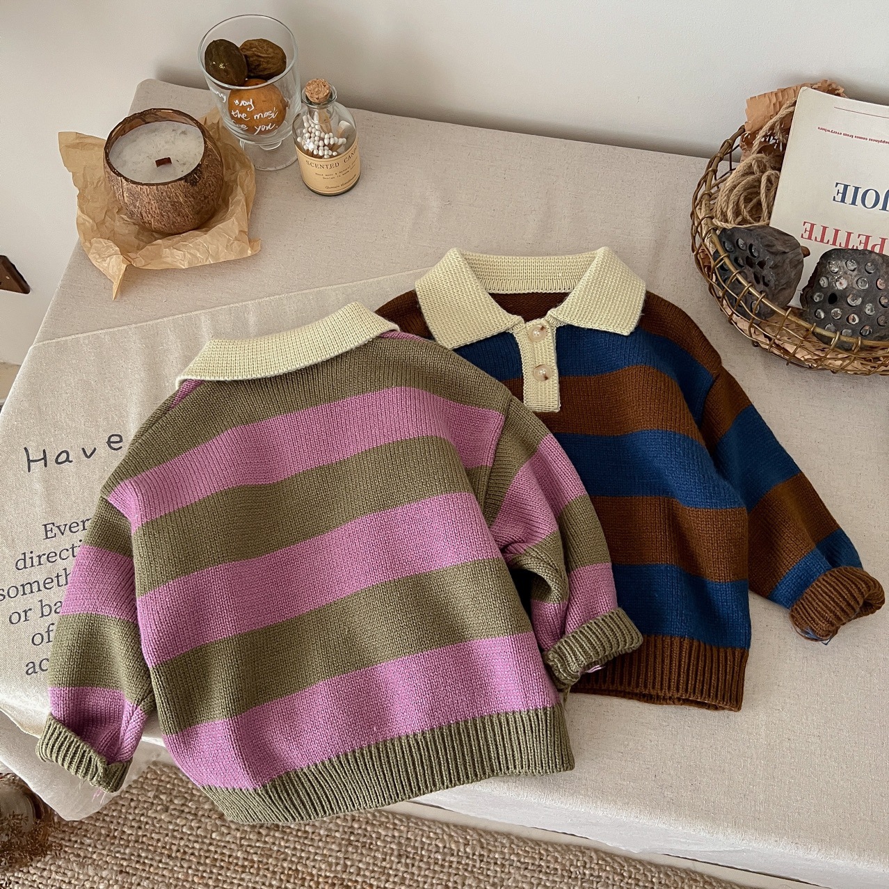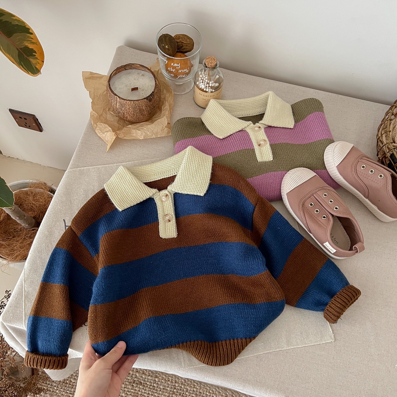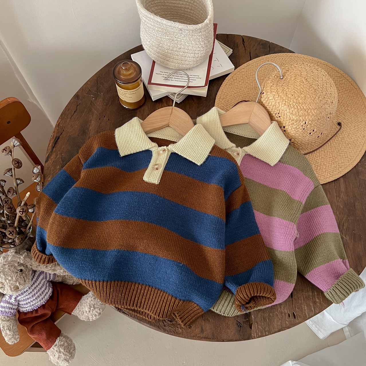Mi Yaduo 한국식 아동 스웨터 남아 니트 스웨터 여아 코트 베이비 스트라이프 라펠 폴로 셔츠 봄과 가을