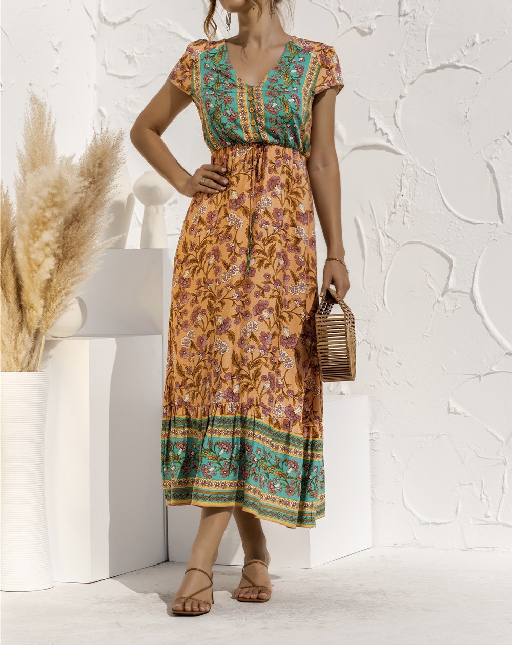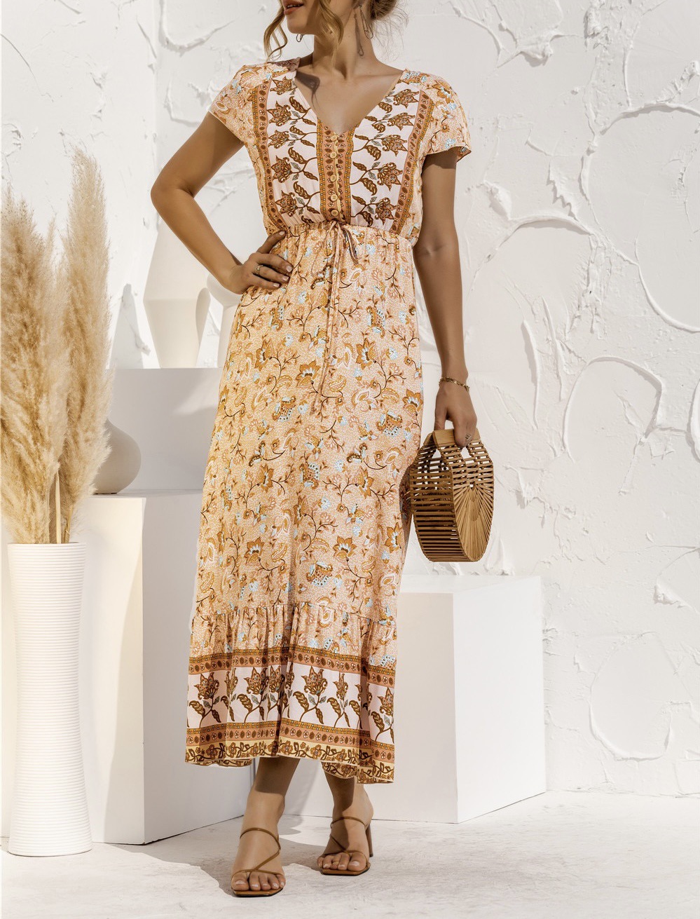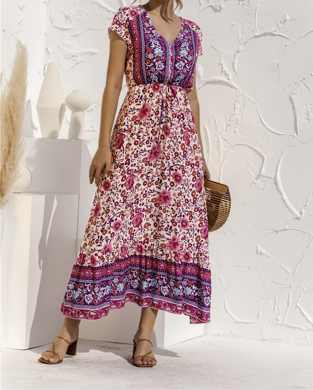 봄/여름 2023 크로스 보더 eaby 아마존 폭발 반팔 버튼 레이스 업 포지셔닝 꽃 모자이크 원피스 원피스