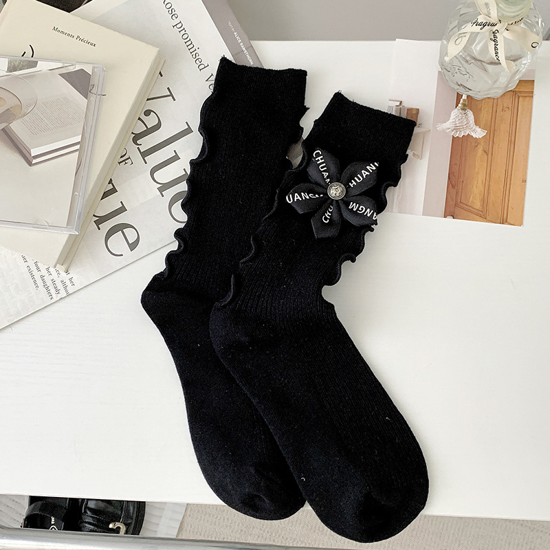 일본식 소녀 스타일 달콤한 우드 이어 사이드 파일 양말 여성용 봄과 가을 착용 작은 샤넬 스타일 보우 플라워 jk 중간 길이 양말스토어 가기