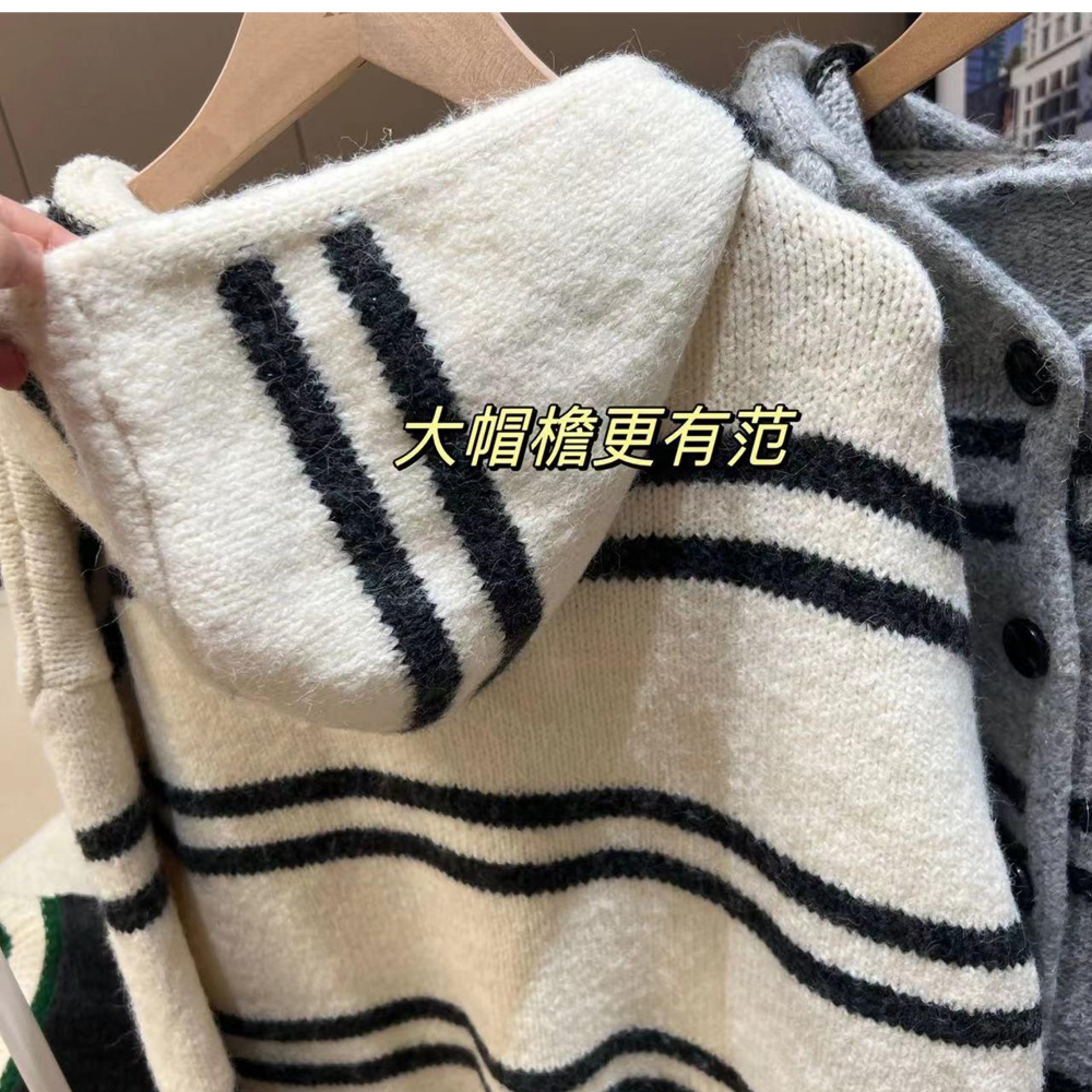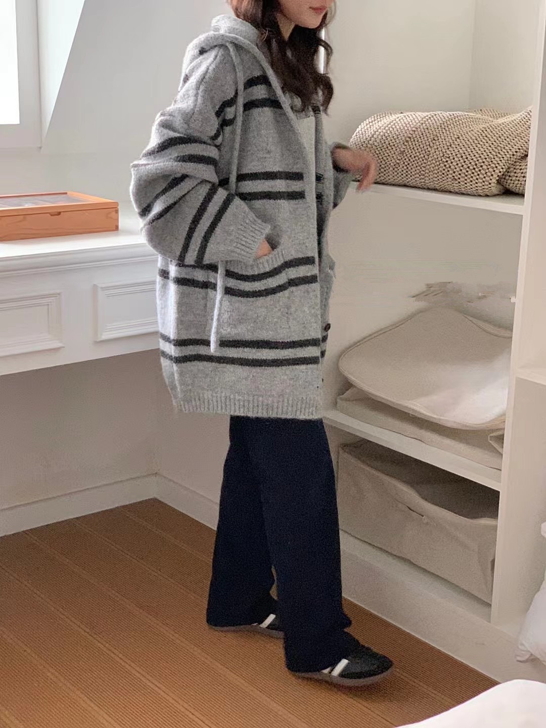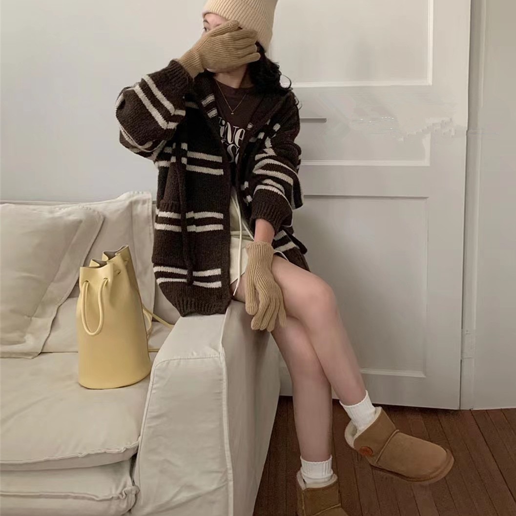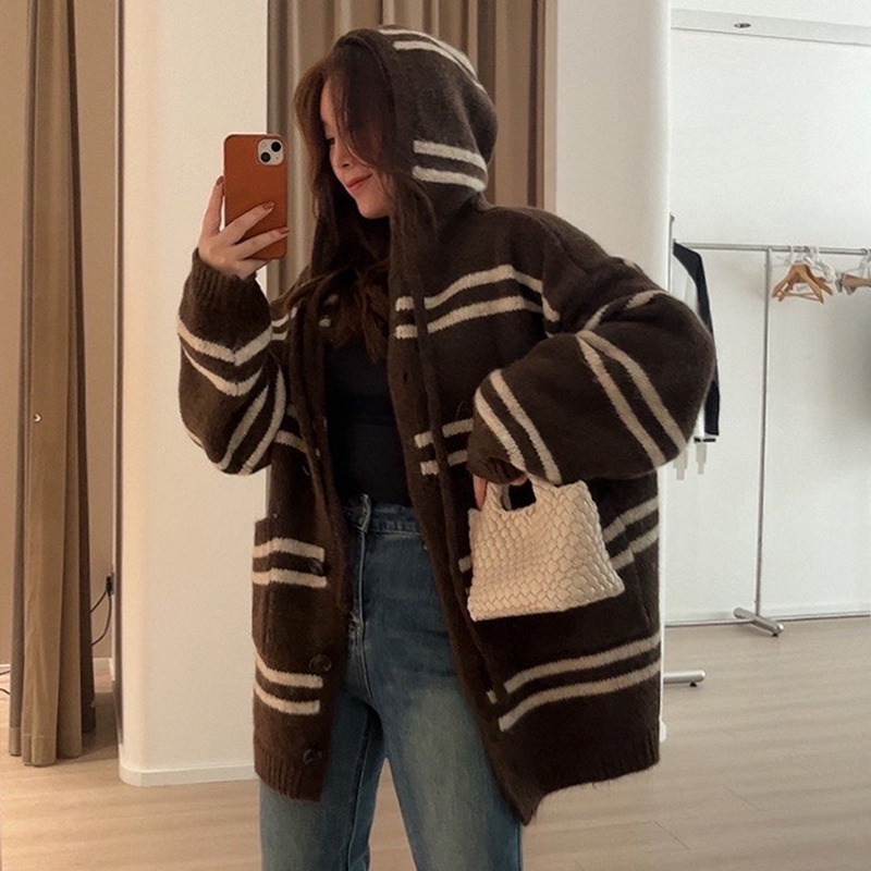 한국 스타일 가을과 겨울 새로운 후드 스트라이프 니트 카디건 여자의 최고 느슨한 게으른 스타일 플러스 사이즈 부드러운 왁스 스웨터 코트스토어 가기