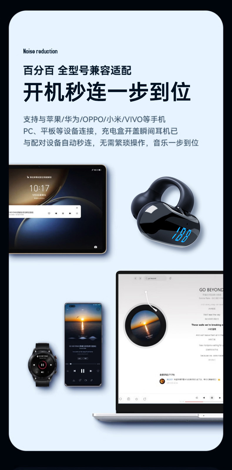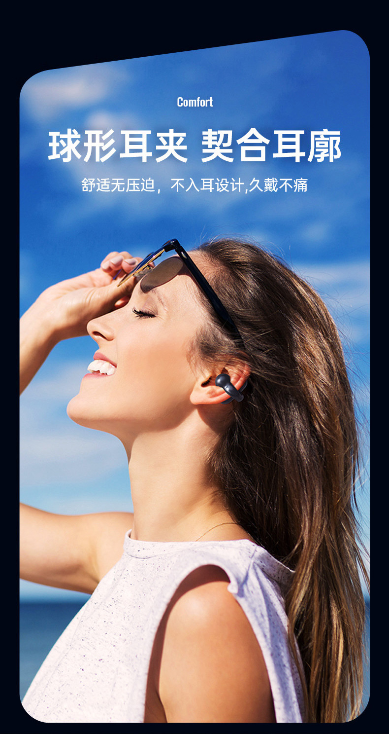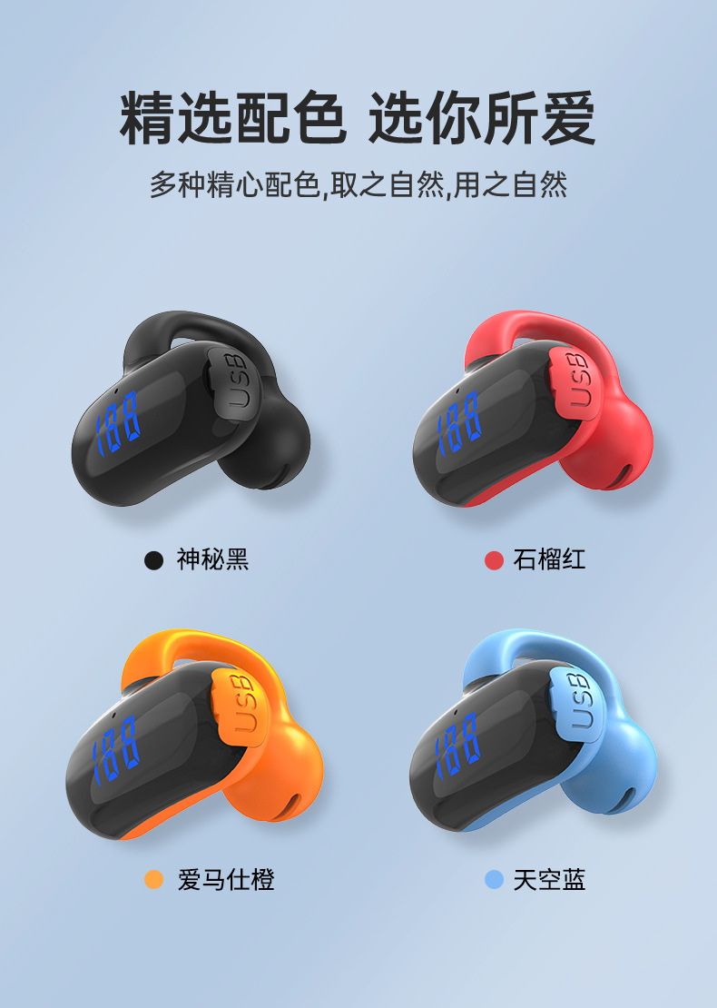产品卖点:不入耳久戴不痛,大容量电池超长续航可以连续听歌20小时,带实时电量显示