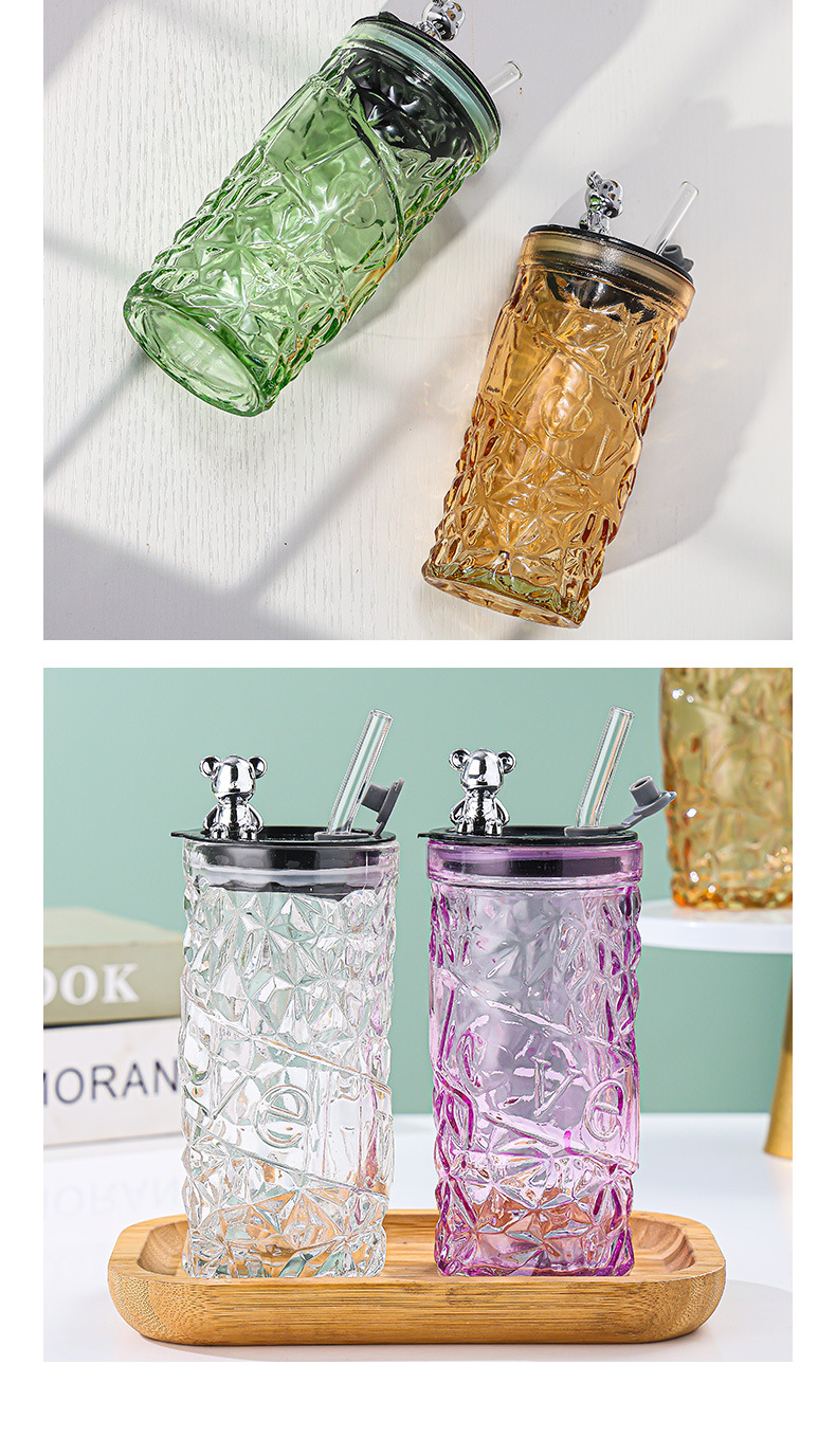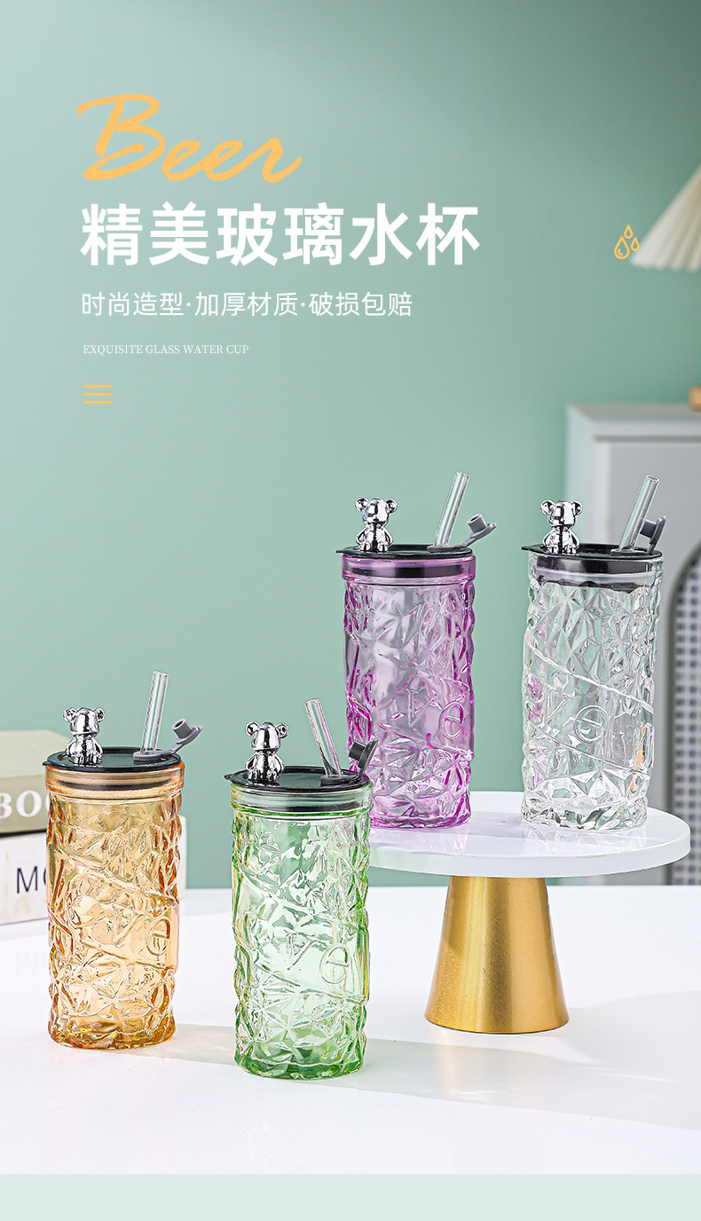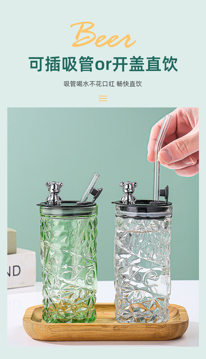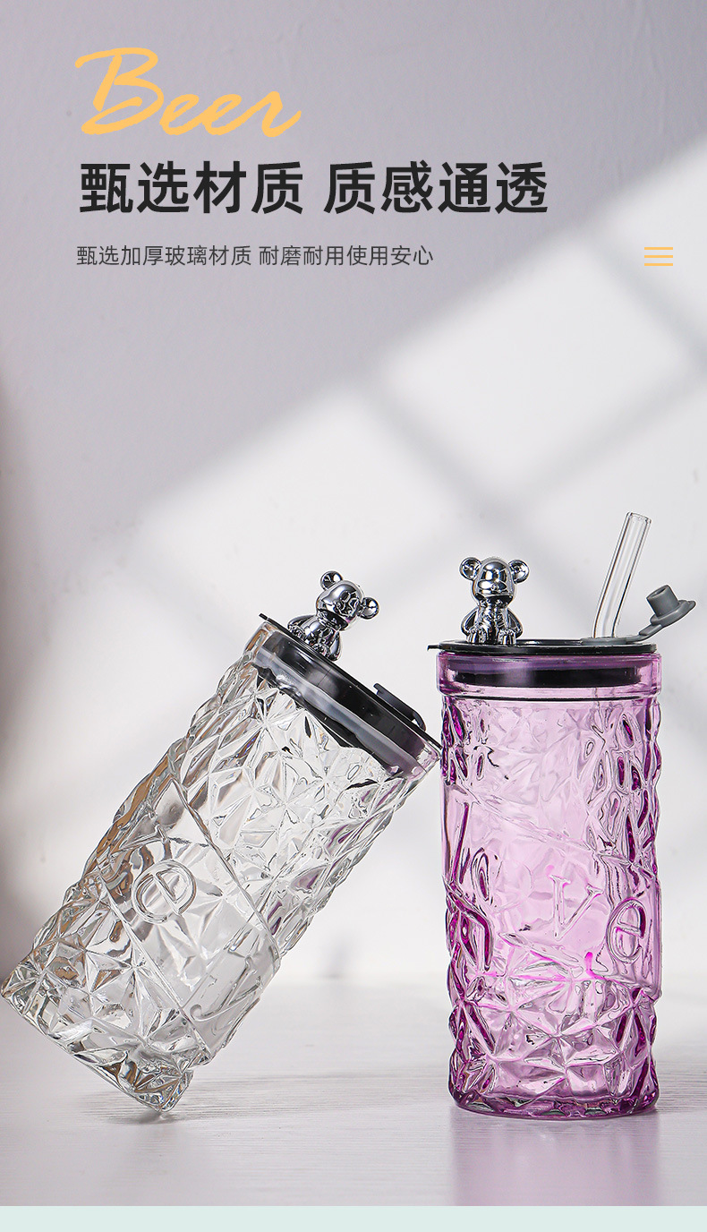 새로운 스타일의 유리컵, 창의적이고 귀여운 곰돌이 물컵, 멋스러운 사무실 가정용 뚜껑 달린 빨대컵, 선물용 컵스토어 가기