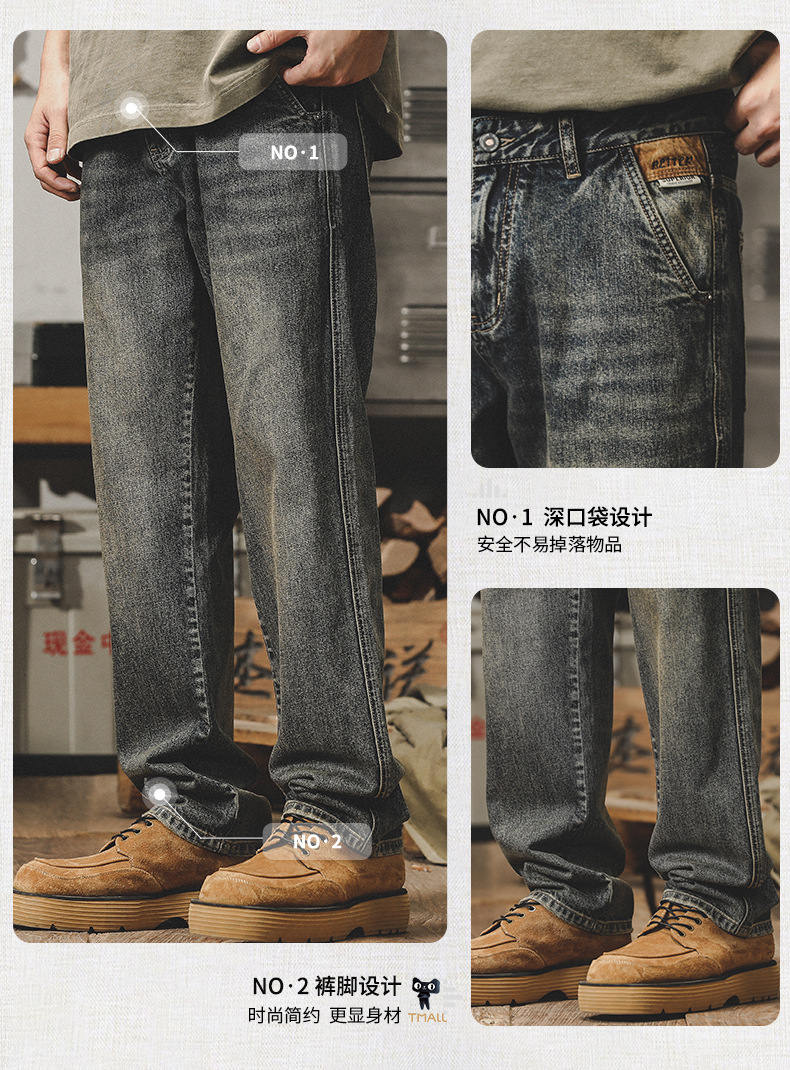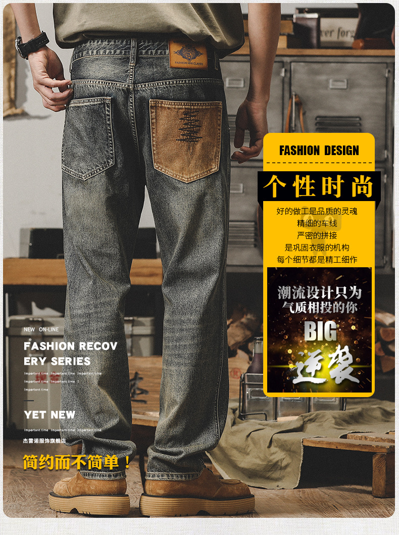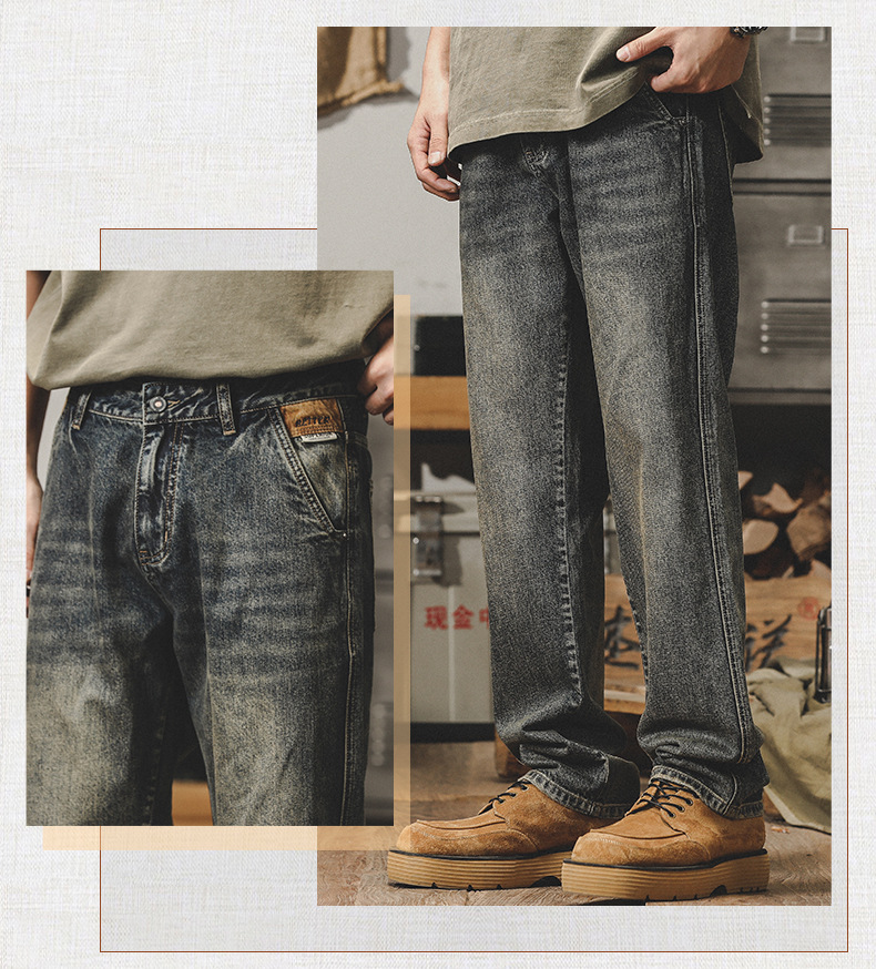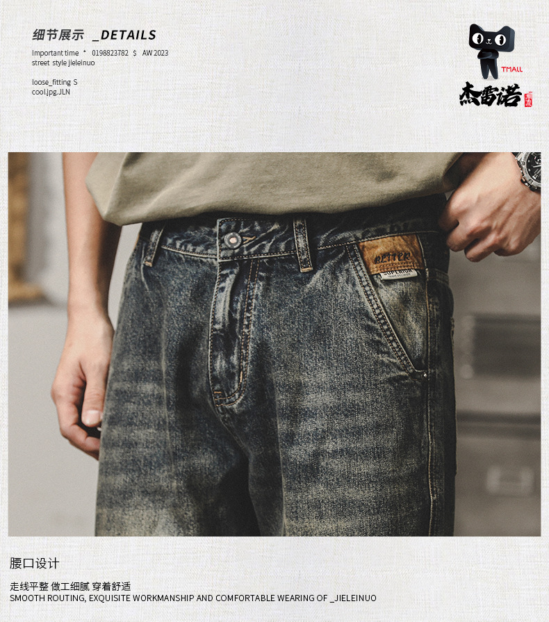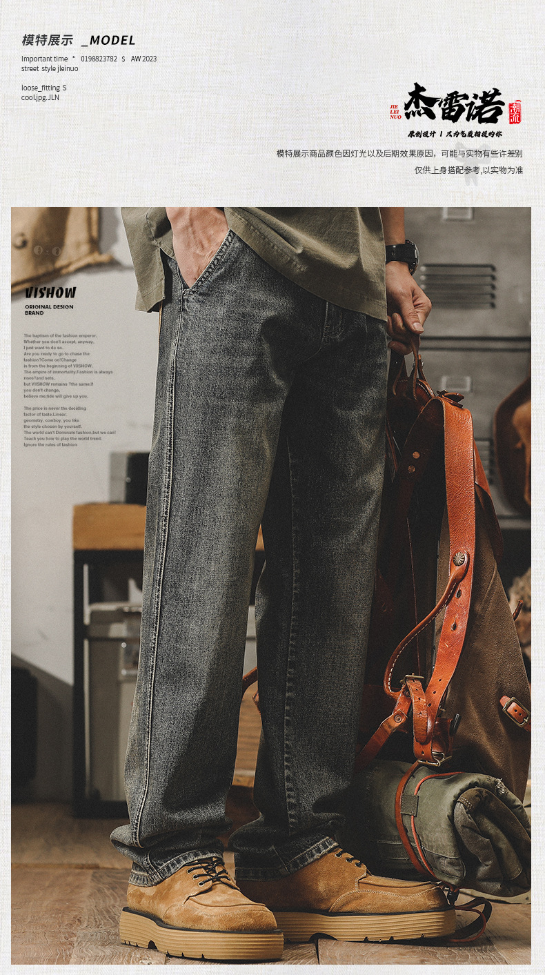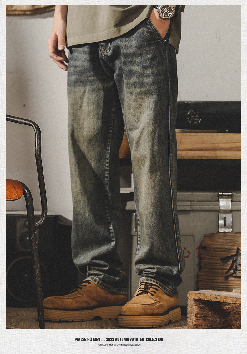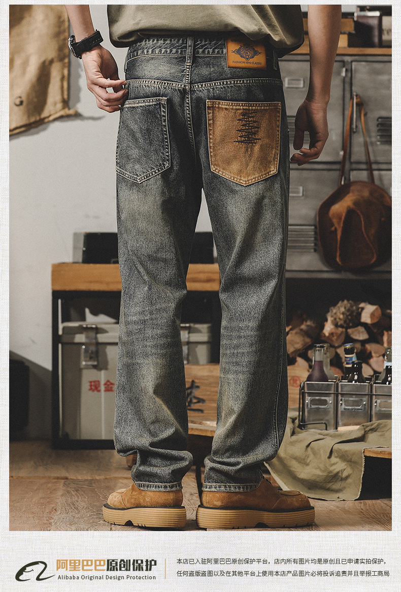 제이 레노 아메리칸 스타일 클래식 레트로 청바지 남성용 느슨한 스트레이트 옐로우 머드 염료 사용 바지 남성용 봄과 가을 유행 브랜드스토어 가기