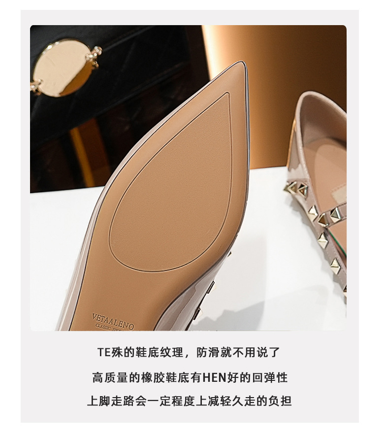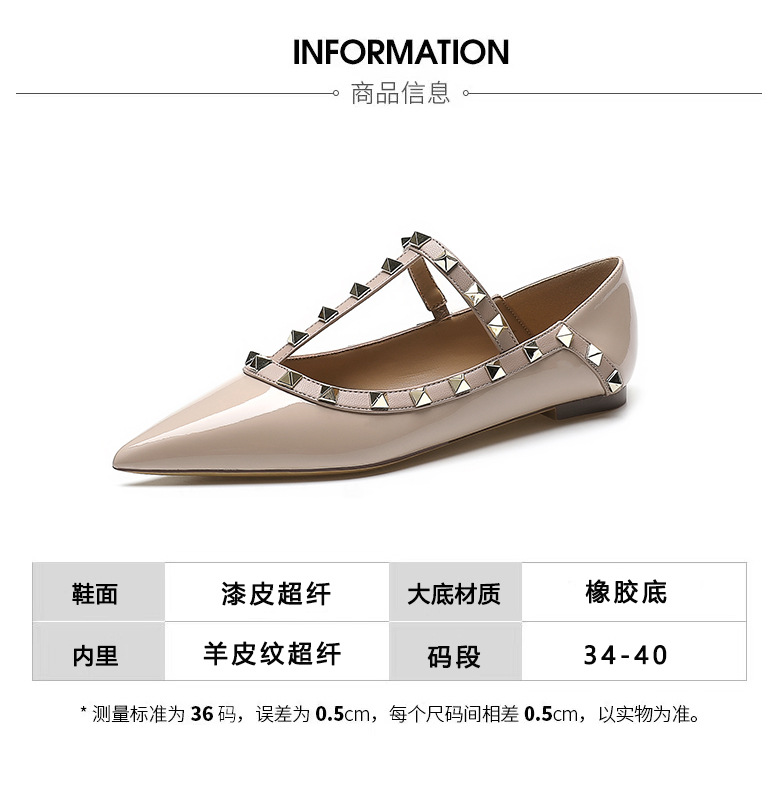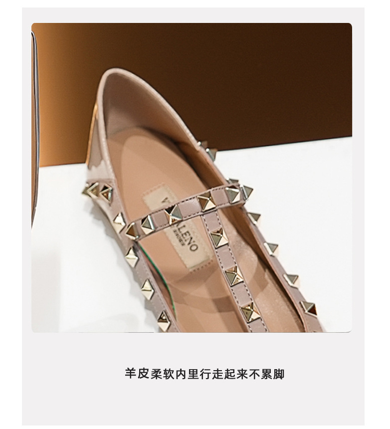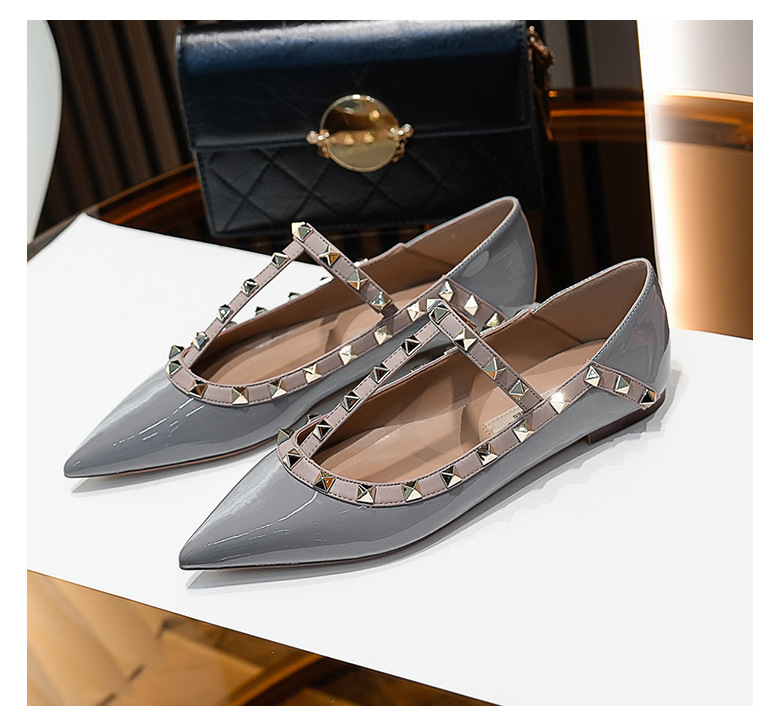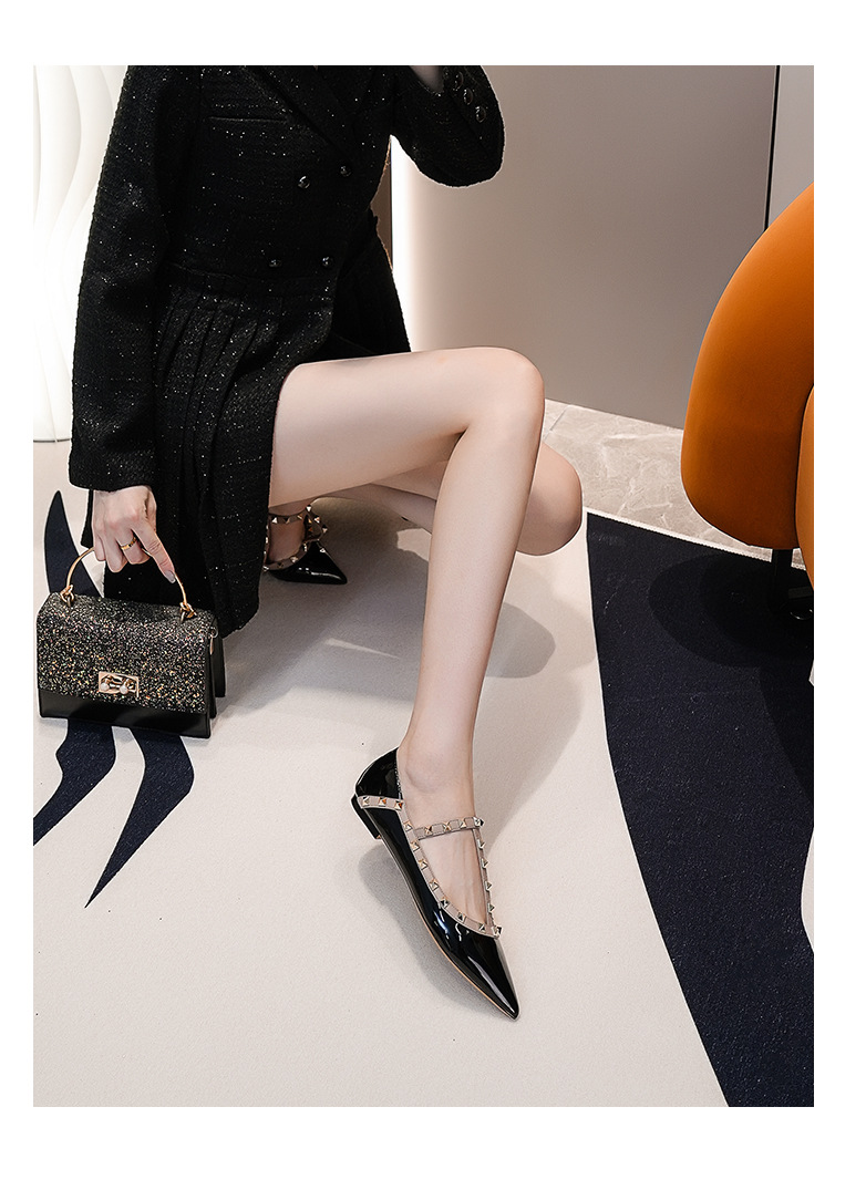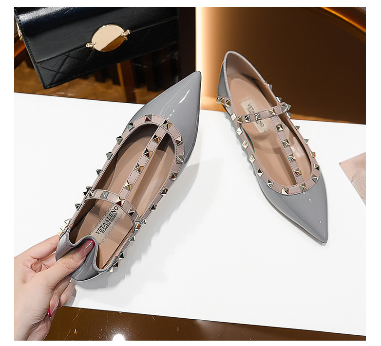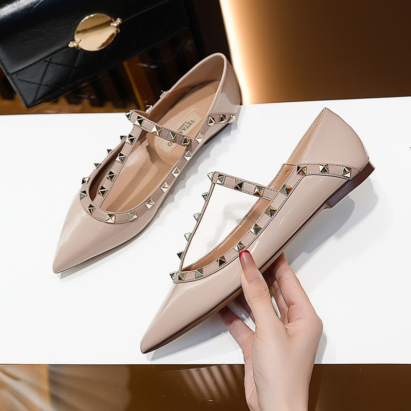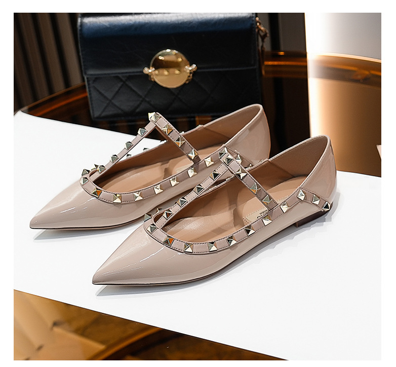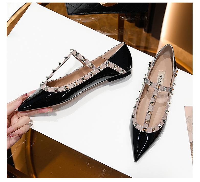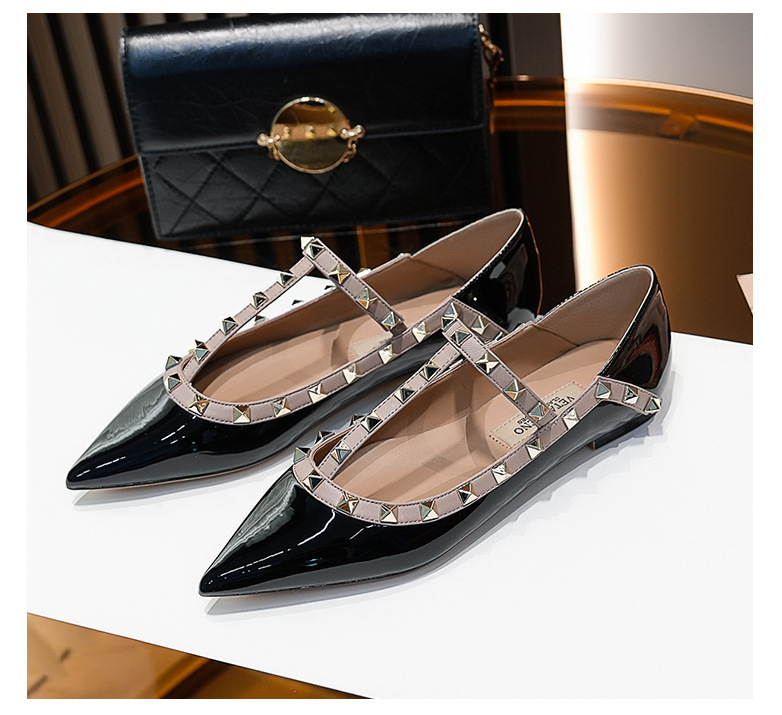 2025 봄 여름 신상 특허 가죽 스트랩 리벳 플랫 슈즈 포인티드 토 펌프스 소프트 소프트 바닥 V 여성용 신발스토어 가기