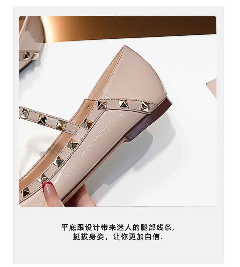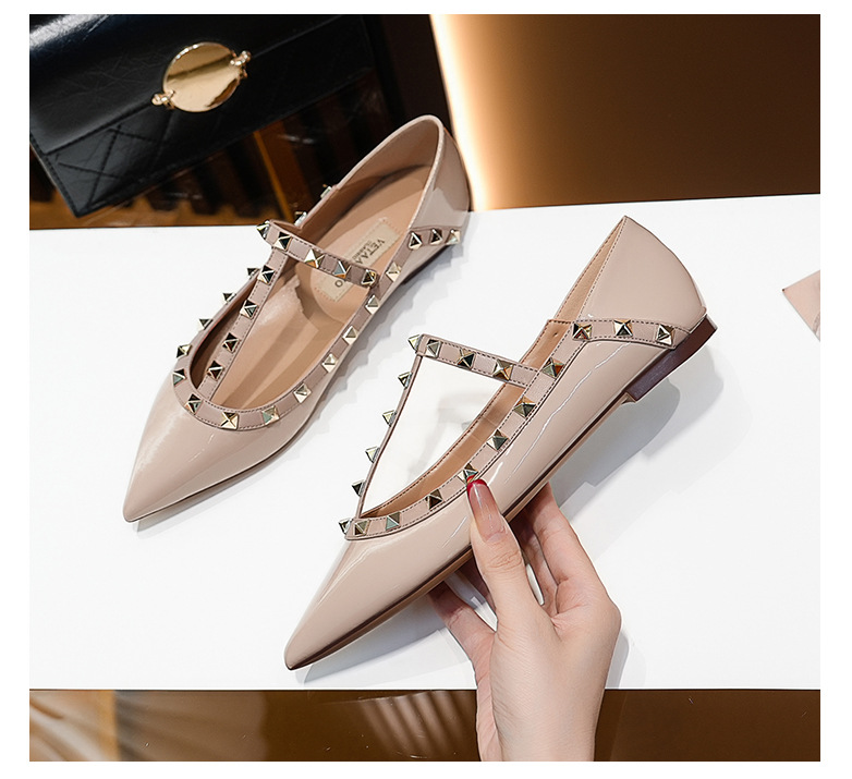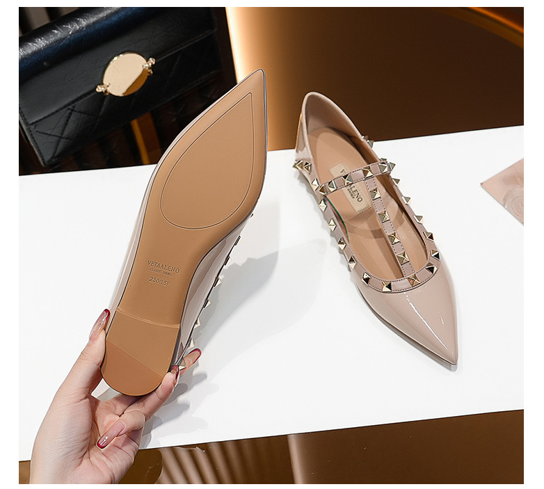 裸色尖头单鞋女2024春季浅口漆皮百搭欧美软底船鞋平底铆钉鞋通勤