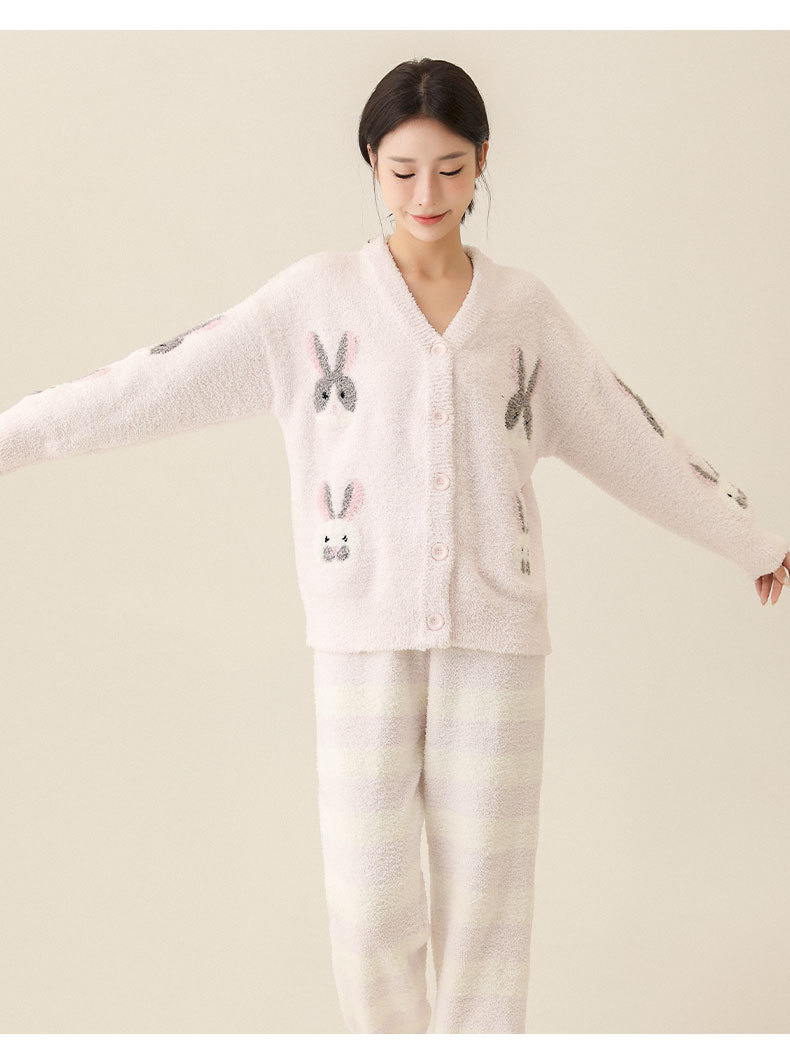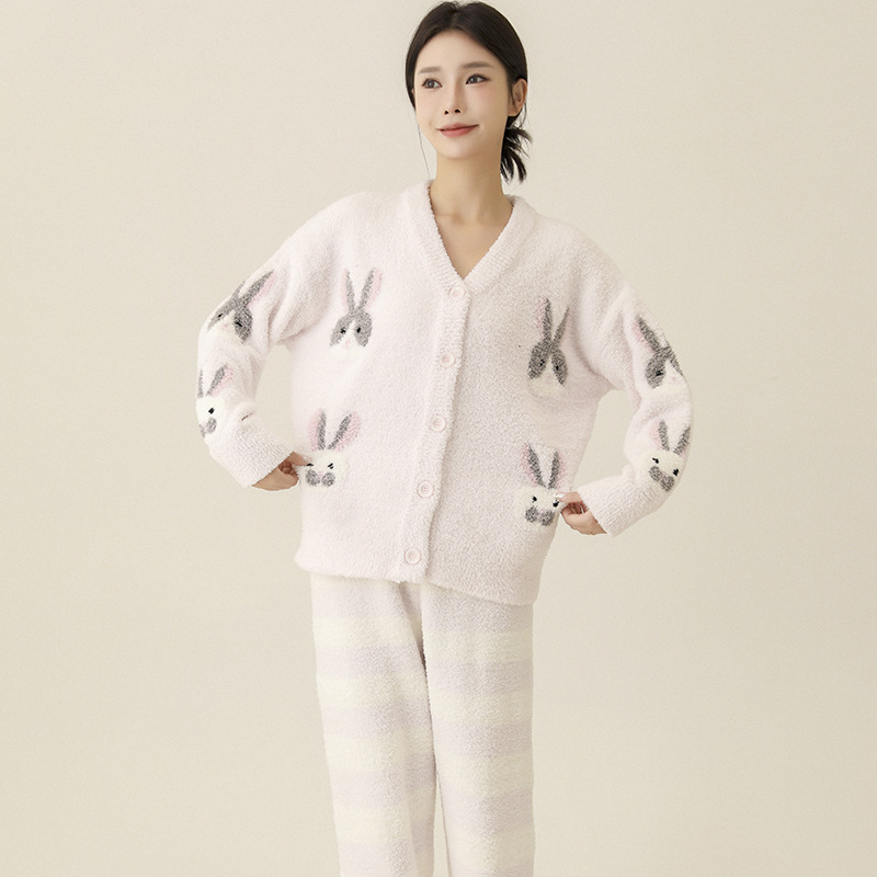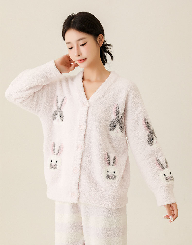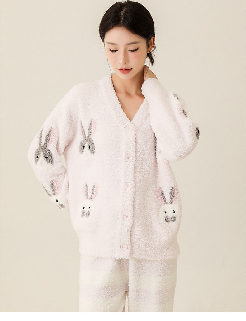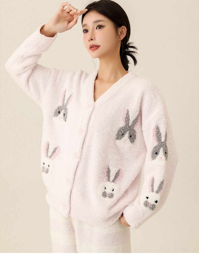 일본식 부드러운 가을과 겨울 만화 귀여운 토끼 잠옷 가디건 따뜻한 두꺼운 겨울 빈 느슨한 피부 친화적 인 가정복
