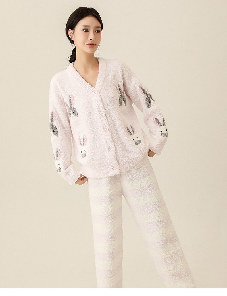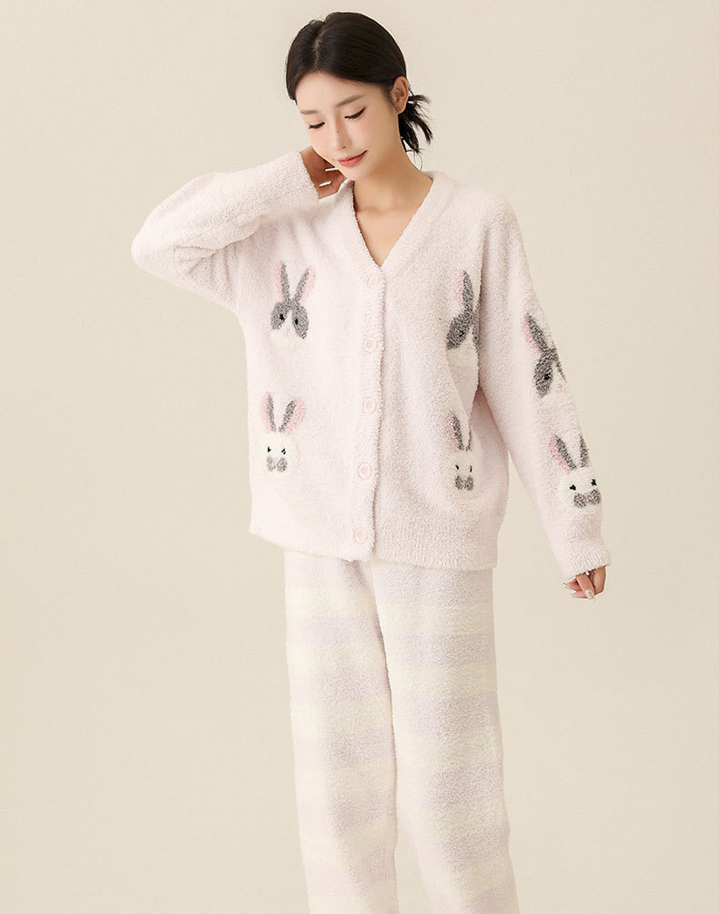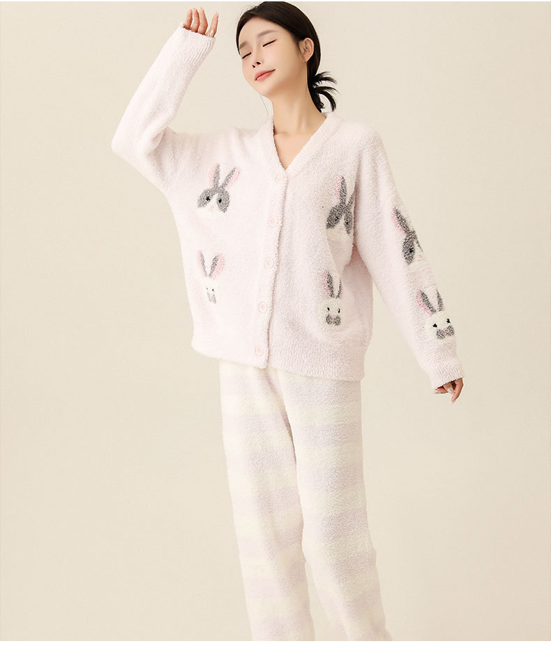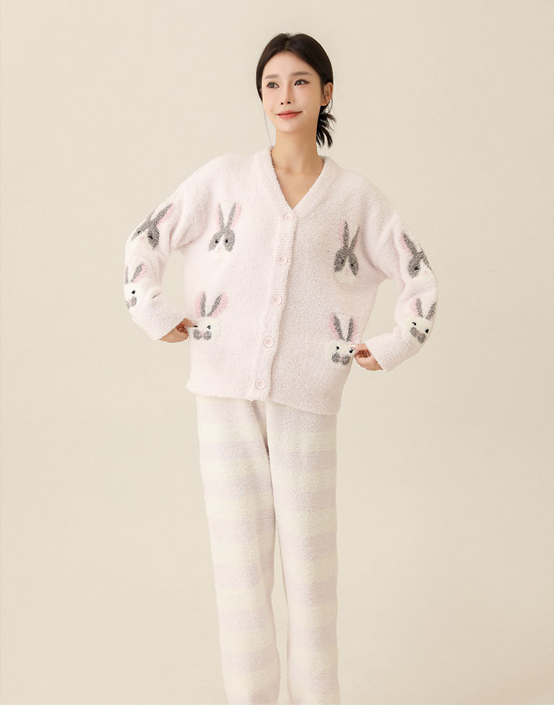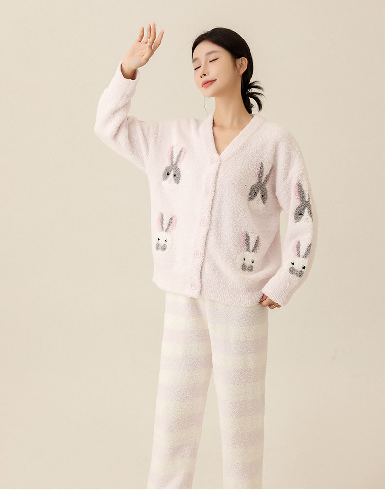 일본식 부드러운 가을과 겨울 만화 귀여운 토끼 잠옷 가디건 따뜻한 두꺼운 겨울 빈 느슨한 피부 친화적 인 가정복