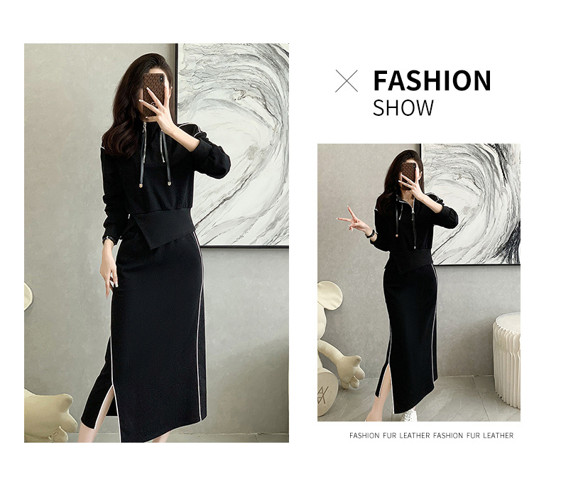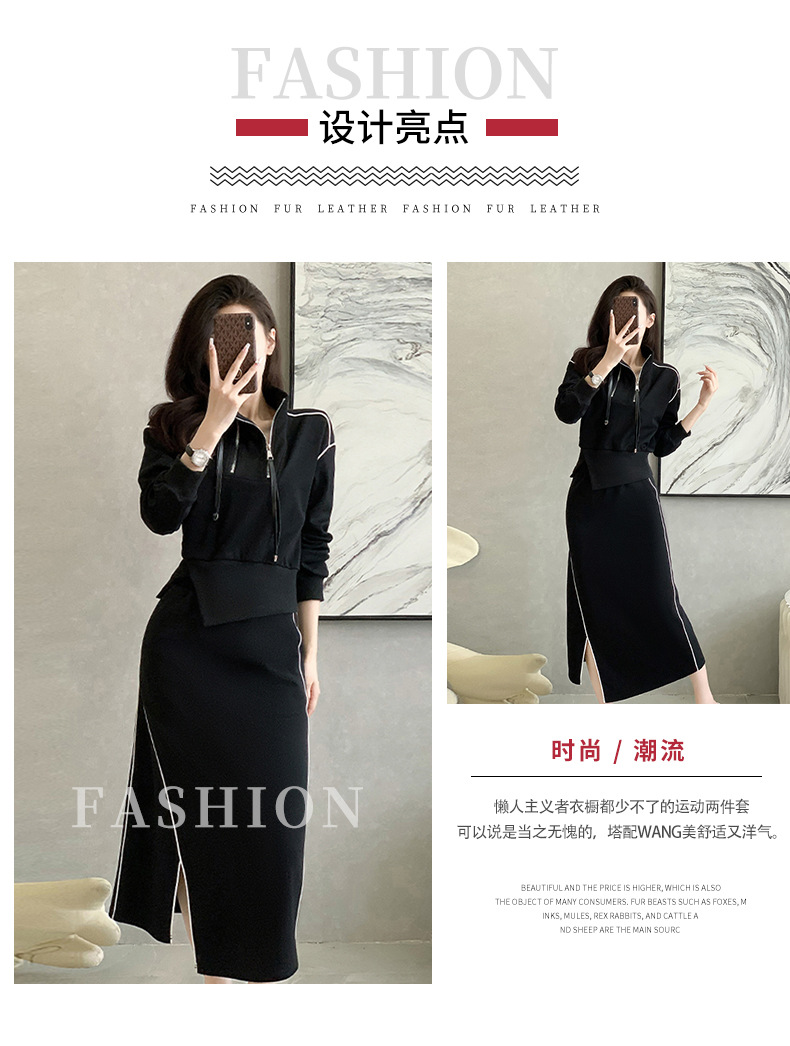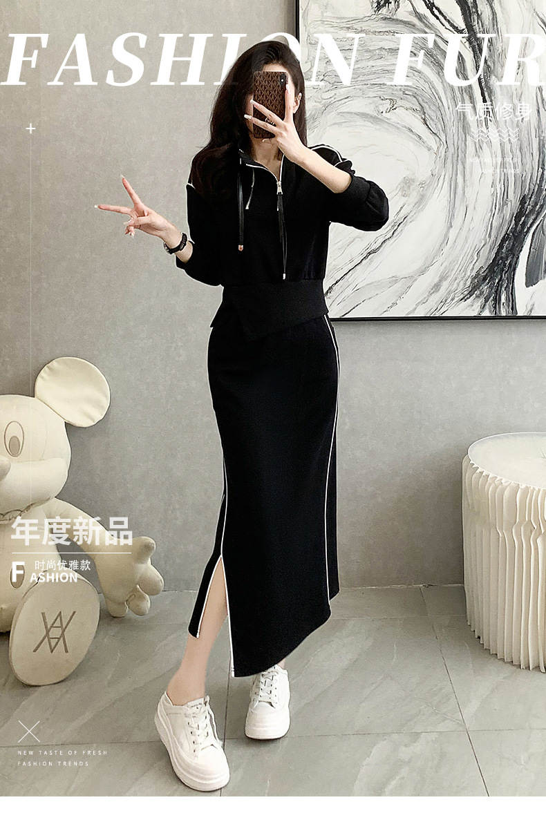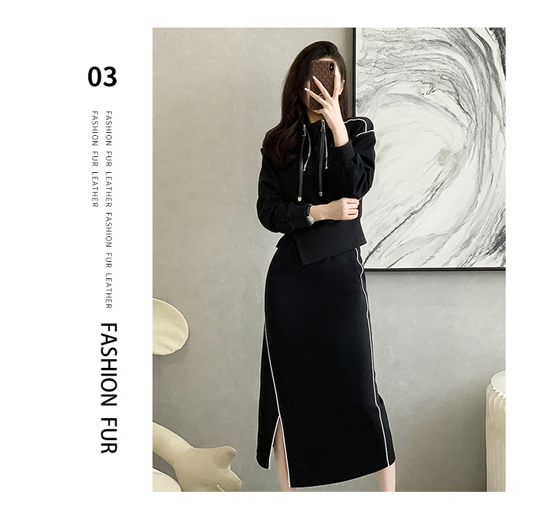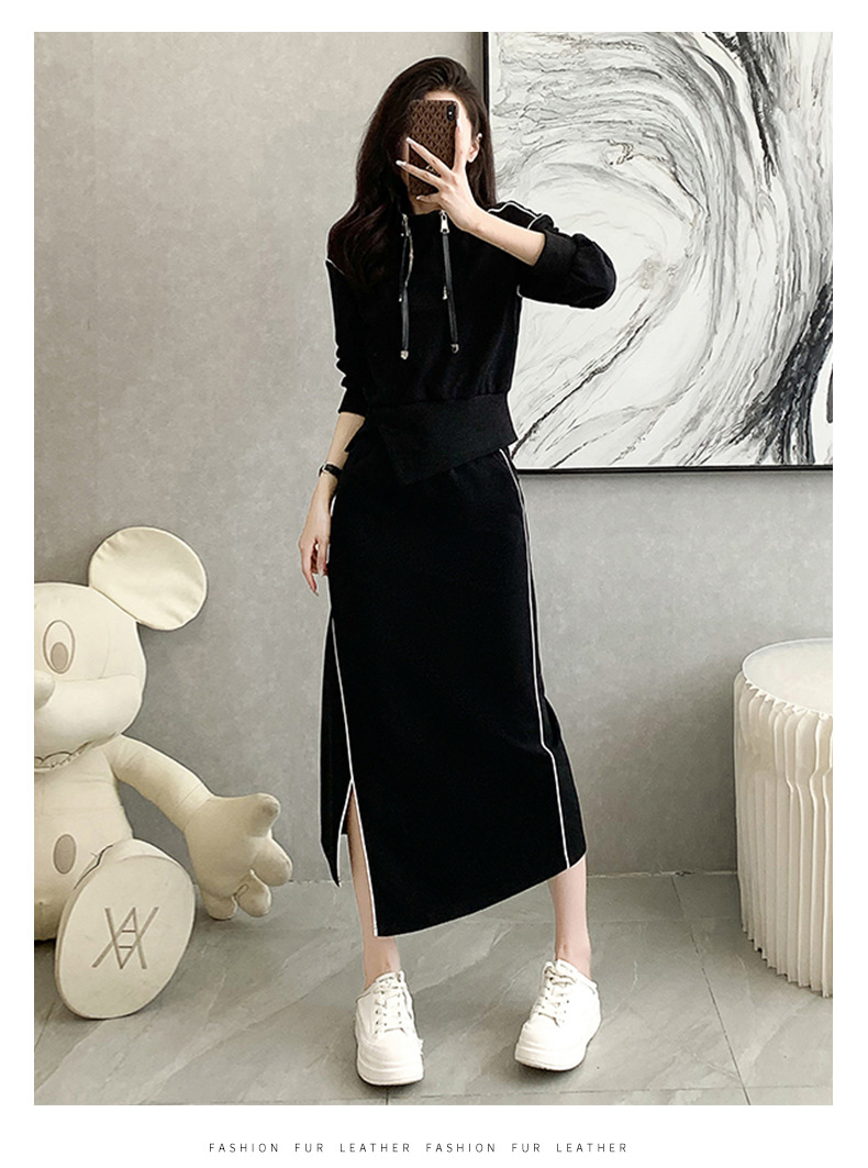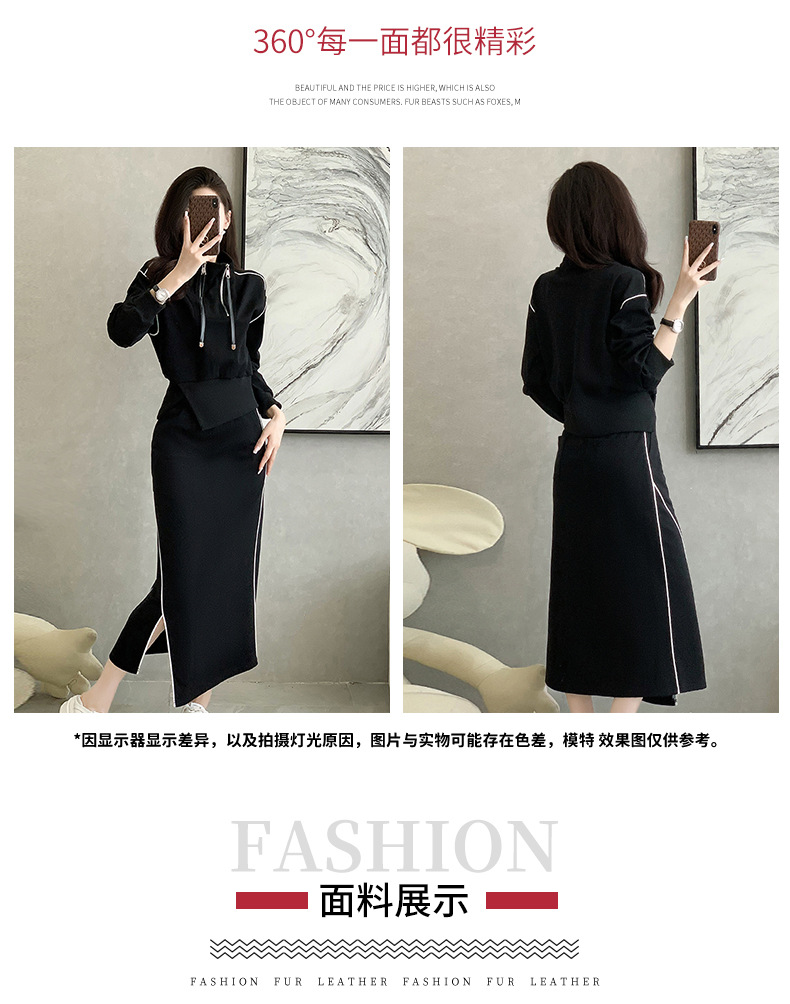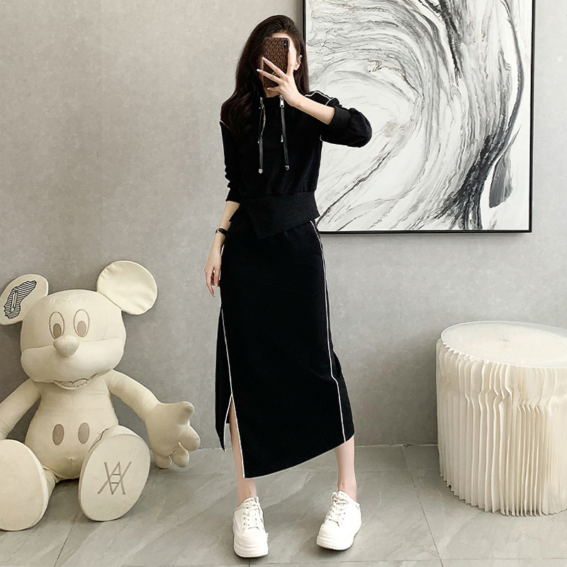 여자의 가을 새로운 패션 서양식 슬림 핏 나이 감소 스플릿 스커트 세트 한국식 웨이스트 짧은 스웨트셔츠 투피스 세트