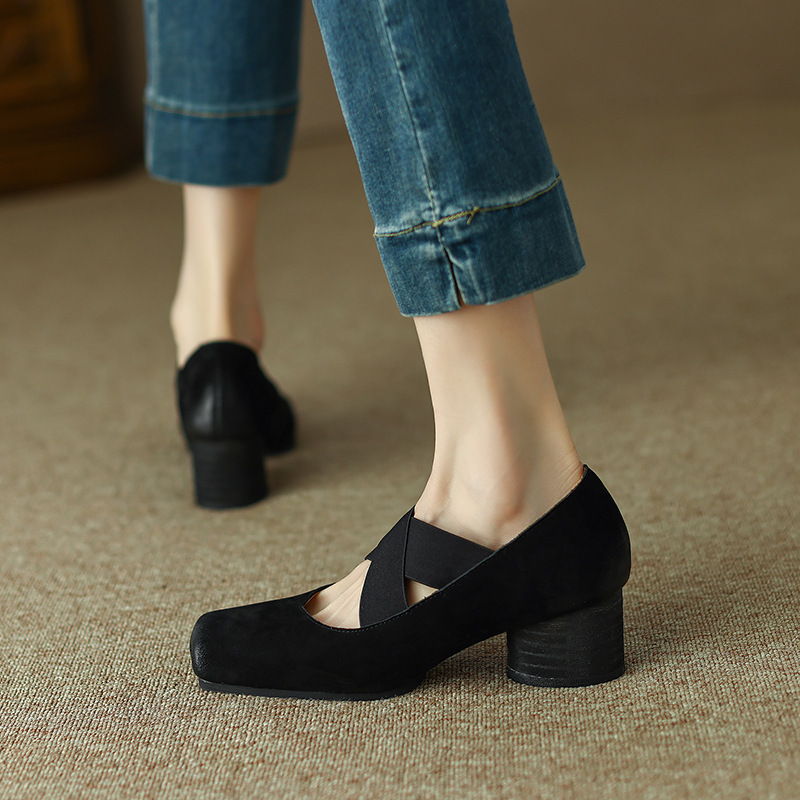 레이어와 돼지 코 신발 소가죽 레트로 오래된 스트랩 메리 제인 신발 스퀘어 토 미들 힐 발레 신발 여성용스토어 가기