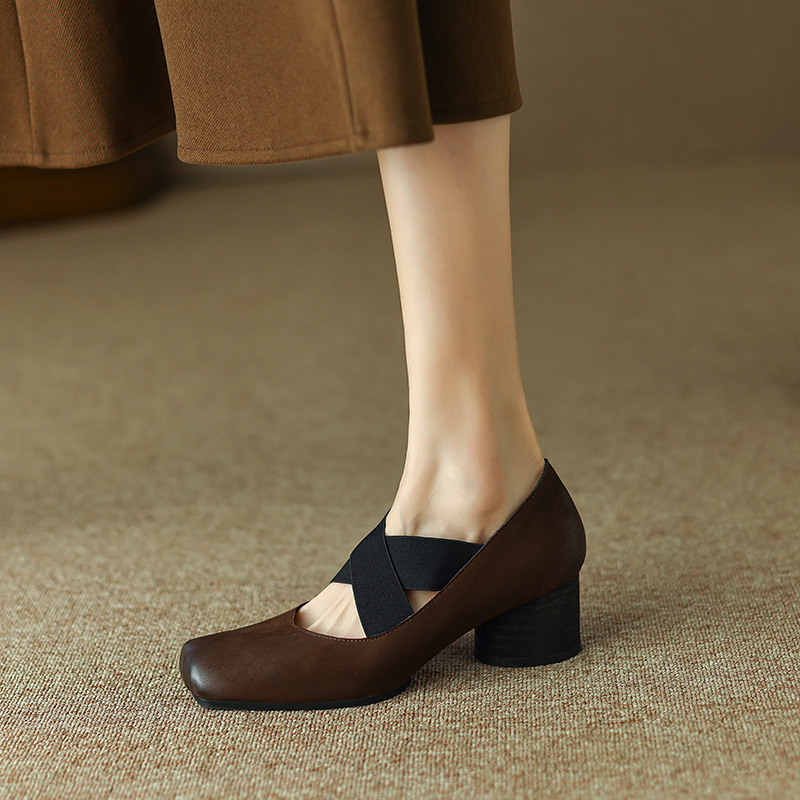 레이어와 돼지 코 신발 소가죽 레트로 오래된 스트랩 메리 제인 신발 스퀘어 토 미들 힐 발레 신발 여성용
