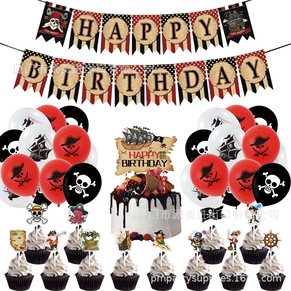 해적 선장 테마 파티 장식 어린이 생일 플래그 케이크 플래그 삽입 라텍스 풍선 레이아웃 세트
