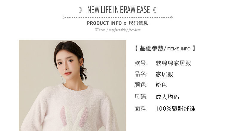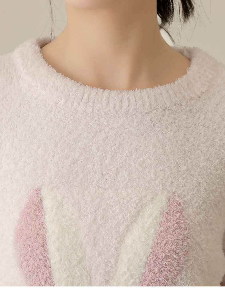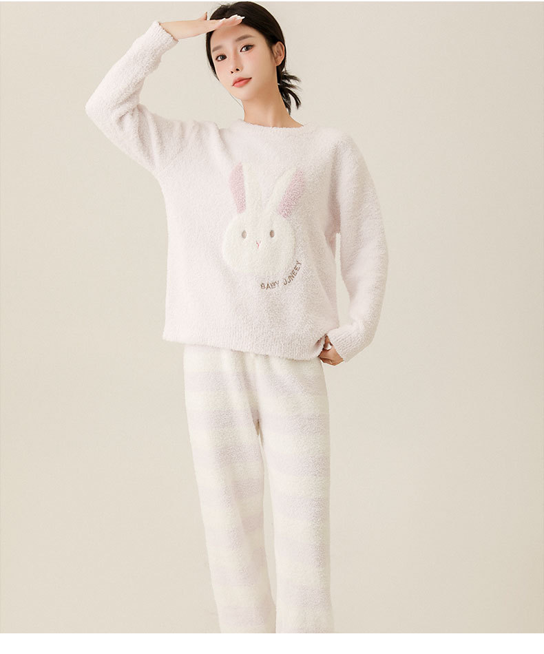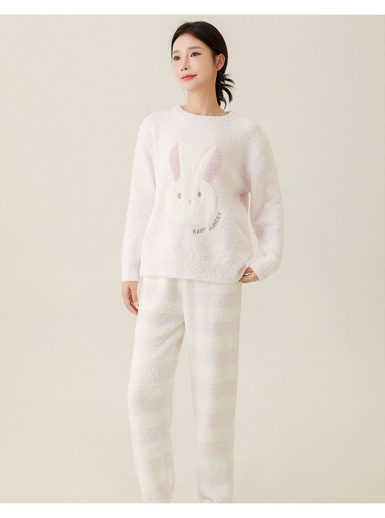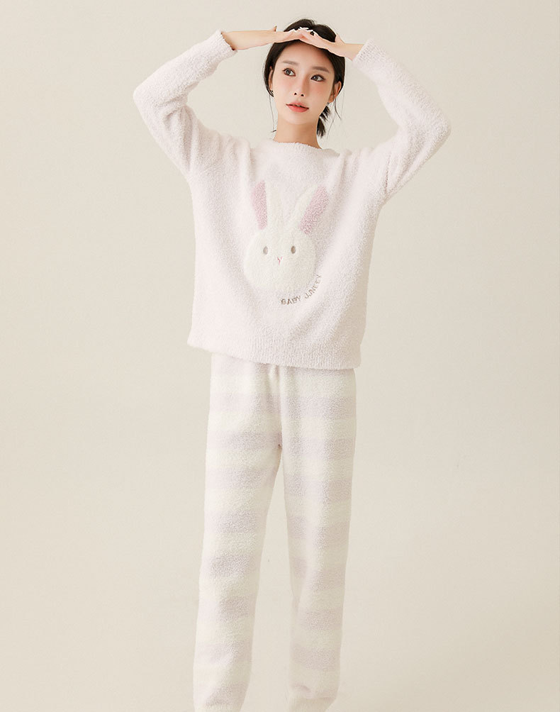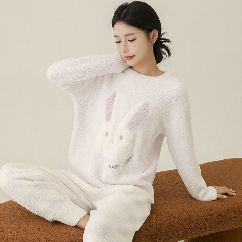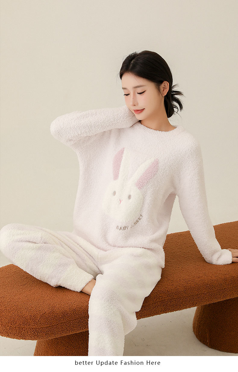 일본식 부드러운 반쪽 벨벳 가을과 겨울 잠옷 여자의 만화 토끼 라운드 넥 기모 두꺼운 따뜻한 겨울 가정 옷