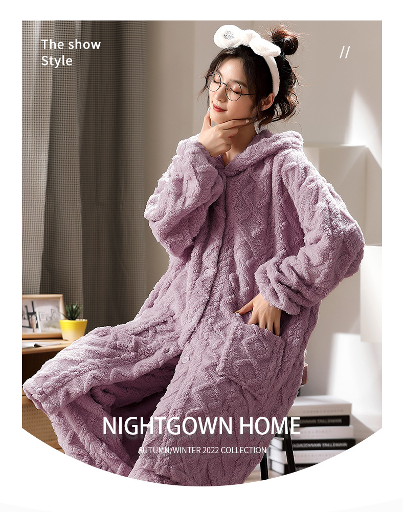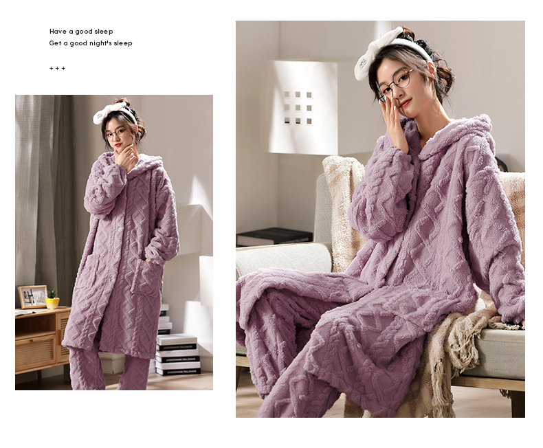 인터넷 인기있는 새로운 아웃웨어 잠옷 여자의 새로운 플란넬 두꺼운 긴 자카드 산호 양털 후드 긴 세트스토어 가기