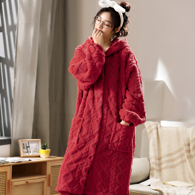 인터넷 인기있는 새로운 아웃웨어 잠옷 여자의 새로운 플란넬 두꺼운 긴 자카드 산호 양털 후드 긴 세트