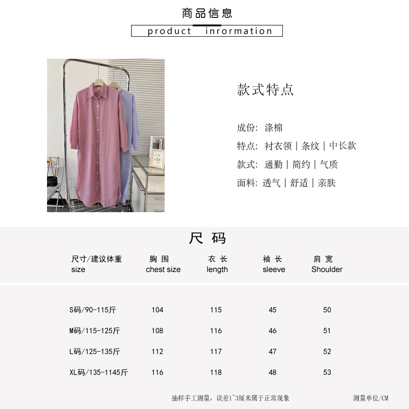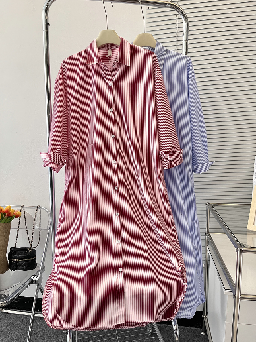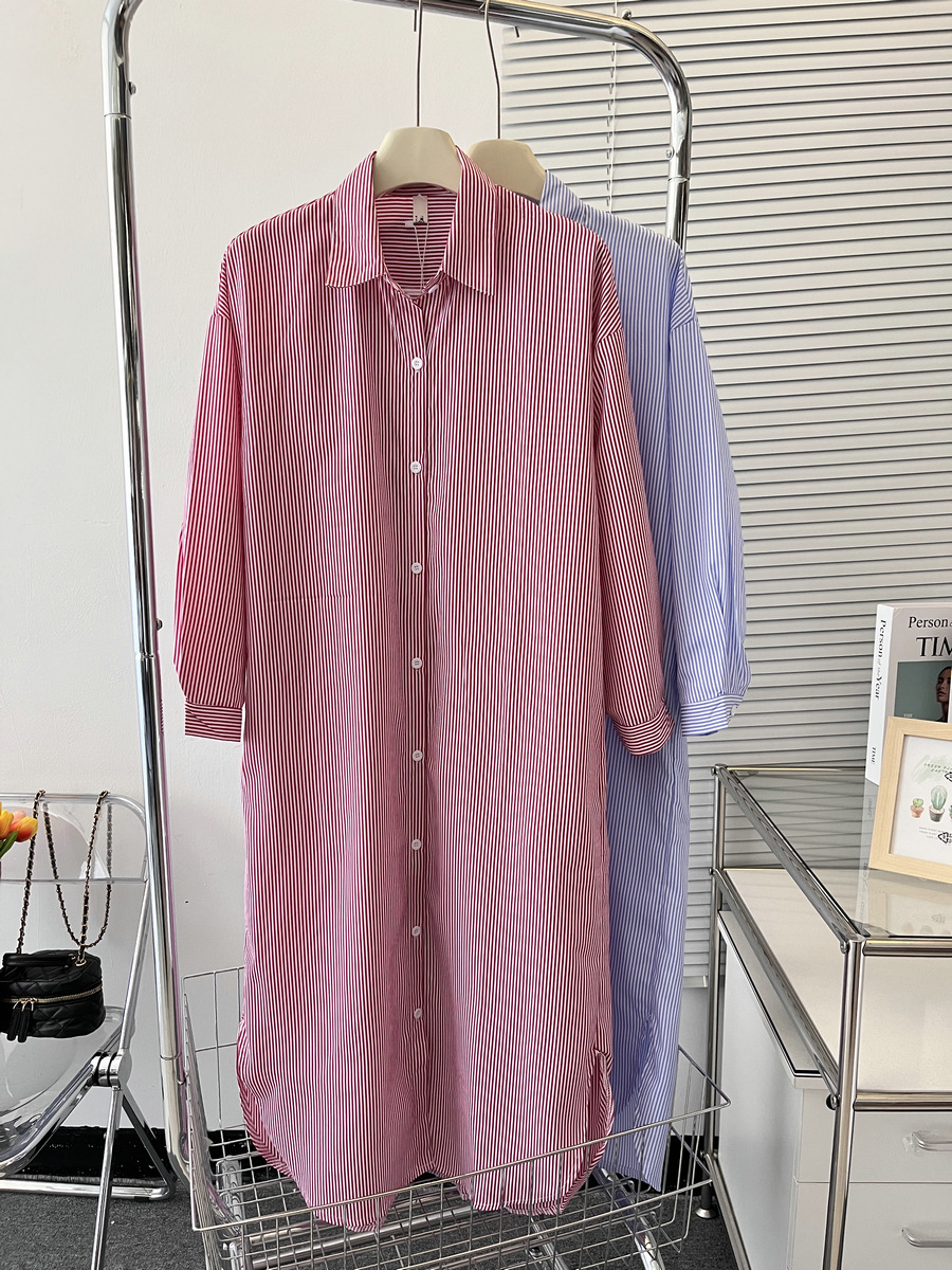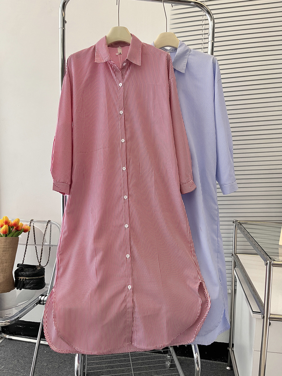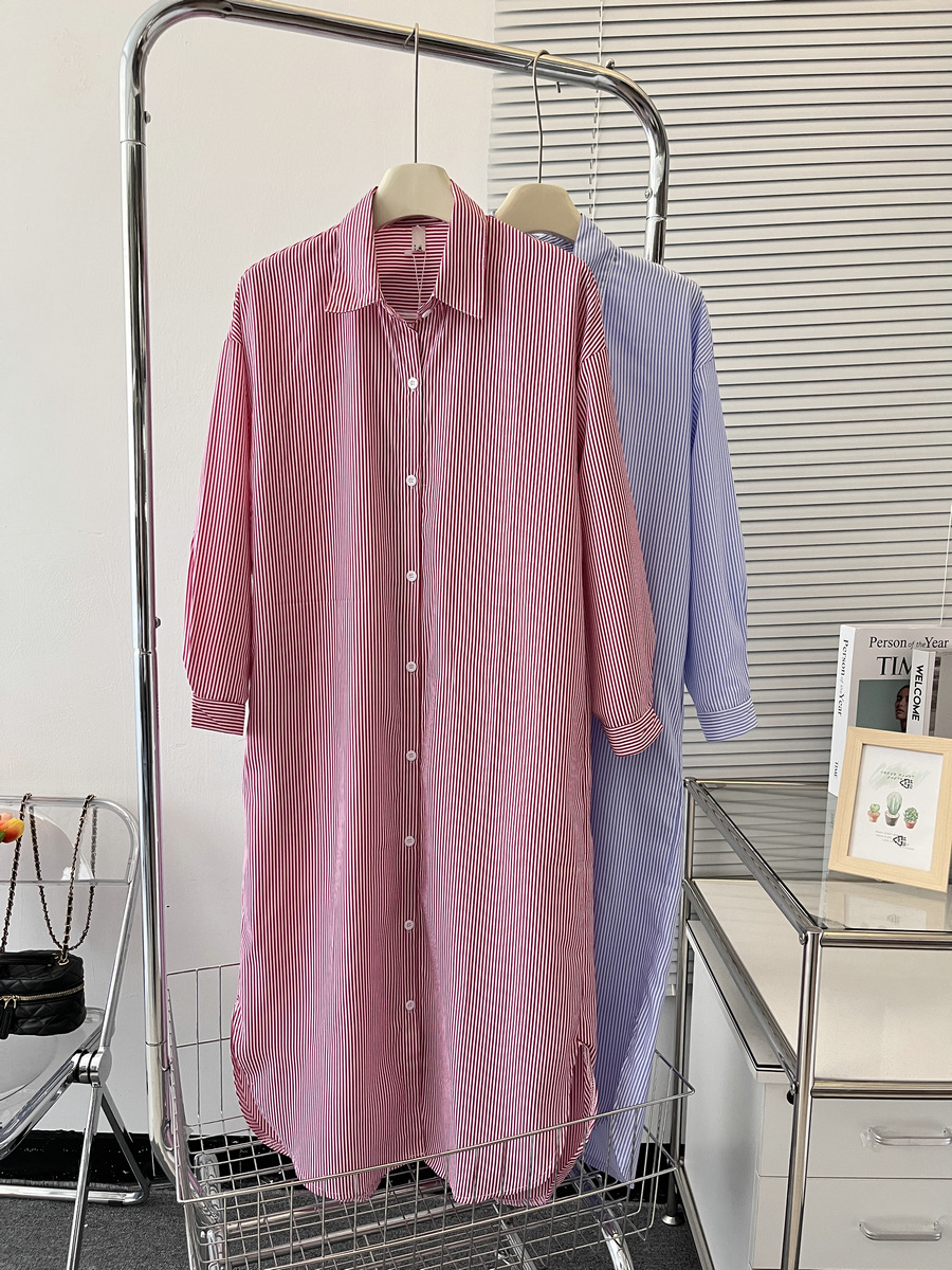 품질 봄과 가을 스트라이프 셔츠 원피스 여자의 긴 소매 디자인 감각 틈새 웨스턴 스타일 느슨한 슈퍼 긴 무릎 위 대형 에디션