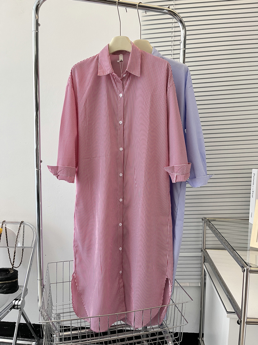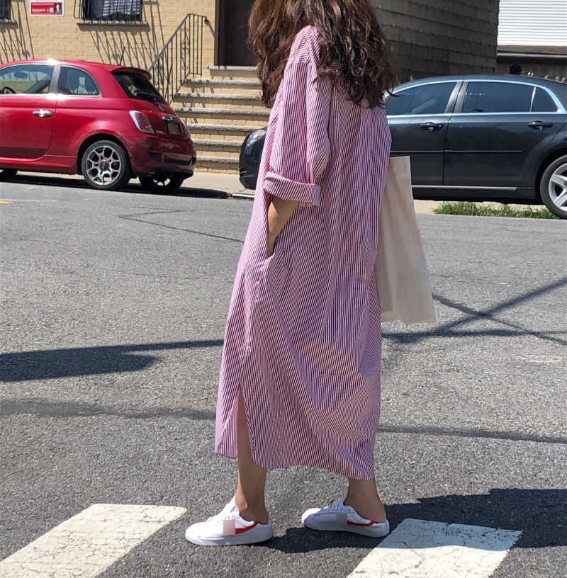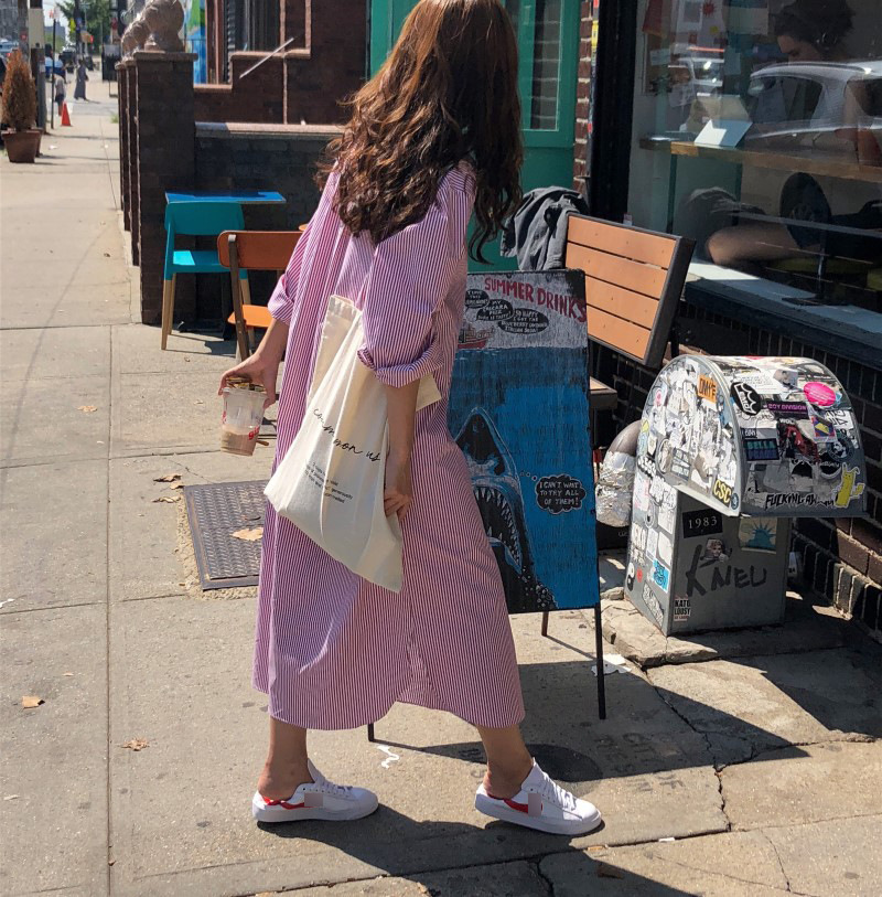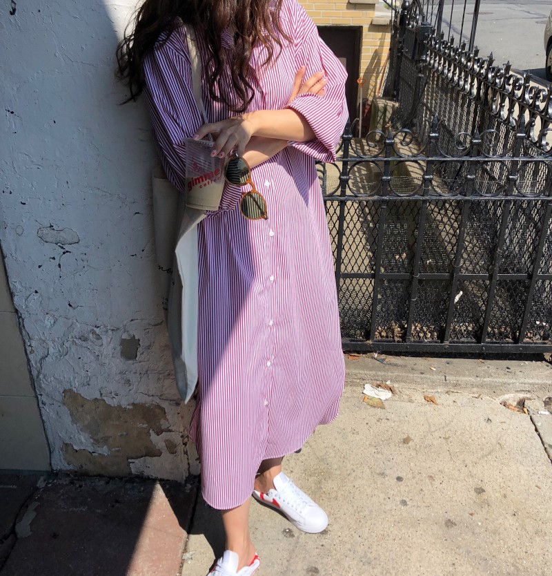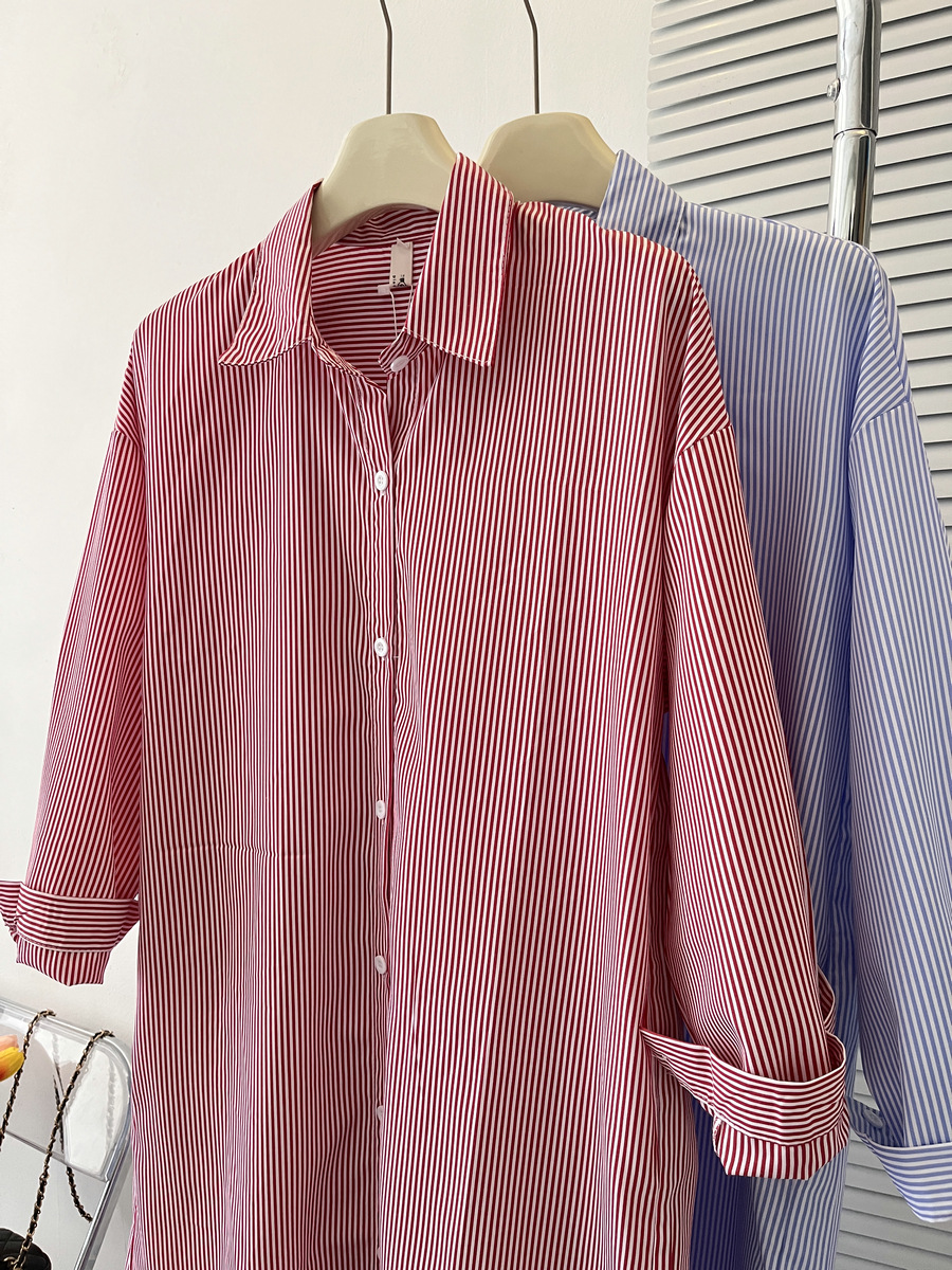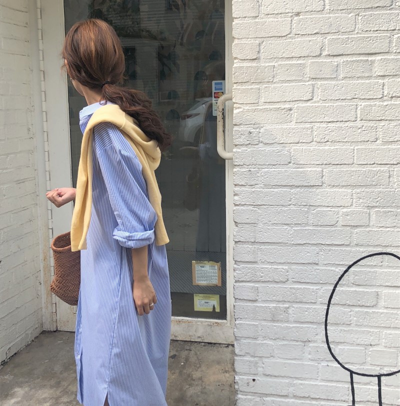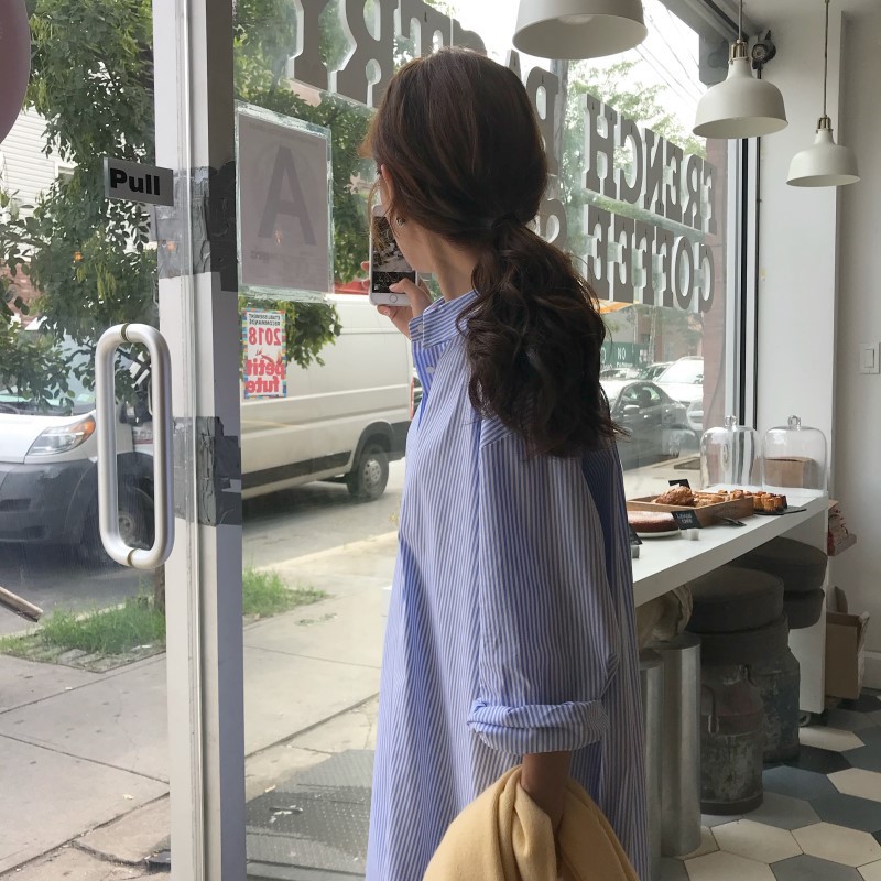 품질 봄과 가을 스트라이프 셔츠 원피스 여자의 긴 소매 디자인 감각 틈새 웨스턴 스타일 느슨한 슈퍼 긴 무릎 위 대형 에디션스토어 가기
