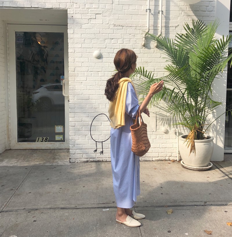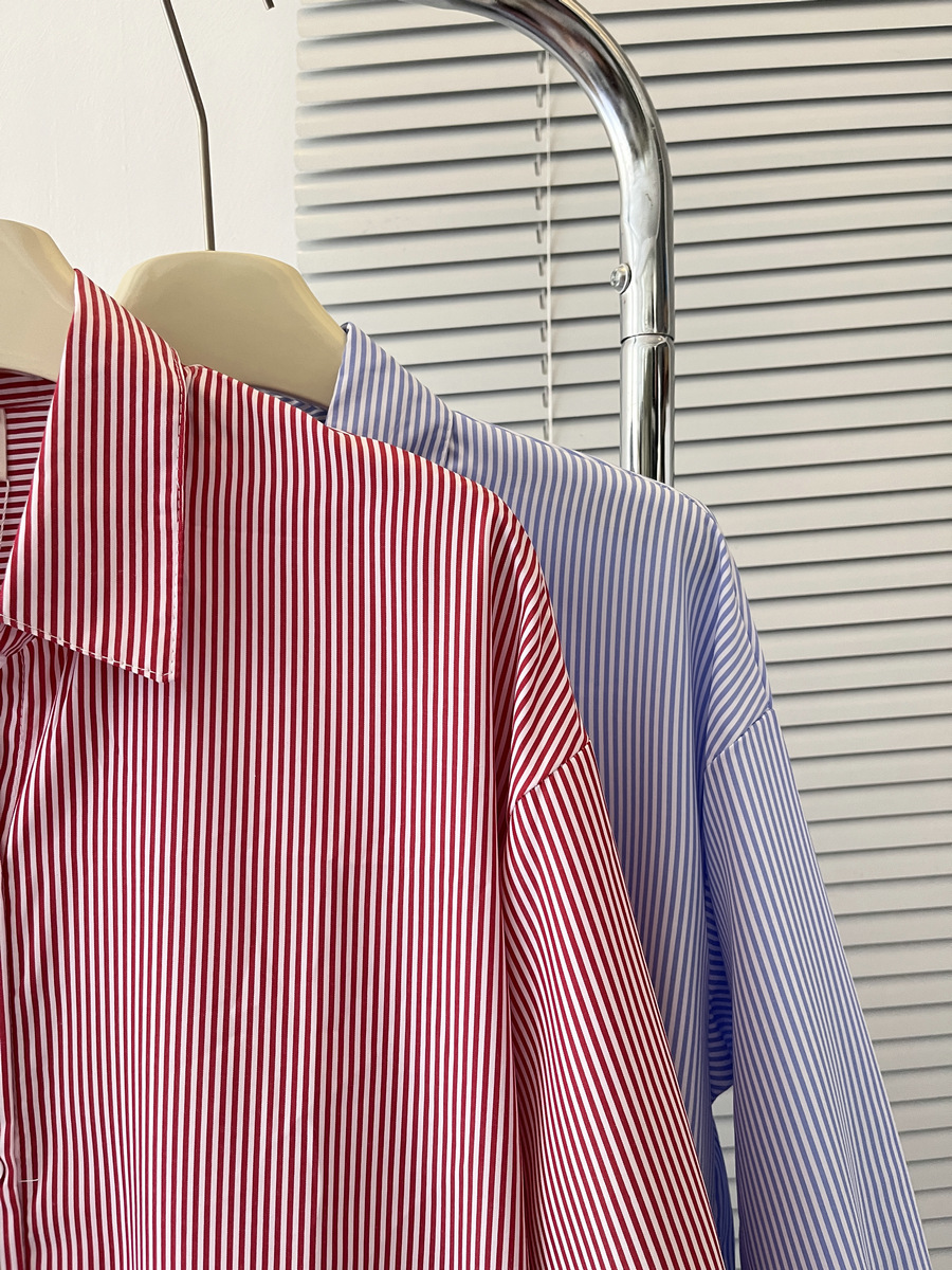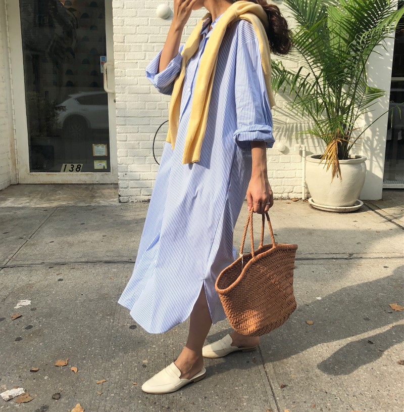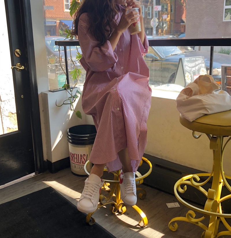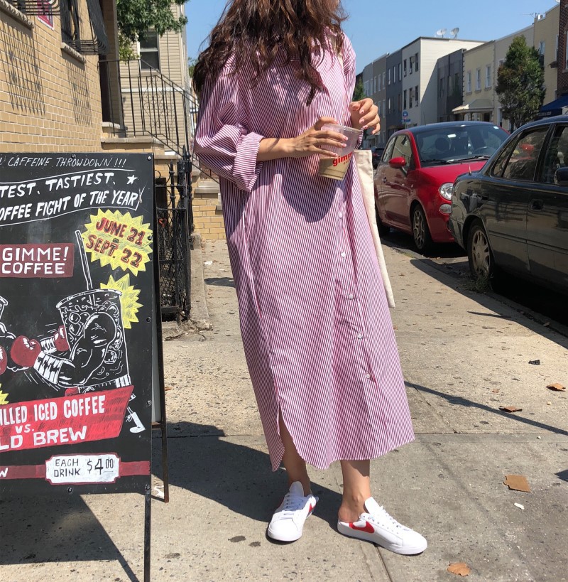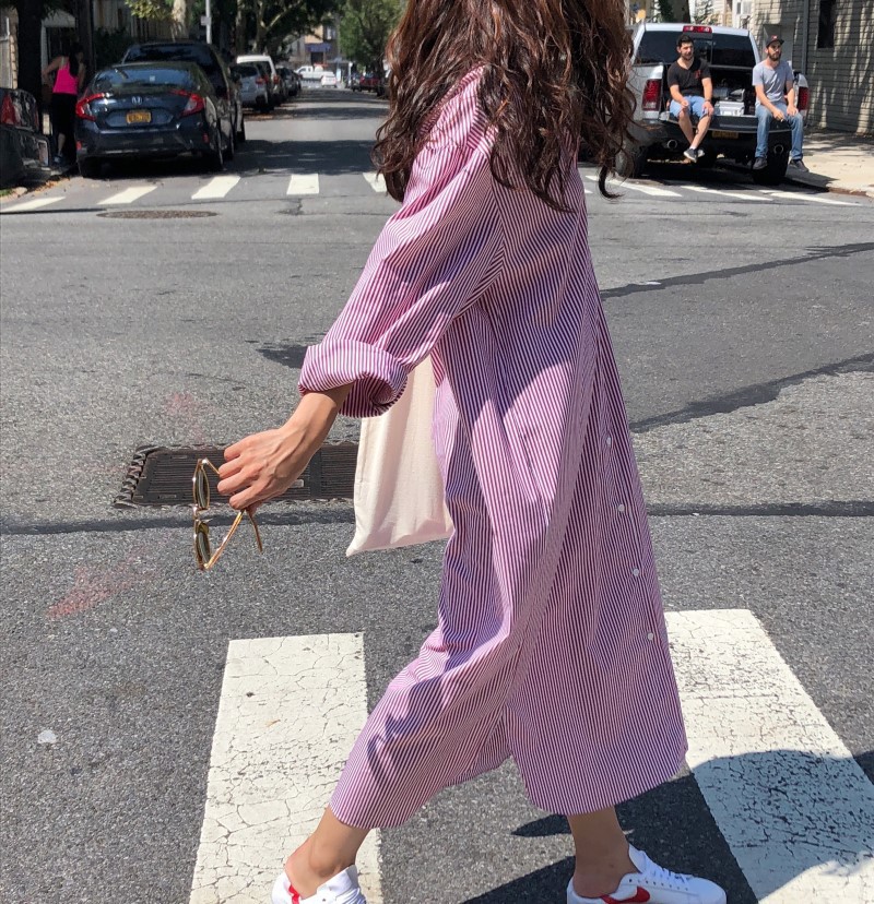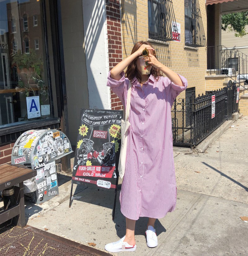 품질 봄과 가을 스트라이프 셔츠 원피스 여자의 긴 소매 디자인 감각 틈새 웨스턴 스타일 느슨한 슈퍼 긴 무릎 위 대형 에디션스토어 가기