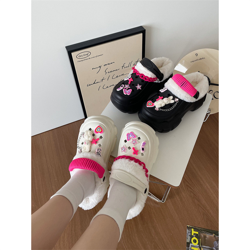 두꺼운 밑창 높이 기모 따뜻한 구멍 신발 여성 가을과 겨울 2023 귀여운 만화 똥 느낌면 슬리퍼스토어 가기