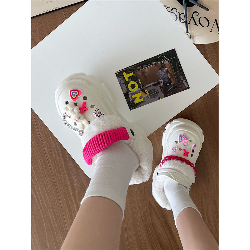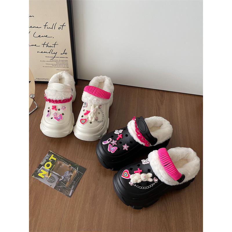 두꺼운 밑창 높이 기모 따뜻한 구멍 신발 여성 가을과 겨울 2023 귀여운 만화 똥 느낌면 슬리퍼