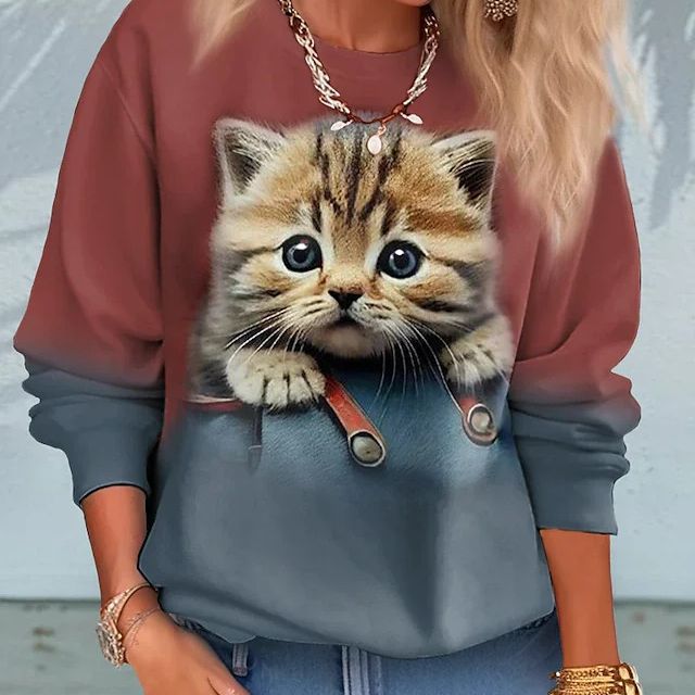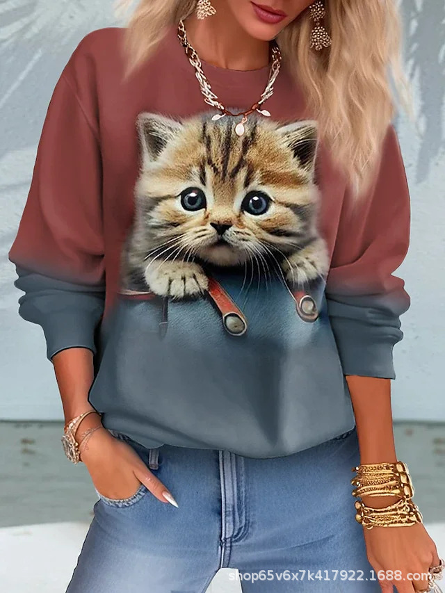 2023 새로운 국경 대외 무역 유럽과 미국 여성 의류 재고 디지털 인쇄 고양이 둥근 목 긴 소매 여성용 스웨터 도매스토어 가기