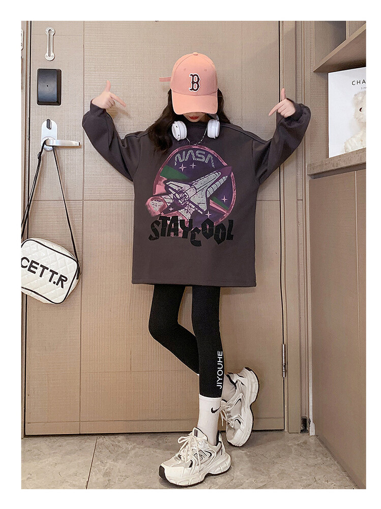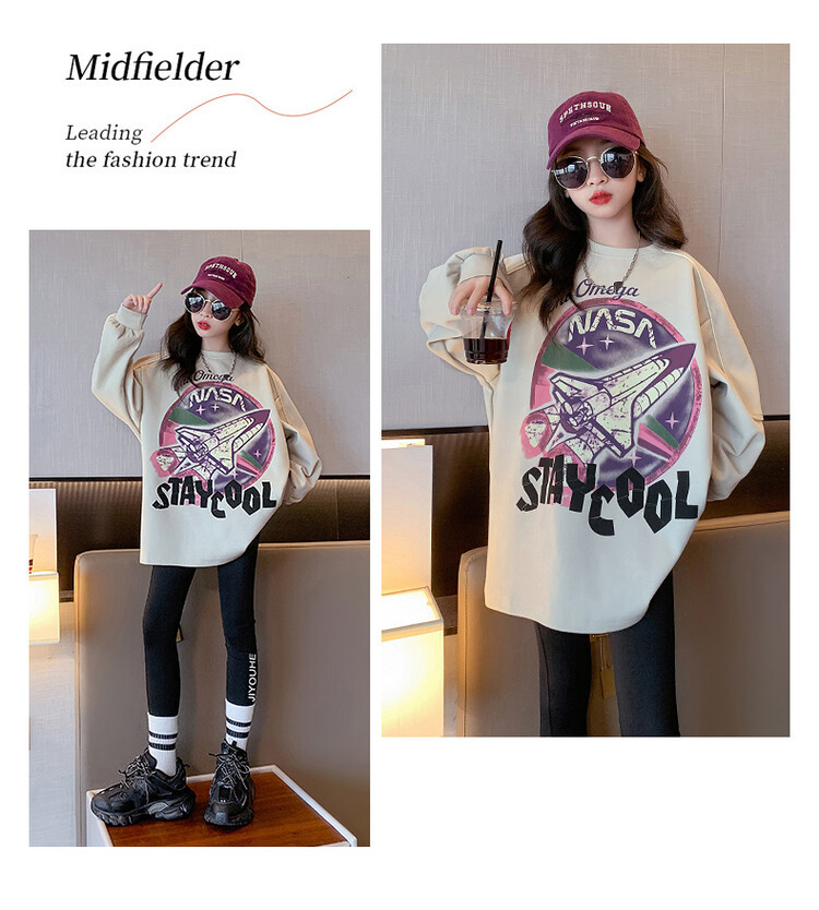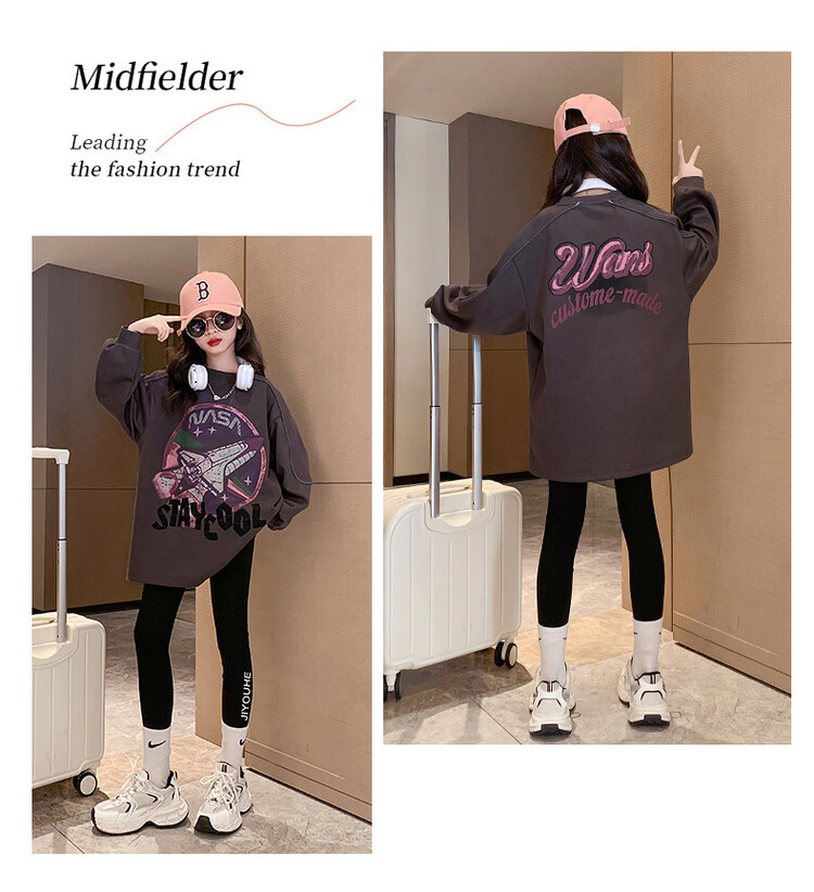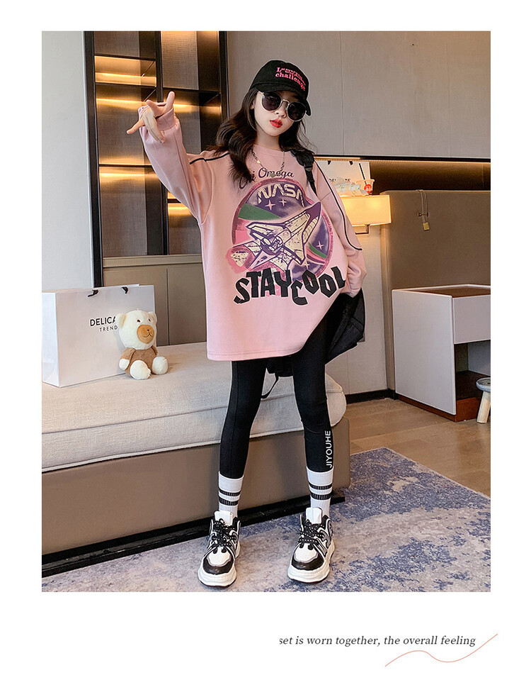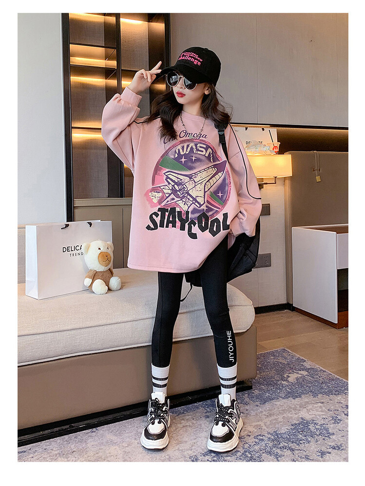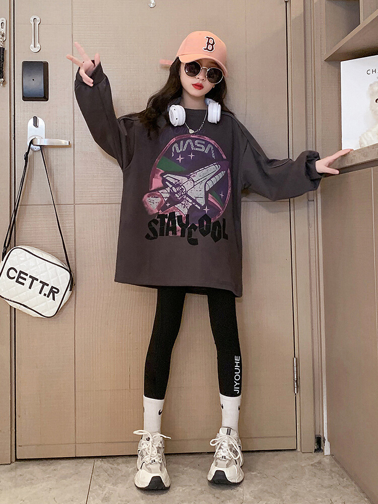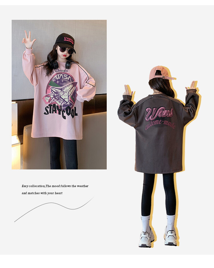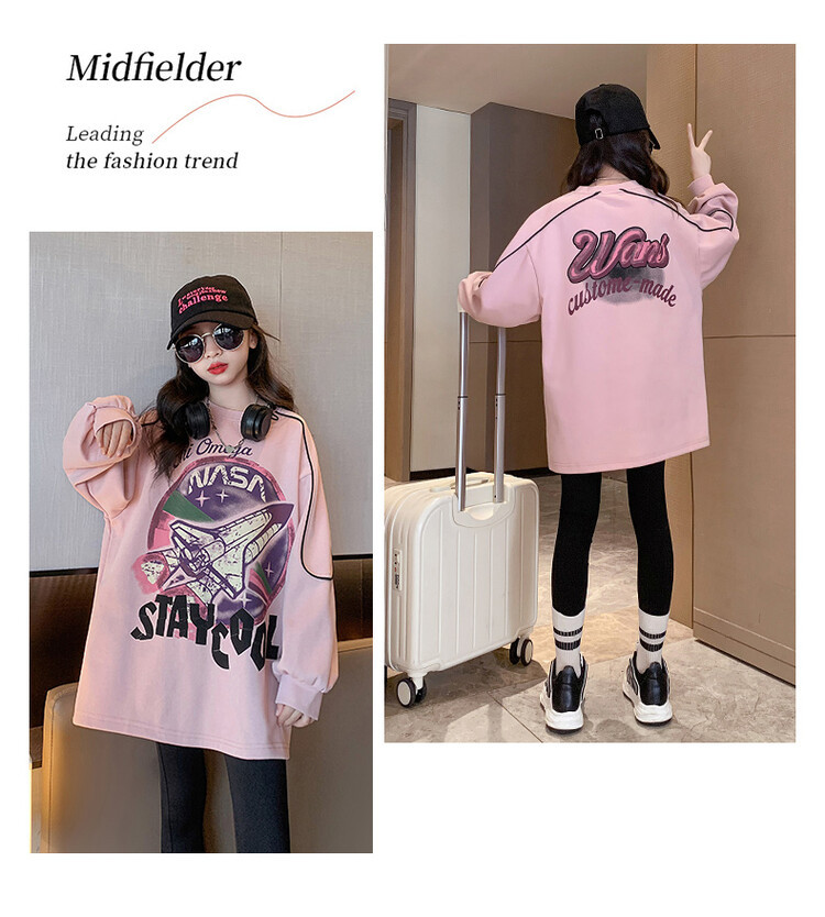 여아 한국식 스웨트 원피스 2023 봄 가을 어린이 중간 길이 루즈한 캐주얼 티셔츠 인터넷 연예인 큰 아동복