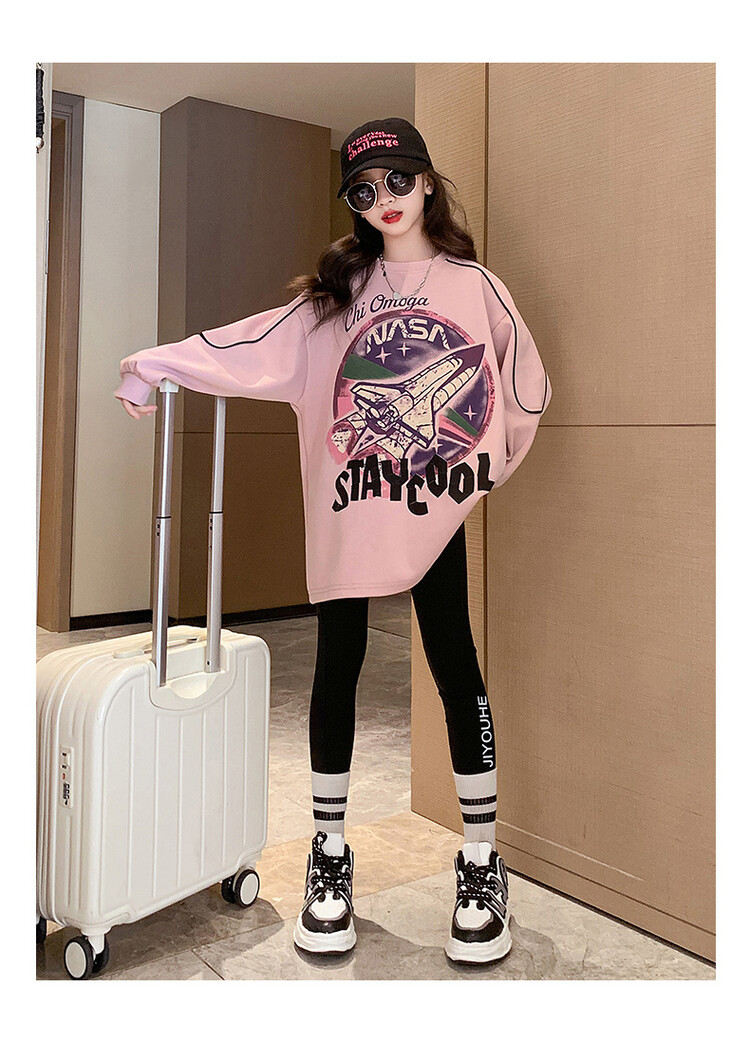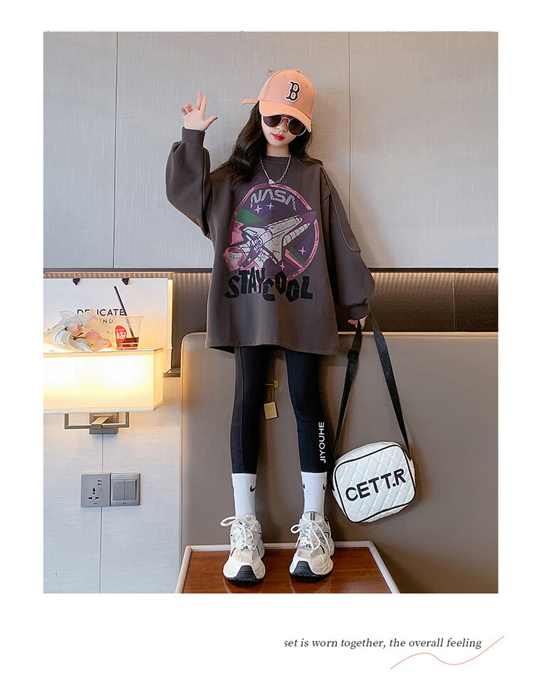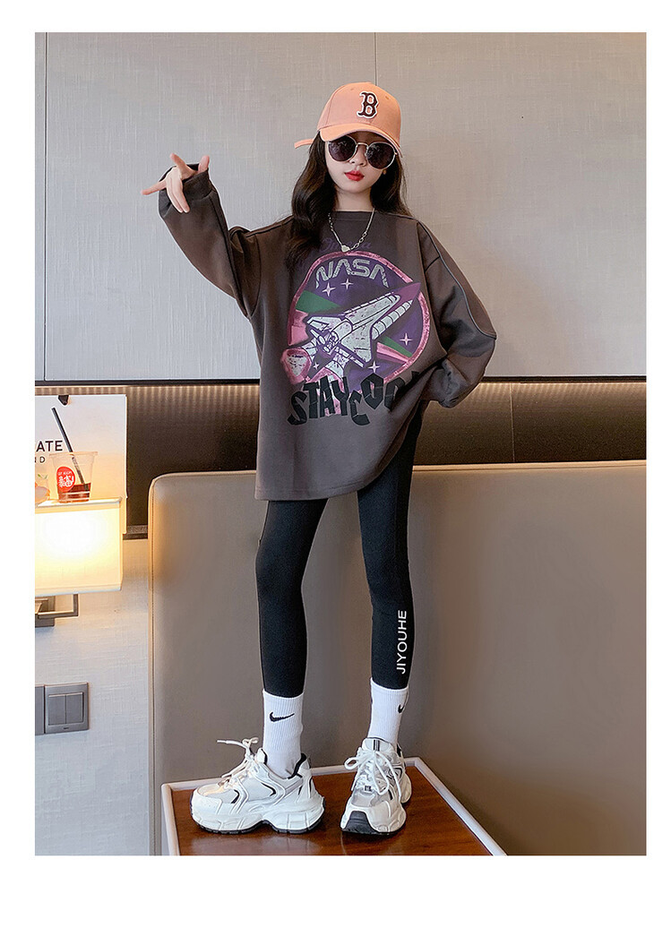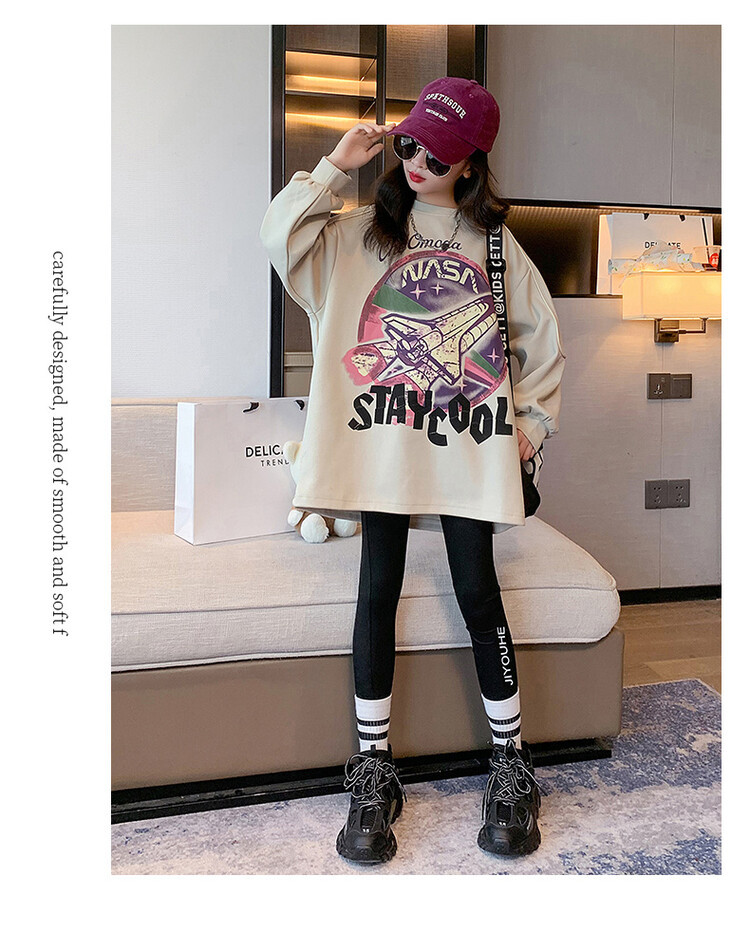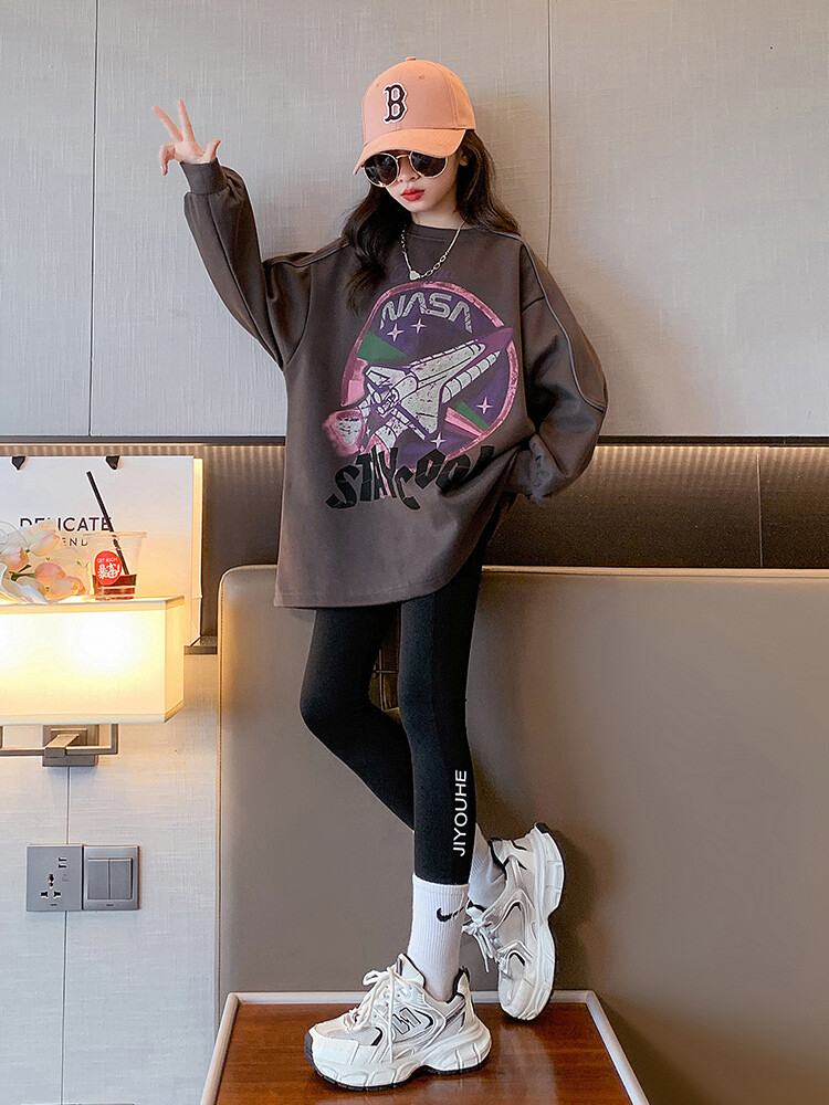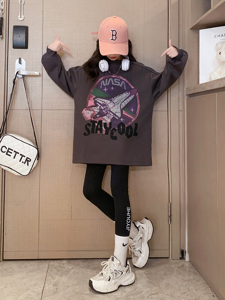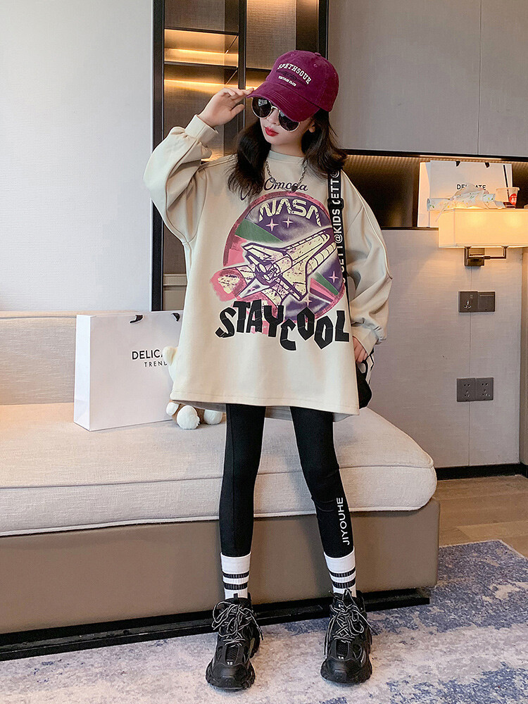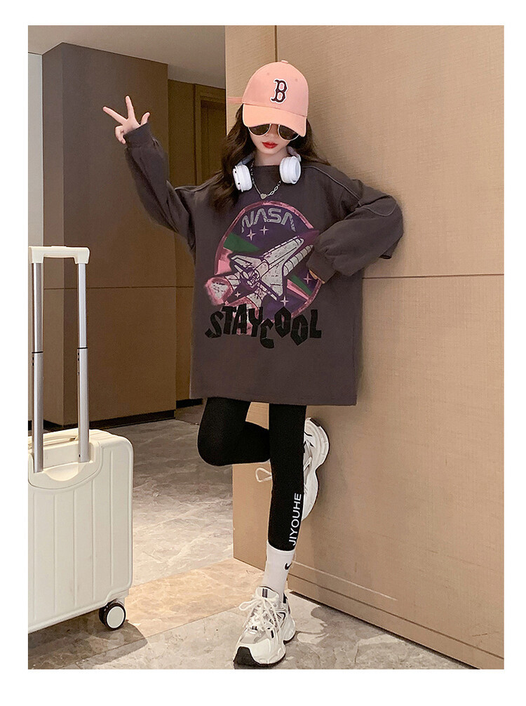 여아 한국식 스웨트 원피스 2023 봄 가을 어린이 중간 길이 루즈한 캐주얼 티셔츠 인터넷 연예인 큰 아동복