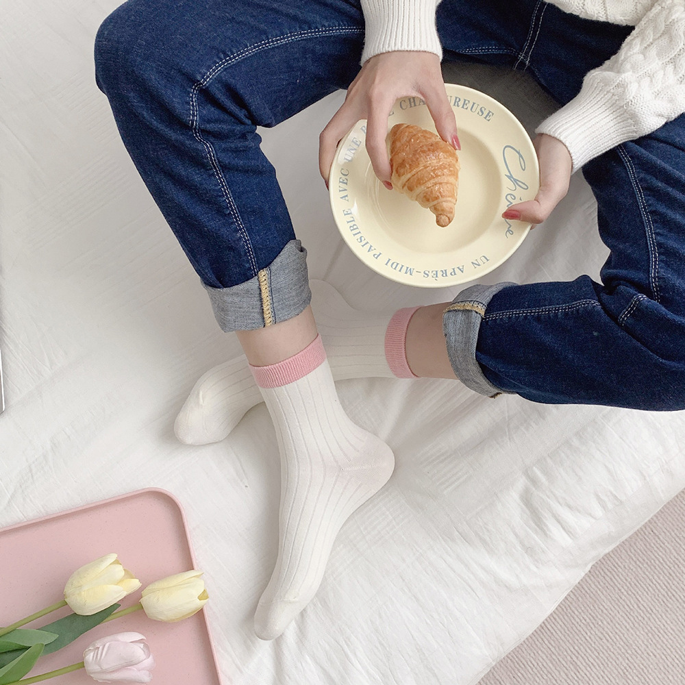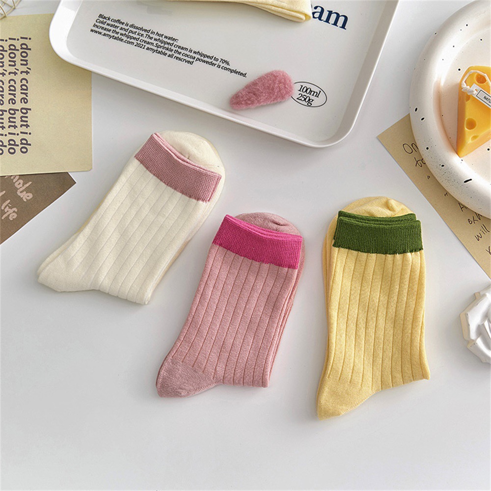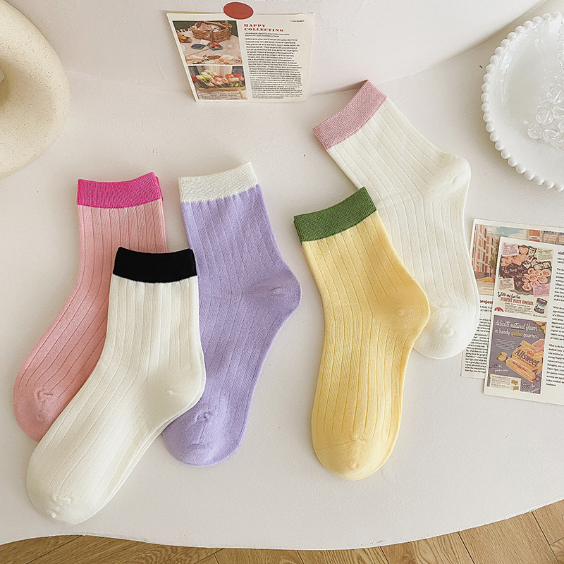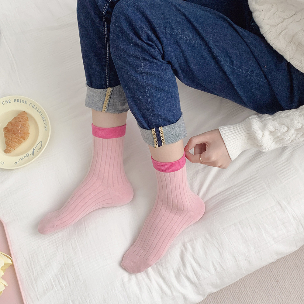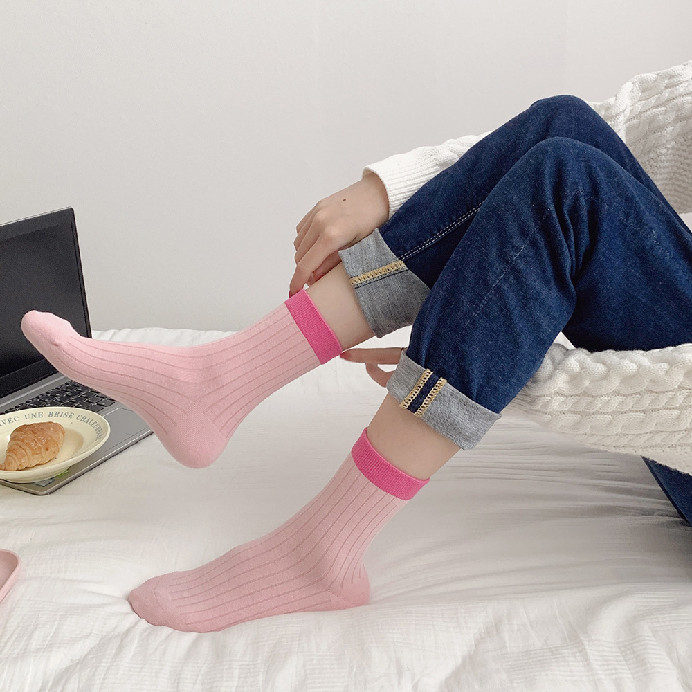 多巴胺袜子女中筒袜早秋新款抽条拼色女袜糖果色ins潮撞色堆堆袜