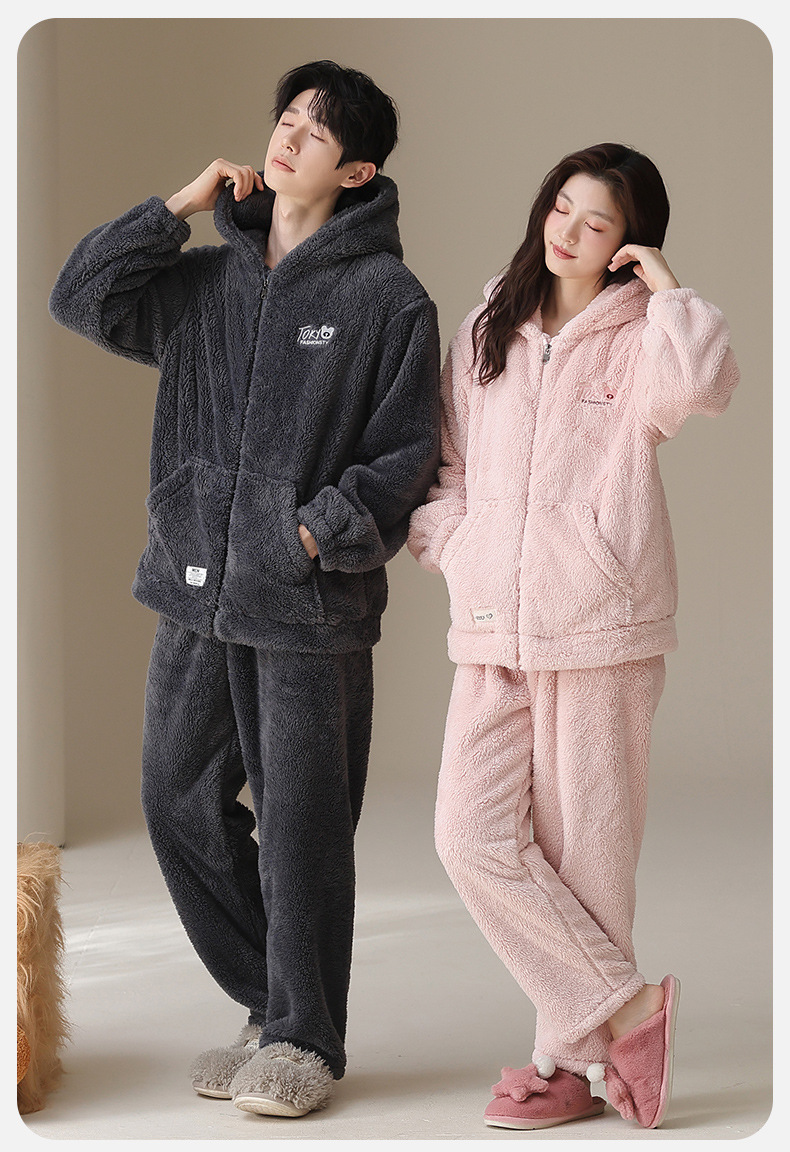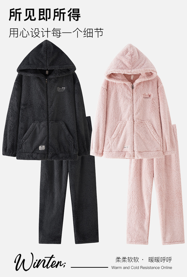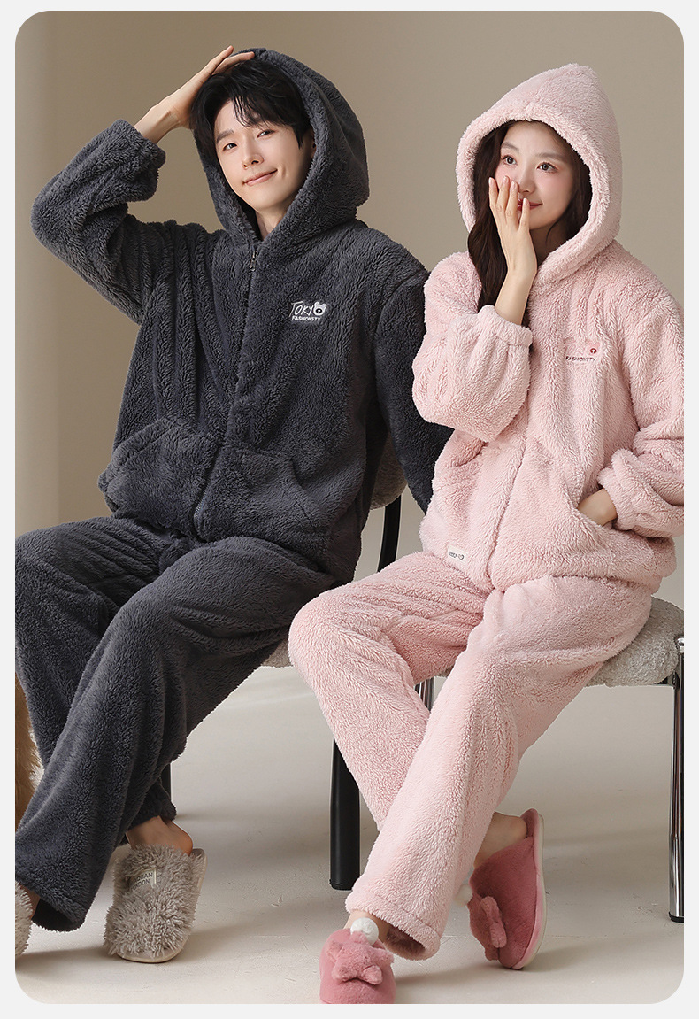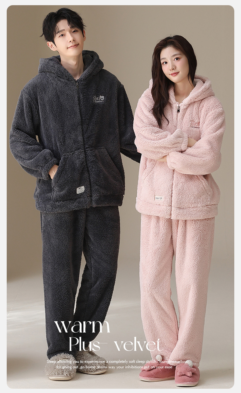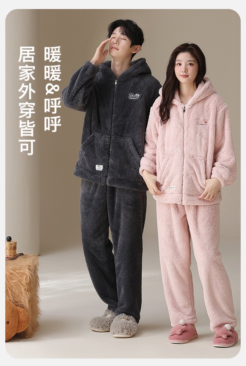 긴털 커플 잠옷 여성용 겨울용 플러스 벨벳 두꺼운 세트 캐주얼 지퍼 후드 외출 가능 남성용 홈웨어 세트