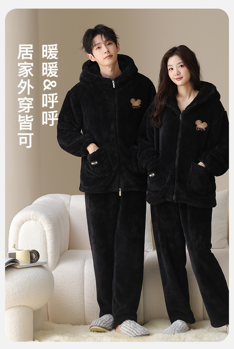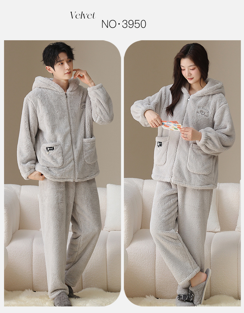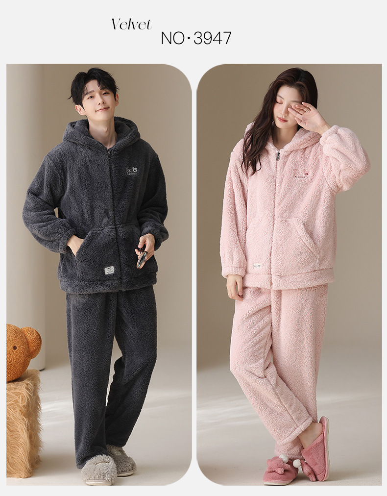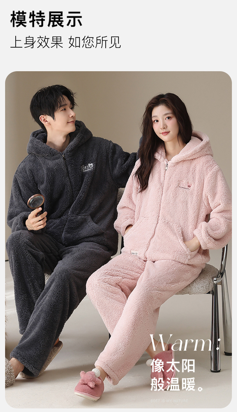 긴털 커플 잠옷 여성용 겨울용 플러스 벨벳 두꺼운 세트 캐주얼 지퍼 후드 외출 가능 남성용 홈웨어 세트