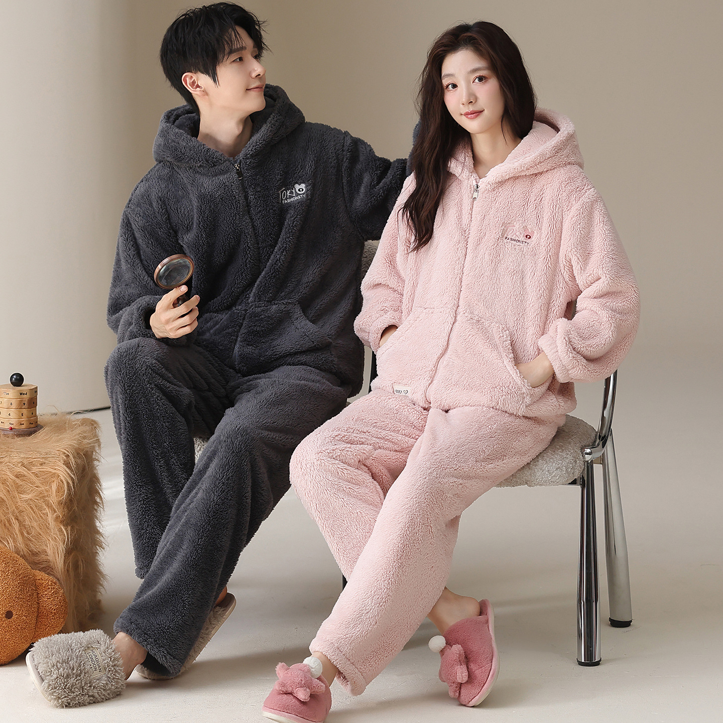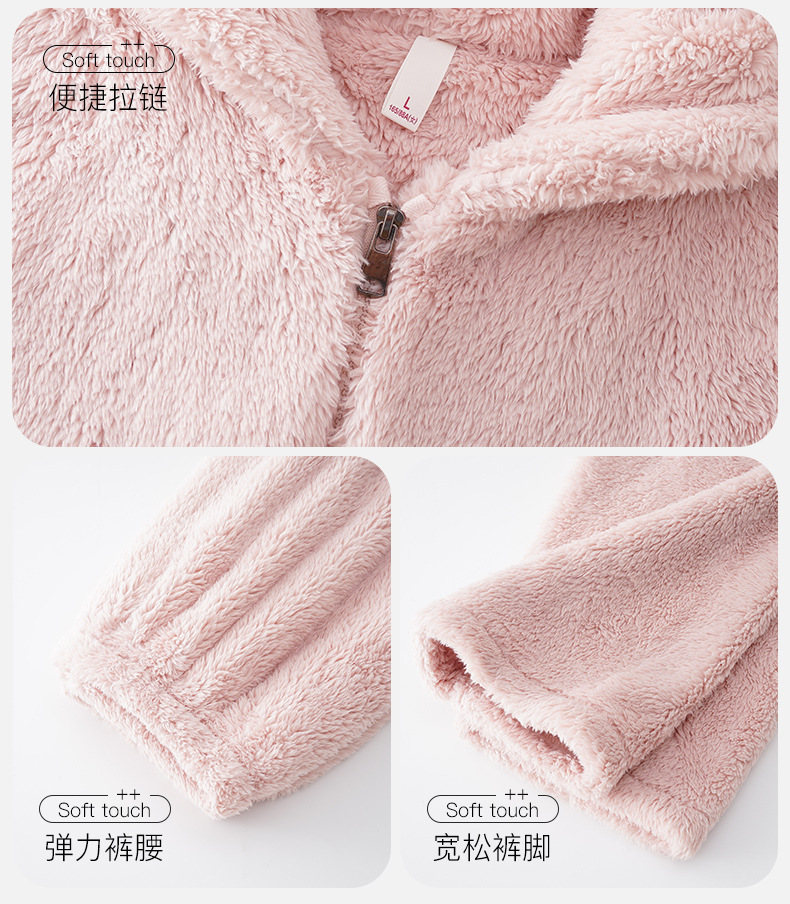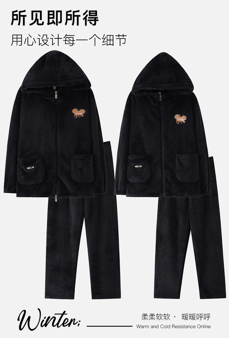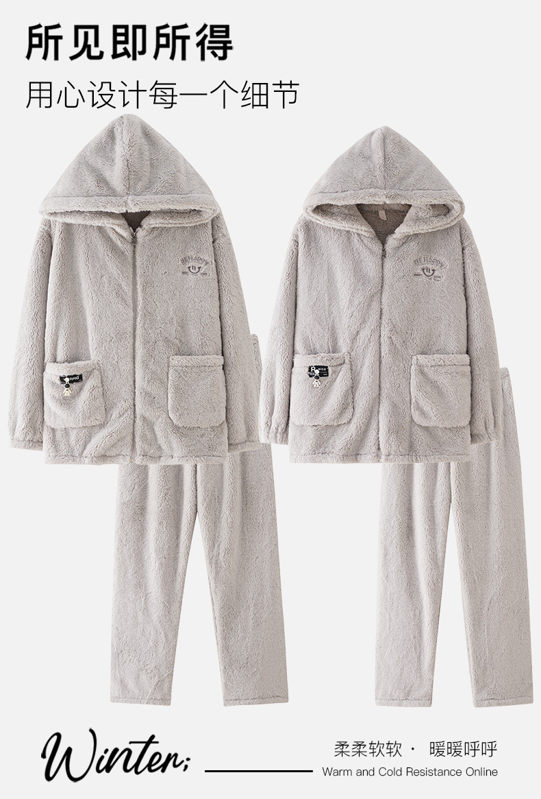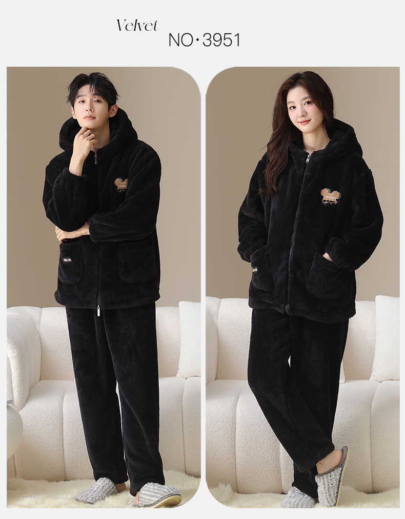 긴털 커플 잠옷 여성용 겨울용 플러스 벨벳 두꺼운 세트 캐주얼 지퍼 후드 외출 가능 남성용 홈웨어 세트