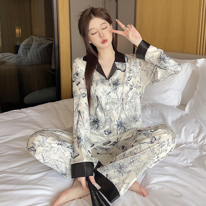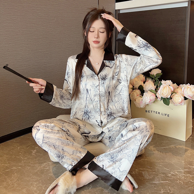 여성 잠옷 실크 가디건 한국식 잉크 나비 옷깃 긴 소매 바지 투피스 의상 가정복