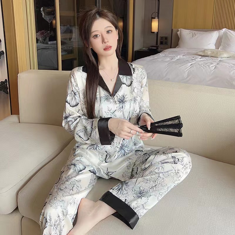 여성 잠옷 실크 가디건 한국식 잉크 나비 옷깃 긴 소매 바지 투피스 의상 가정복스토어 가기