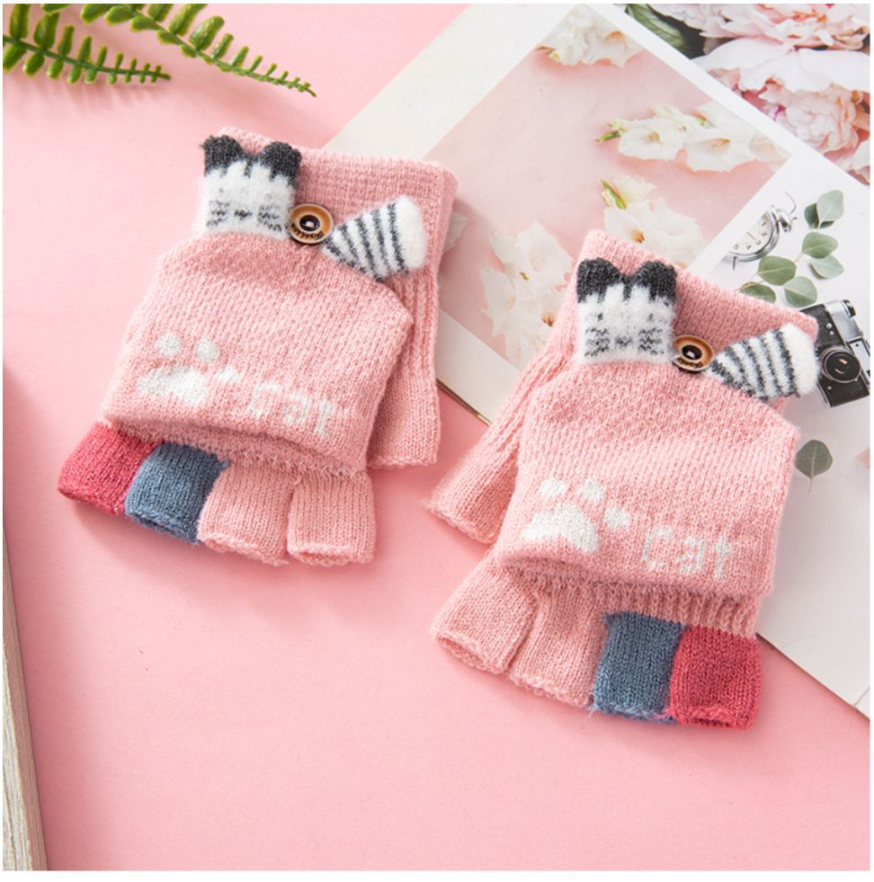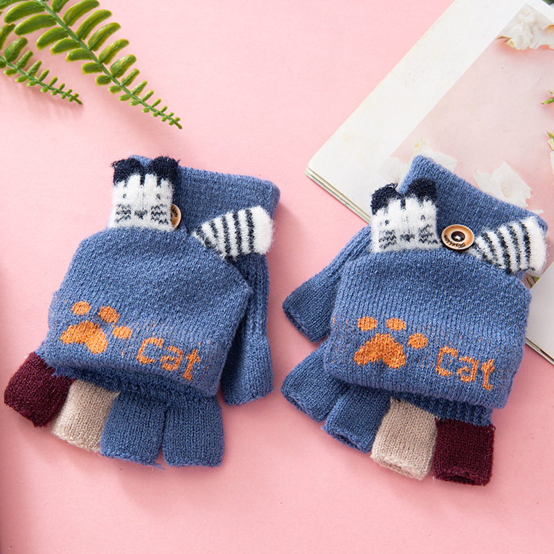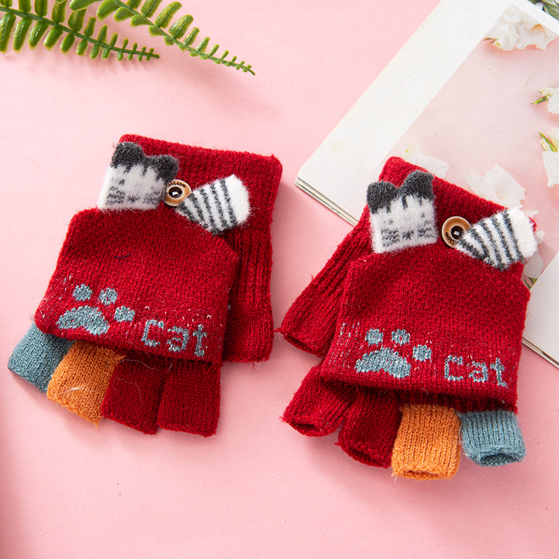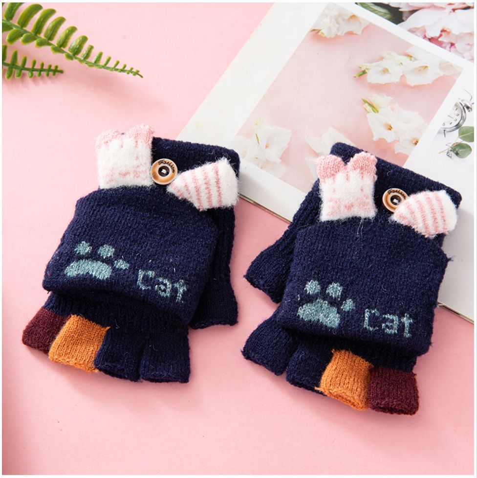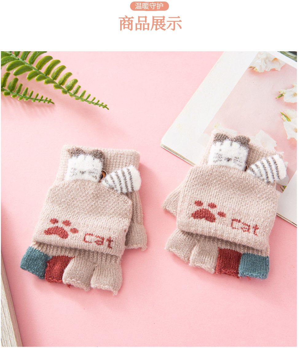 어린이 장갑 여성용 겨울 방한 따뜻한 플립 온 반 손가락 장갑 만화 귀여운 초등학생 쓰기 니트 장갑스토어 가기
