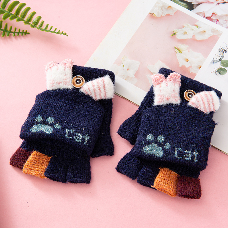 어린이 장갑 여성용 겨울 방한 따뜻한 플립 온 반 손가락 장갑 만화 귀여운 초등학생 쓰기 니트 장갑
