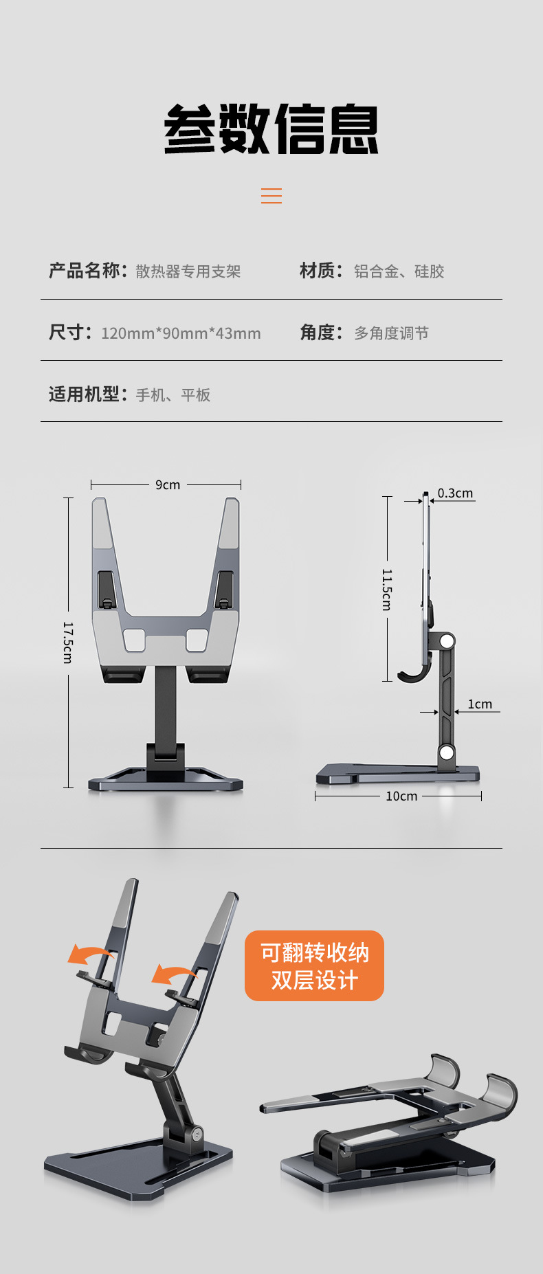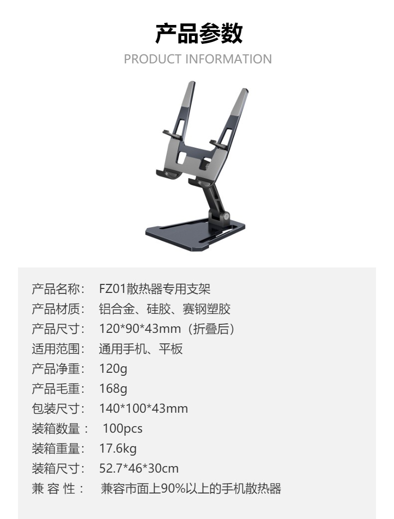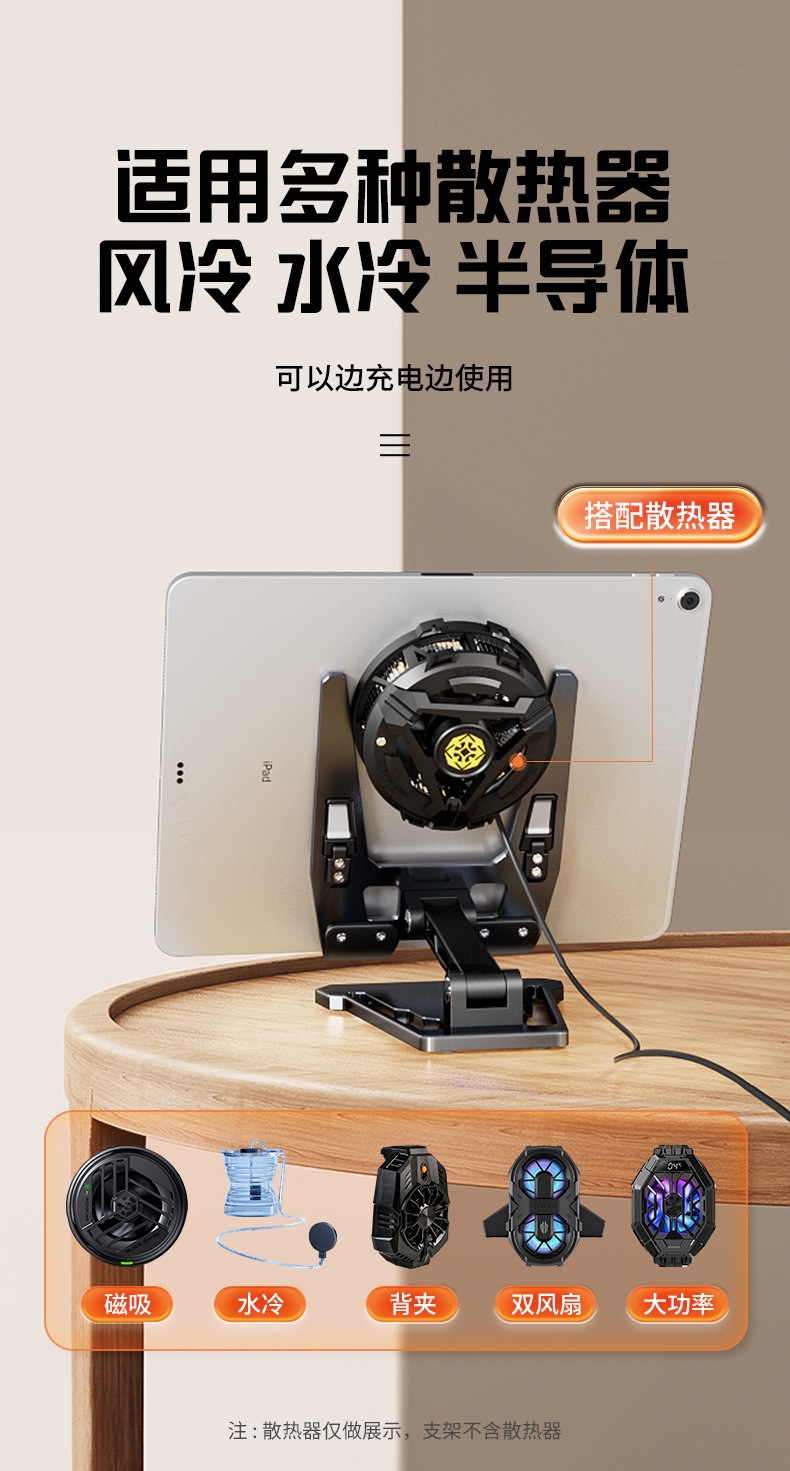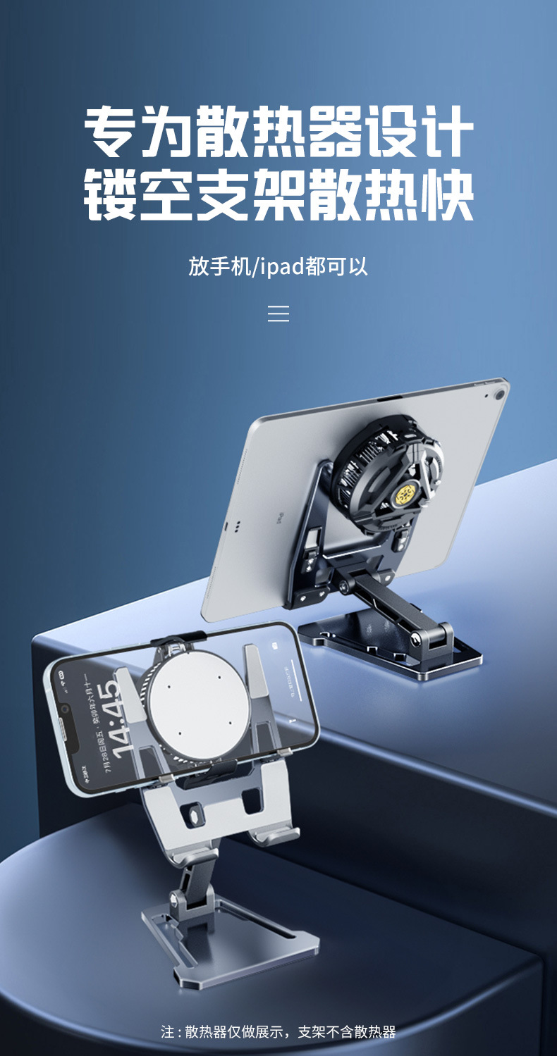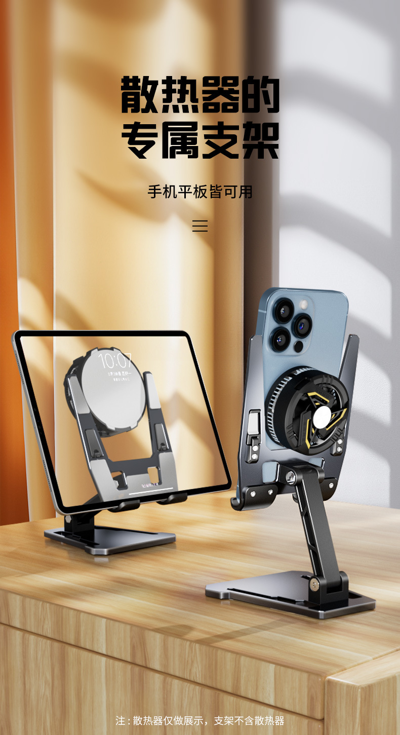 产品特色:散热器的专用支架,在使用手机散热器的同时,可将手机放置在支架上;兼容市面上90%的手机散热器,横屏竖屏,想怎么放,就怎么放;看电视可解放双手,玩游戏可支撑手机+散热器带来的重力感;实用性广泛的一款创意桌面支架。